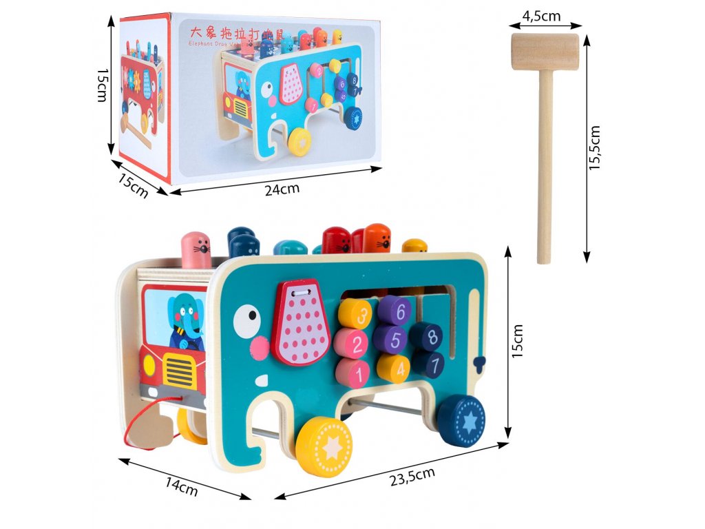 Doris dřevěná edukační kostka se zatloukačkou je ideální hračkou pro rozvoj koordinace oko-ruka, manuální zručnosti, motoriky a rozpoznávání barev. V horní části je umístěno zatloukání krtků, kdy zatlučením jednoho se další vysune. Modrá strana má číselné bludiště, červená strana je vybavena ozubenými kolečky. V předu je šňůrka pro tažení hračky. Hračka je určena pro děti od 36 měsíců věku.