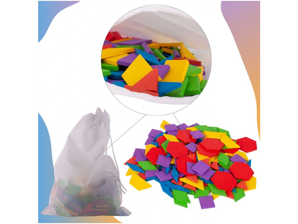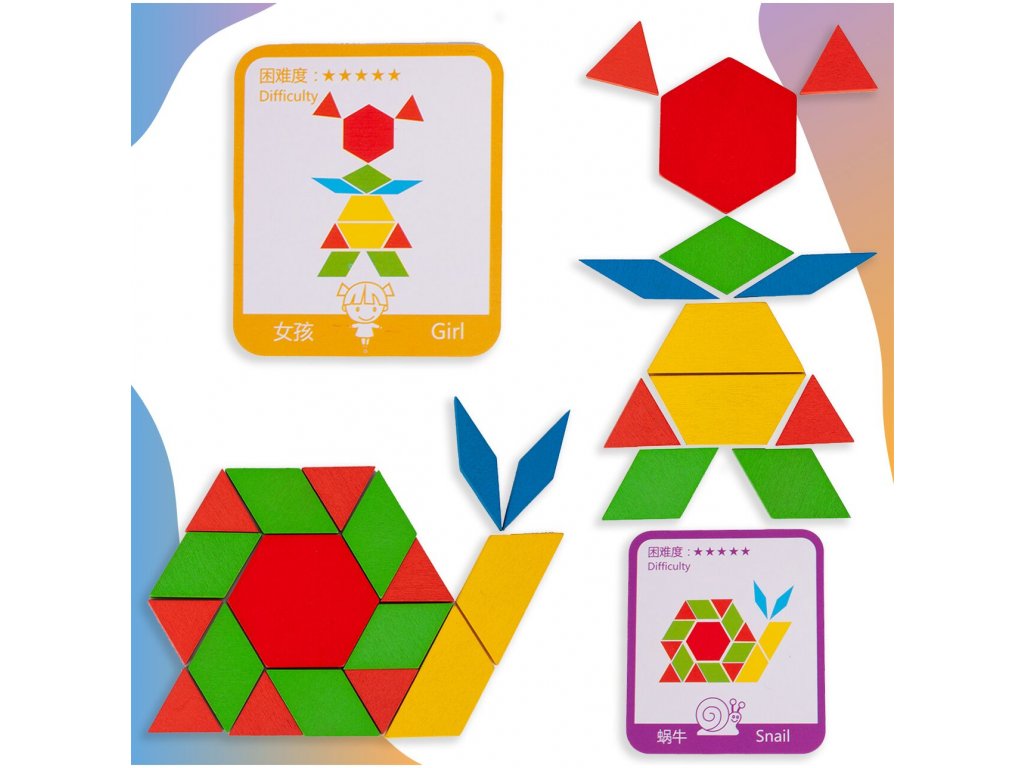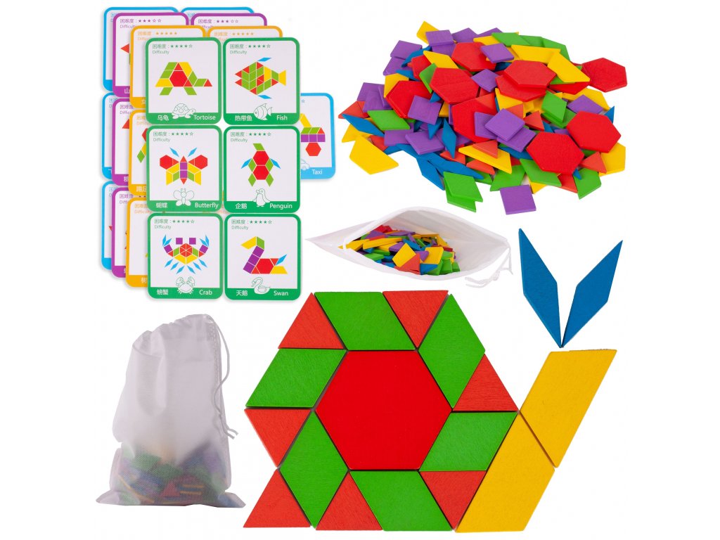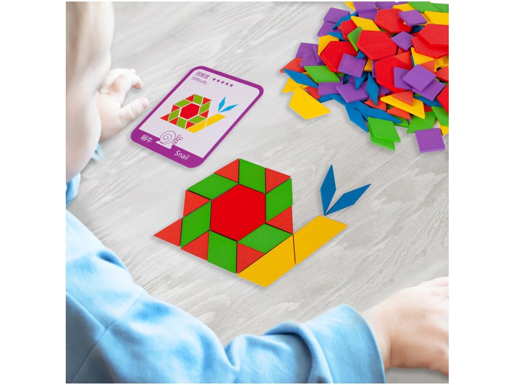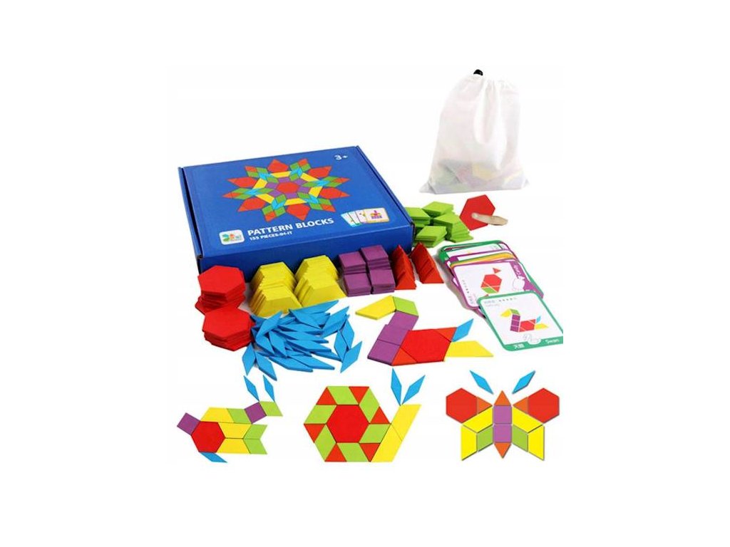 Dřevěné puzzle pro děti Pattern Blocks učí dětí koordinaci a podporuje kreativitu. Sada 155 dřevěných dílků v různých tvarech a živých barvách představuje nekonečné možnosti zábavy. Krabice obsahuje také 25 kartiček, které umožní vytvořit různé vzory dle obtížnosti. Názvy předmětů v angličtině vám navíc pomohou naučit se cizí jazyk. Hračka je určena pro děti od 36 měsíců věku.