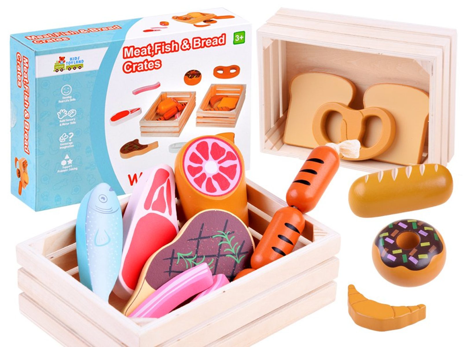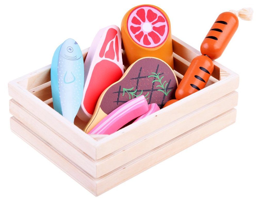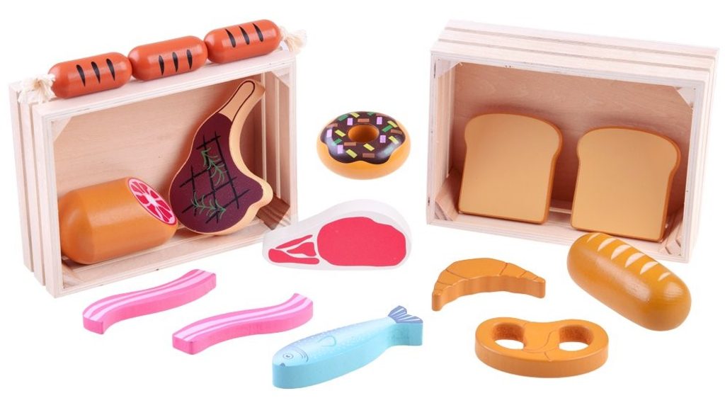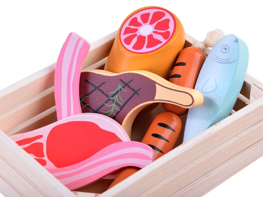 Sada dřevěných potravin Wooden Box se hodí do každé dětské kuchyňky nebo si s ní může dítě hrát samostatně. Vše je vyrobeno ze dřeva a je pokryto zdravotně nezávadnou barvou. Sada obsahuje nejběžnější druhy potravin, dítě se je tak snadno naučí rozpoznávat. Vše je uloženo v praktické dřevěné bedýnce. Tato hračka je určena pro děti od 3 let věku.