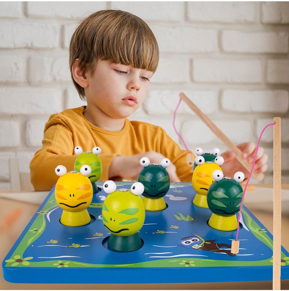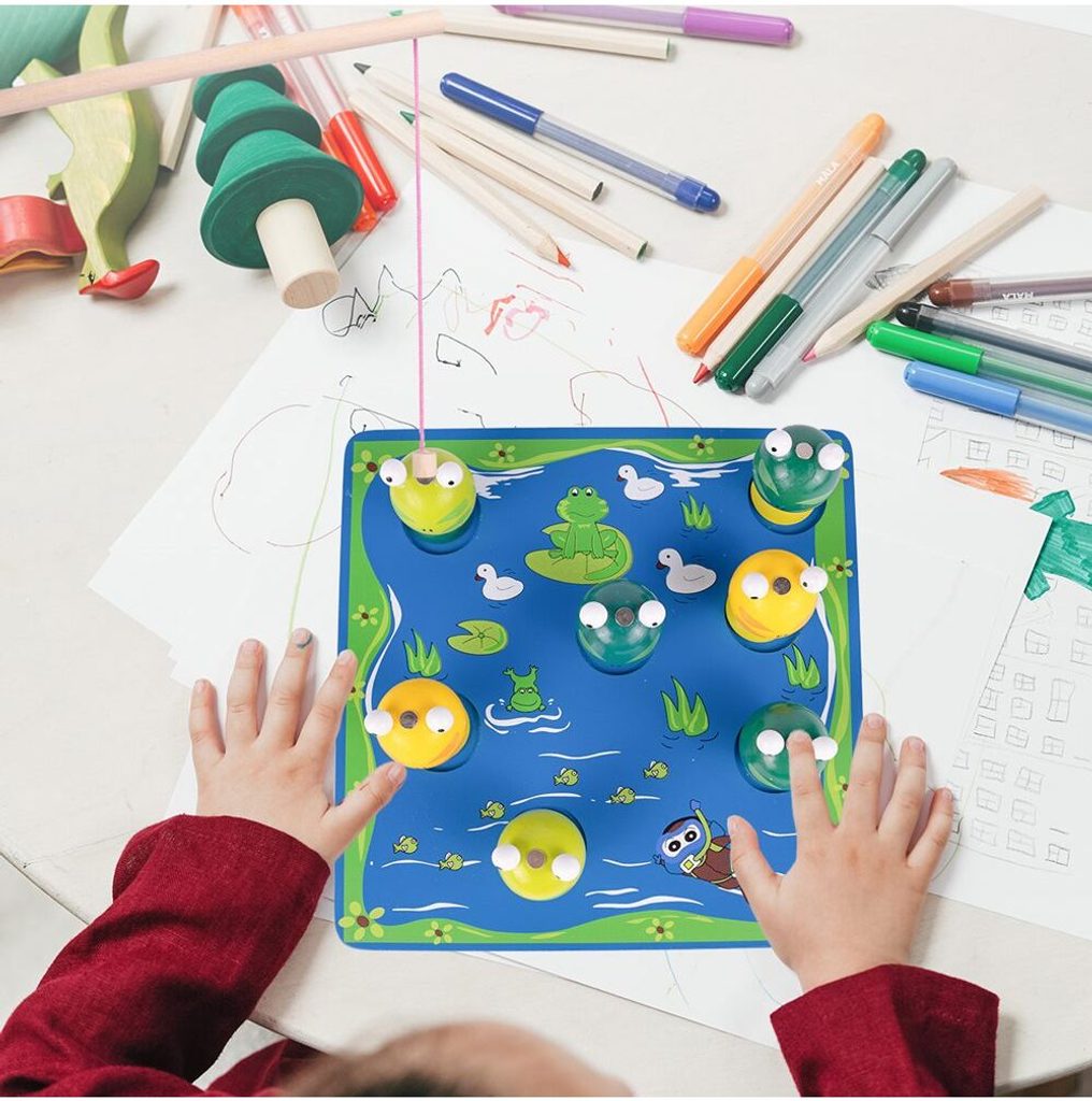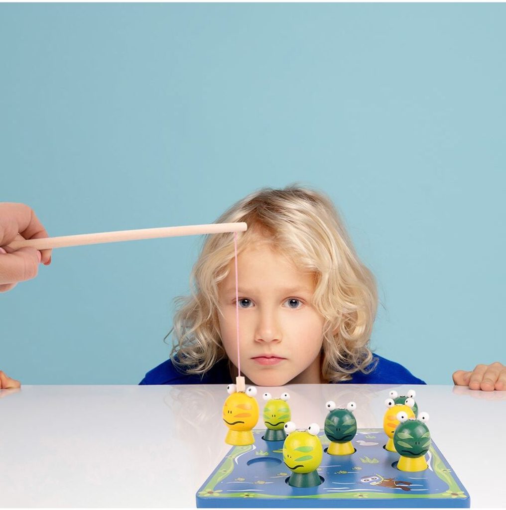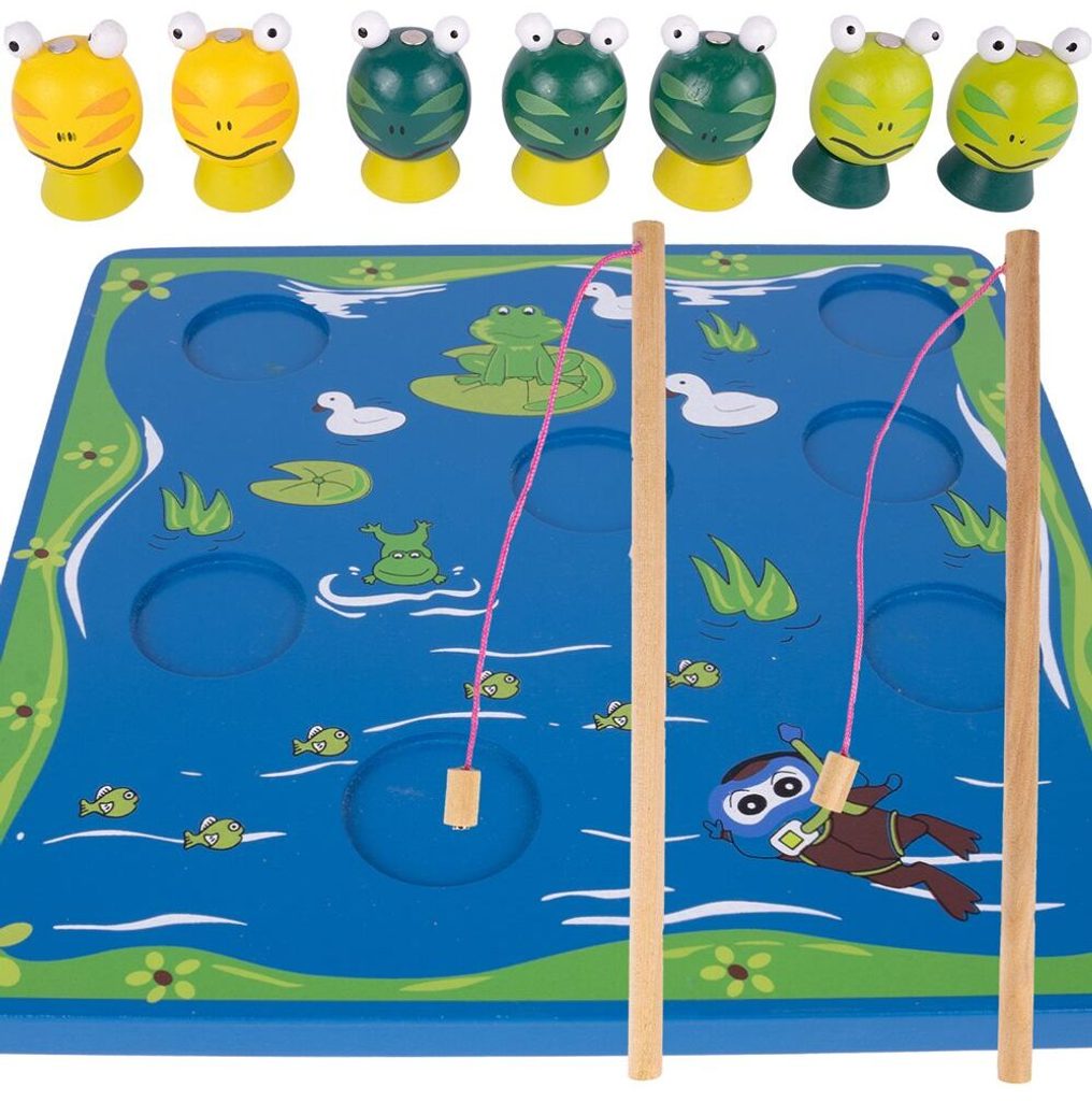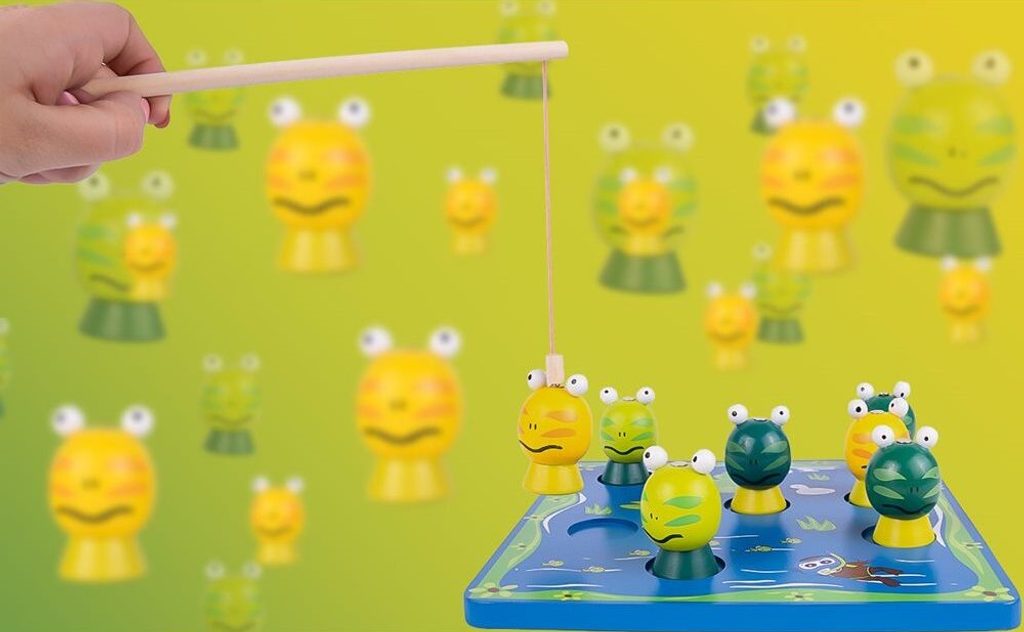 Dětská hra Lovení žabiček s magnetem učí dětí koordinaci a podporuje kreativitu. Pomocí dvou přiložených prutů lze lovit dřevěné žabičky a ukládat je druhou část hry s mořským motivem. Vše je vyrobeno ze dřeva bez ostrých hran. Hračka je určena pro děti od 36 měsíců věku.