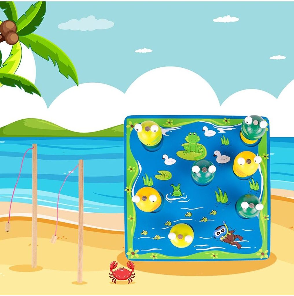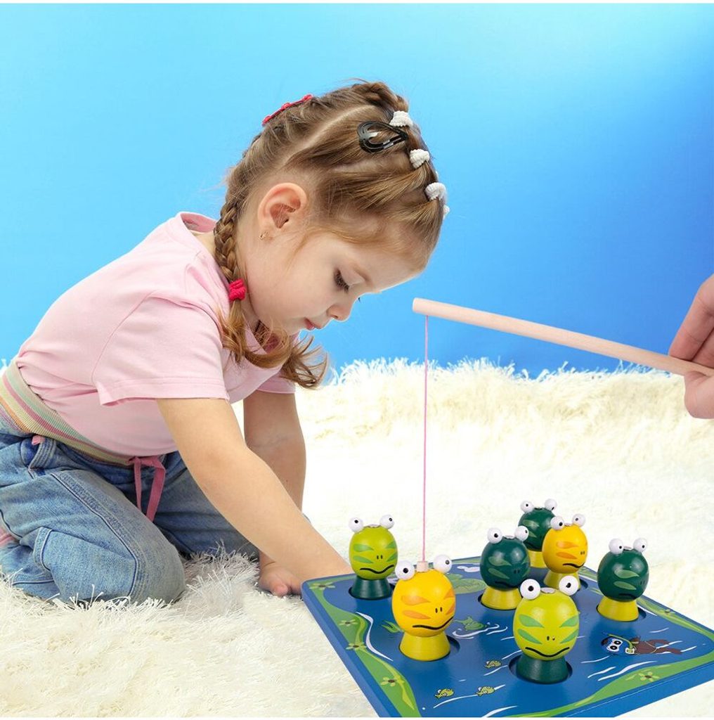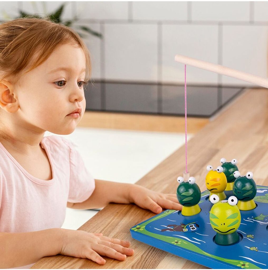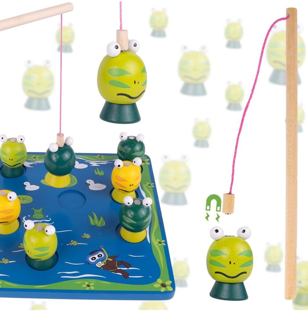 Dětská hra Lovení žabiček s magnetem učí dětí koordinaci a podporuje kreativitu. Pomocí dvou přiložených prutů lze lovit dřevěné žabičky a ukládat je druhou část hry s mořským motivem. Vše je vyrobeno ze dřeva bez ostrých hran. Hračka je určena pro děti od 36 měsíců věku.