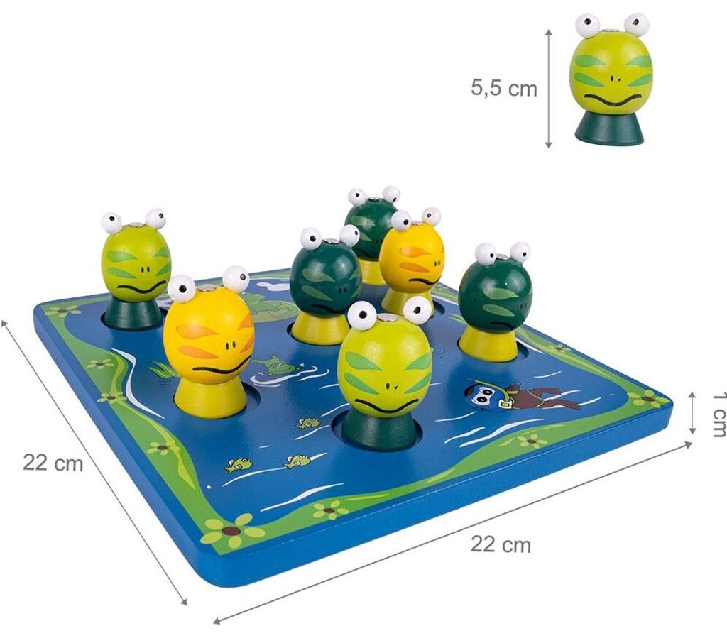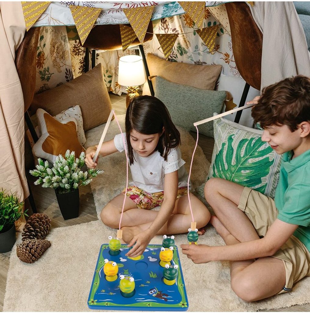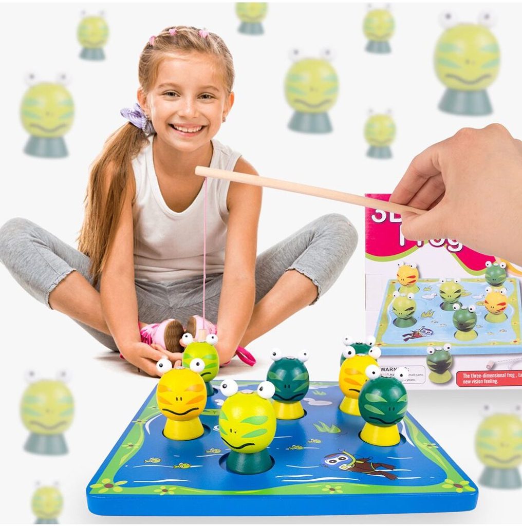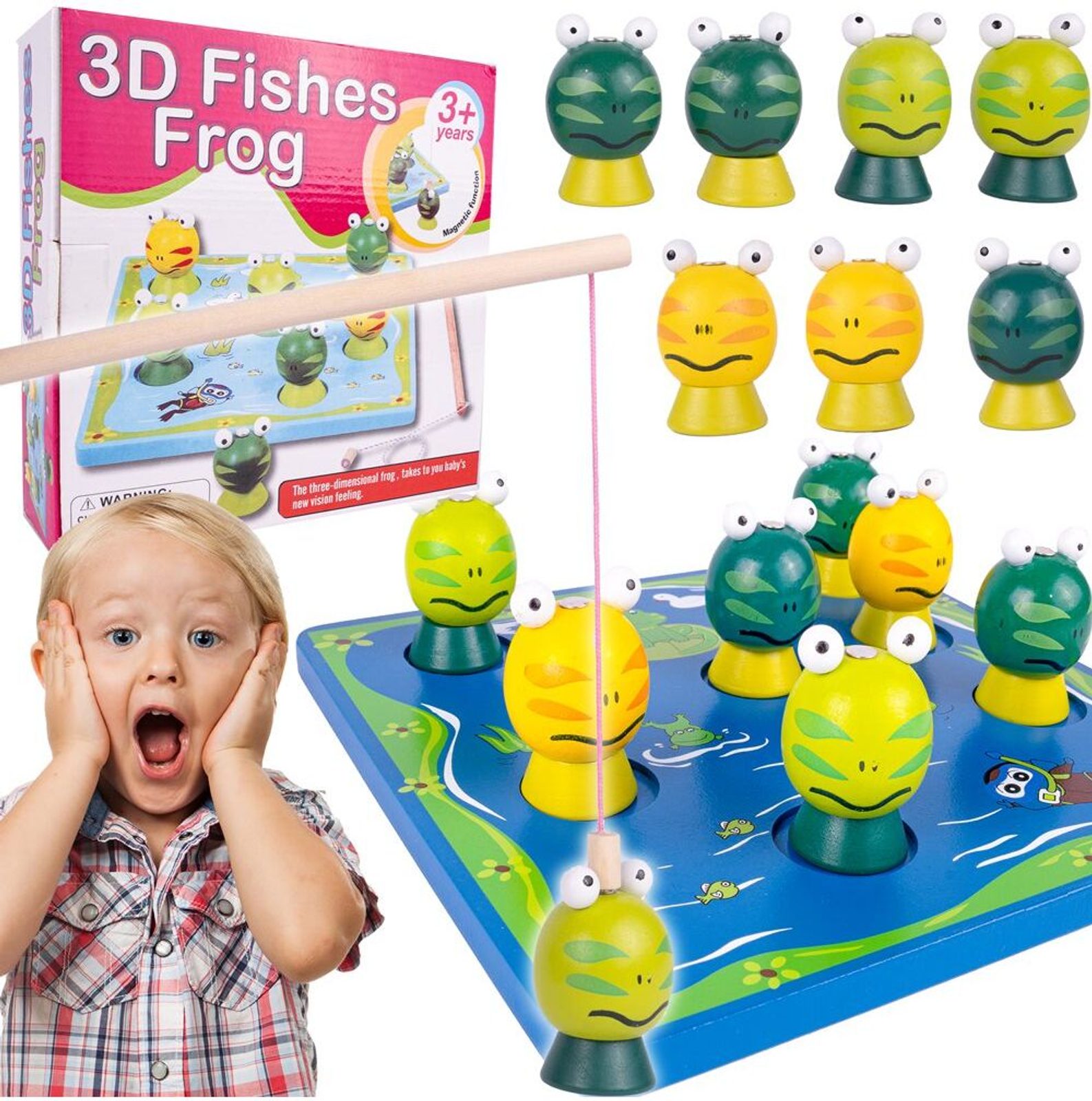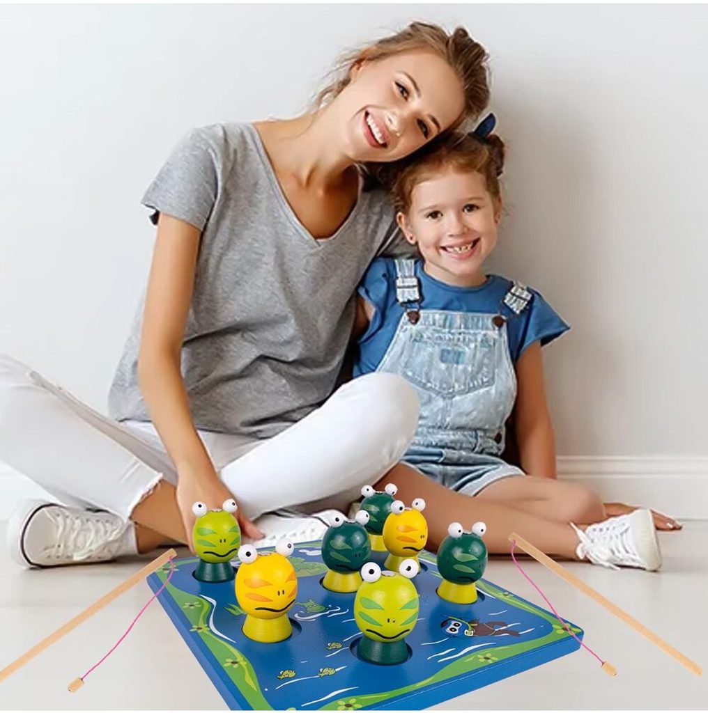 Dětská hra Lovení žabiček s magnetem učí dětí koordinaci a podporuje kreativitu. Pomocí dvou přiložených prutů lze lovit dřevěné žabičky a ukládat je druhou část hry s mořským motivem. Vše je vyrobeno ze dřeva bez ostrých hran. Hračka je určena pro děti od 36 měsíců věku.