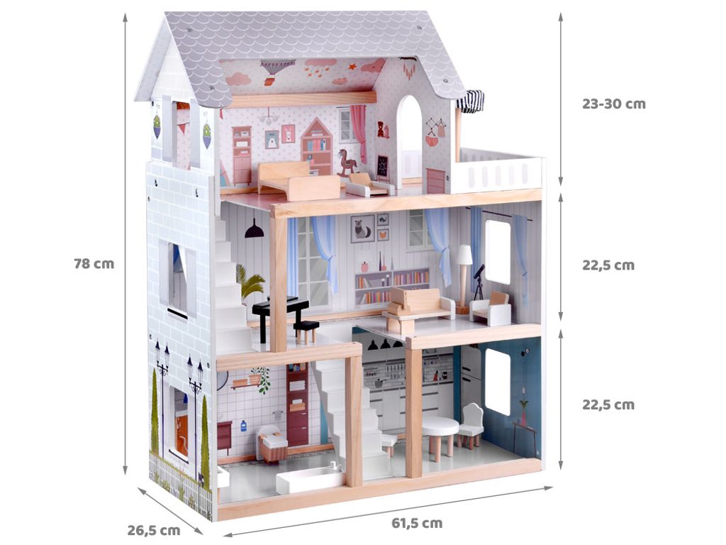 Domeček pro panenky s LED osvětlením rezidence Boho má 3 nezávislé úrovně, ve kterých je celkem 5 pokojů - vše imituje dokonale skutečný bytový dům. Každý pokoj byl dokončen v jiném stylu, přizpůsoben byl dekor a nábytek charakteru a účelu místnosti. Celý domeček je osvětlený LED páskou. Součástí soupravy je také sada 16 ks dřevěného nábytku, který lze bez omezení přesunovat. Každý kus nábytku je vyroben ručně, s velkou pozorností k detailu a nejvyšší kvalitě provedení, bylo také dbáno na odstranění ostrých hran, které jsou zásadní pro bezpečnost Vašeho dítěte. Domeček pro panenky je nepochybně nejlepší dárek, který můžete dát Vašemu dítěti! Každá dívka sní o takovém domečku! Rezidence bude vypadat dobře nejen v dětském pokoji, ale i v obývacím pokoji, což povzbudí potěšení všech členů domácnosti. Nemusíte se starat o sestavení domu - jasná příručka s obrázky a číslování všech prvků Vám umožní rychle a efektivně sestavit dům