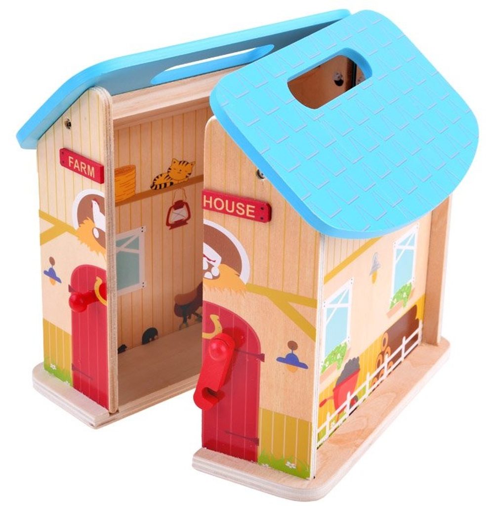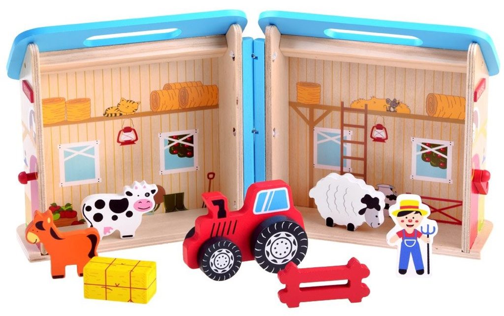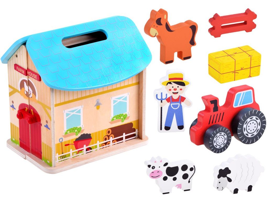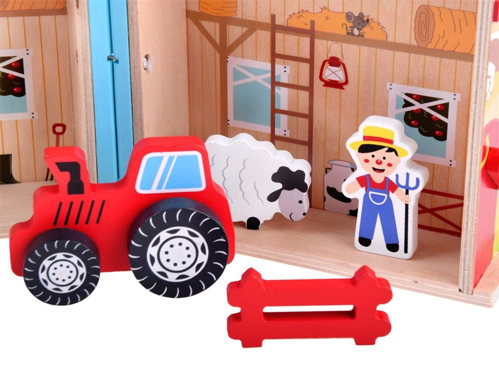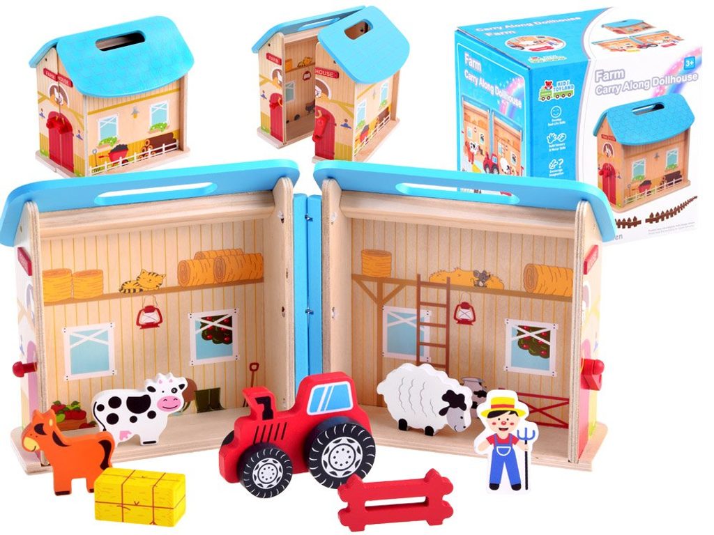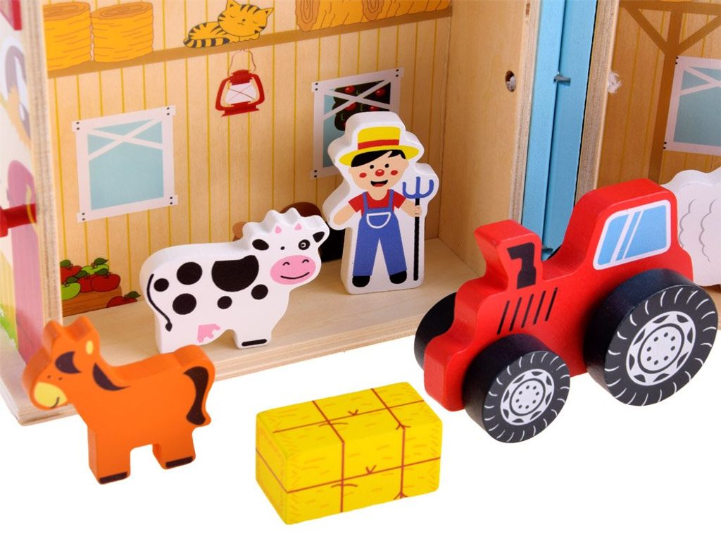 Dřevěný rozkládací domeček se zvířátky Farm House umožní dětem zábavu jako na skutečné farmě. Domeček v provedení stodoly lze rozložit a jeho součástí jsou zvířátka, traktor, postavička farmáře, ohradník a dokonce balík slámy. Díky malým rozměrům a možnosti uzavření je domeček ideální hračkou, které si může dítě vzít sebou na návštěvu nebo kamkoliv bude chtít. Hračka je určena pro děti od 3 let věku.