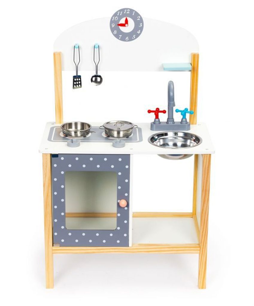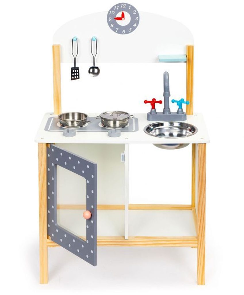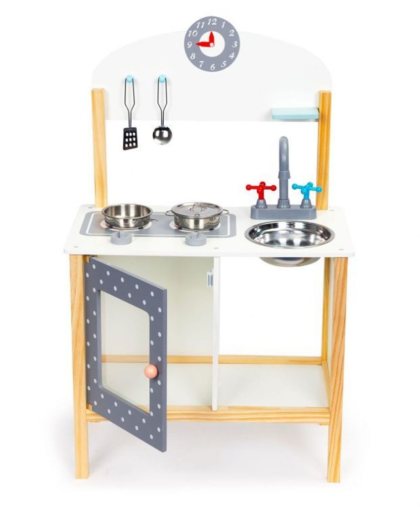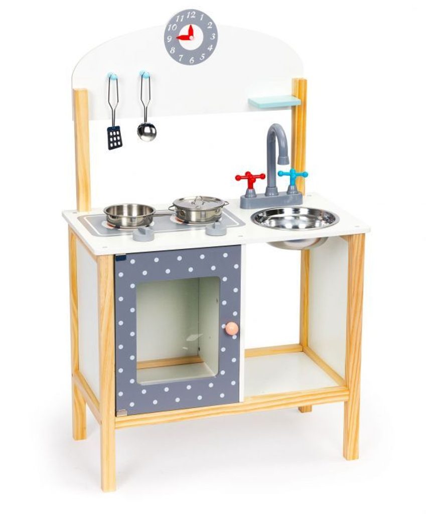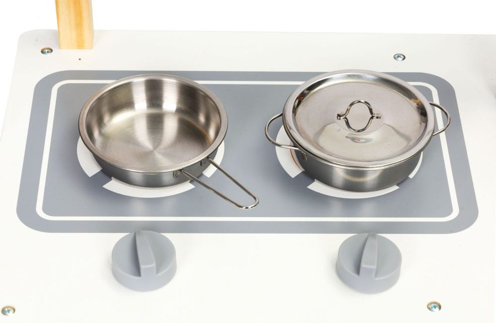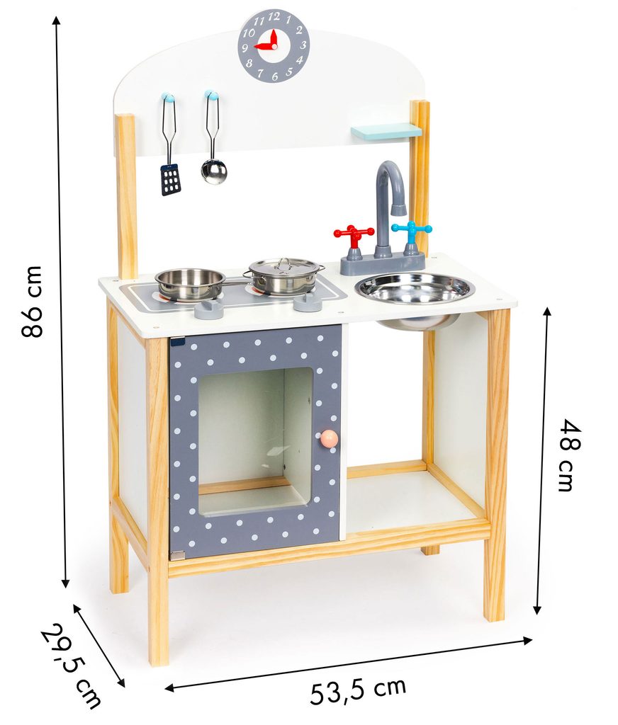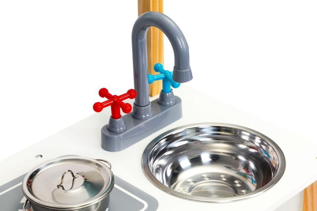 Dřevěná dětská kuchyňka Ecotoys Little Chef s vybavením je určena pro děti od 3 let věku. Je vybavena celkem 5 kusy kovového kuchyňského nádobí. Vaše dítě se určitě s touto velkou kuchyňkou nudit nebude. Spodní skříňka je otevírací. V kuchyňce je také dřez s otáčivými vodovodními kohoutky. Otočné vypínače sporáku vydávají po otočení zvuk (klik). Kuchyňka je vyrobena pouze ze dřeva bez ostrých hran v pestrobarevném provedení.