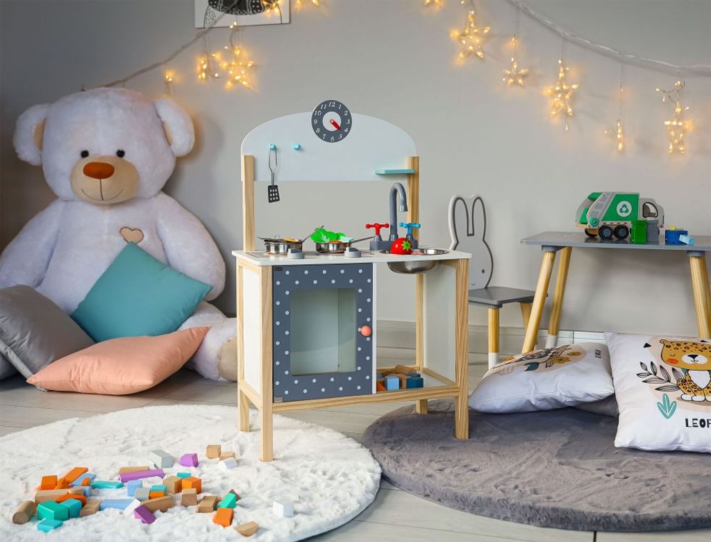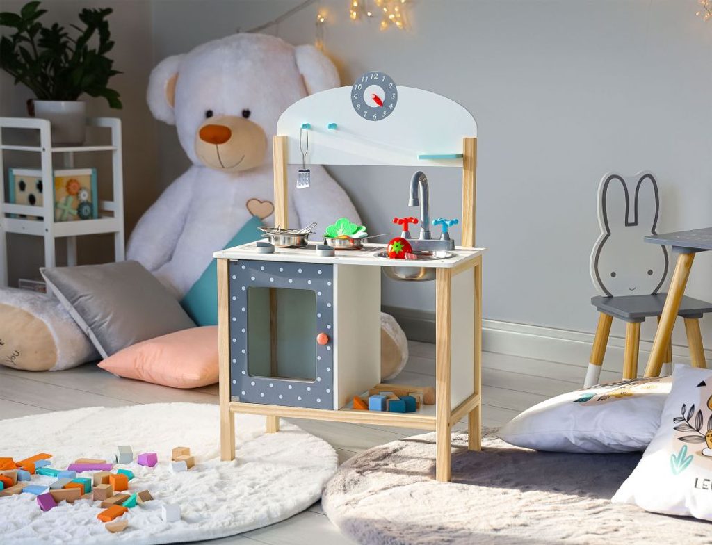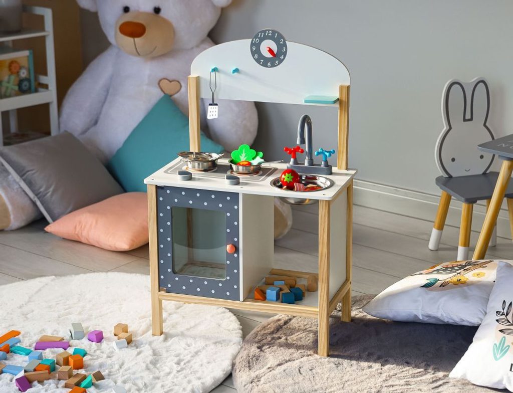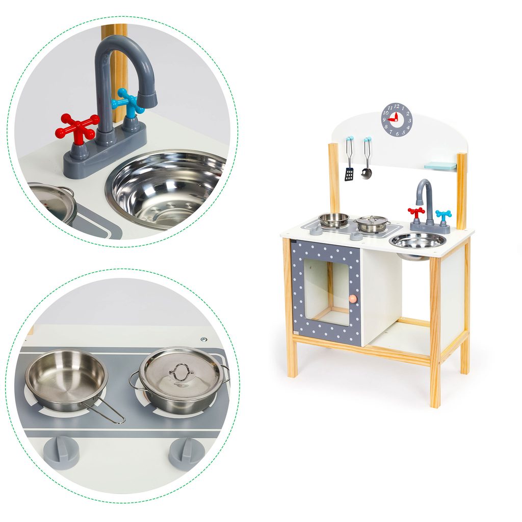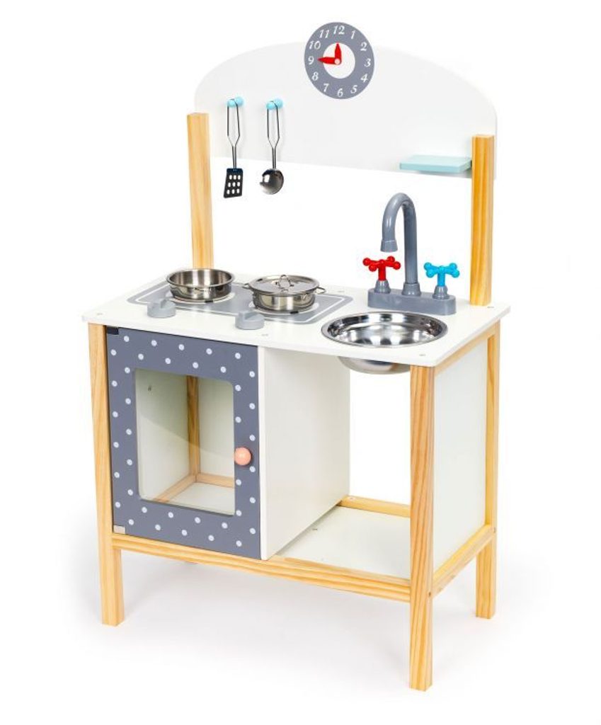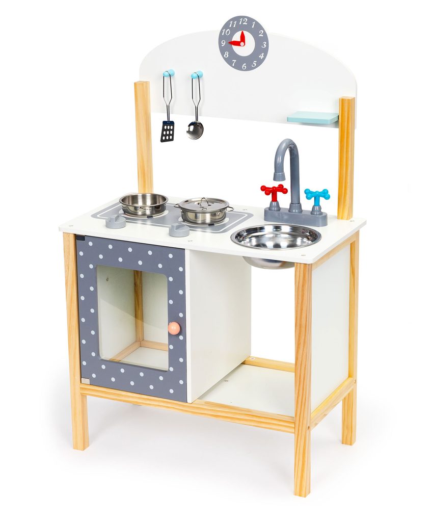 Dřevěná dětská kuchyňka Ecotoys Little Chef s vybavením je určena pro děti od 3 let věku. Je vybavena celkem 5 kusy kovového kuchyňského nádobí. Vaše dítě se určitě s touto velkou kuchyňkou nudit nebude. Spodní skříňka je otevírací. V kuchyňce je také dřez s otáčivými vodovodními kohoutky. Otočné vypínače sporáku vydávají po otočení zvuk (klik). Kuchyňka je vyrobena pouze ze dřeva bez ostrých hran v pestrobarevném provedení.