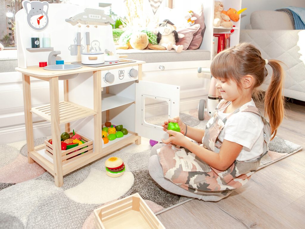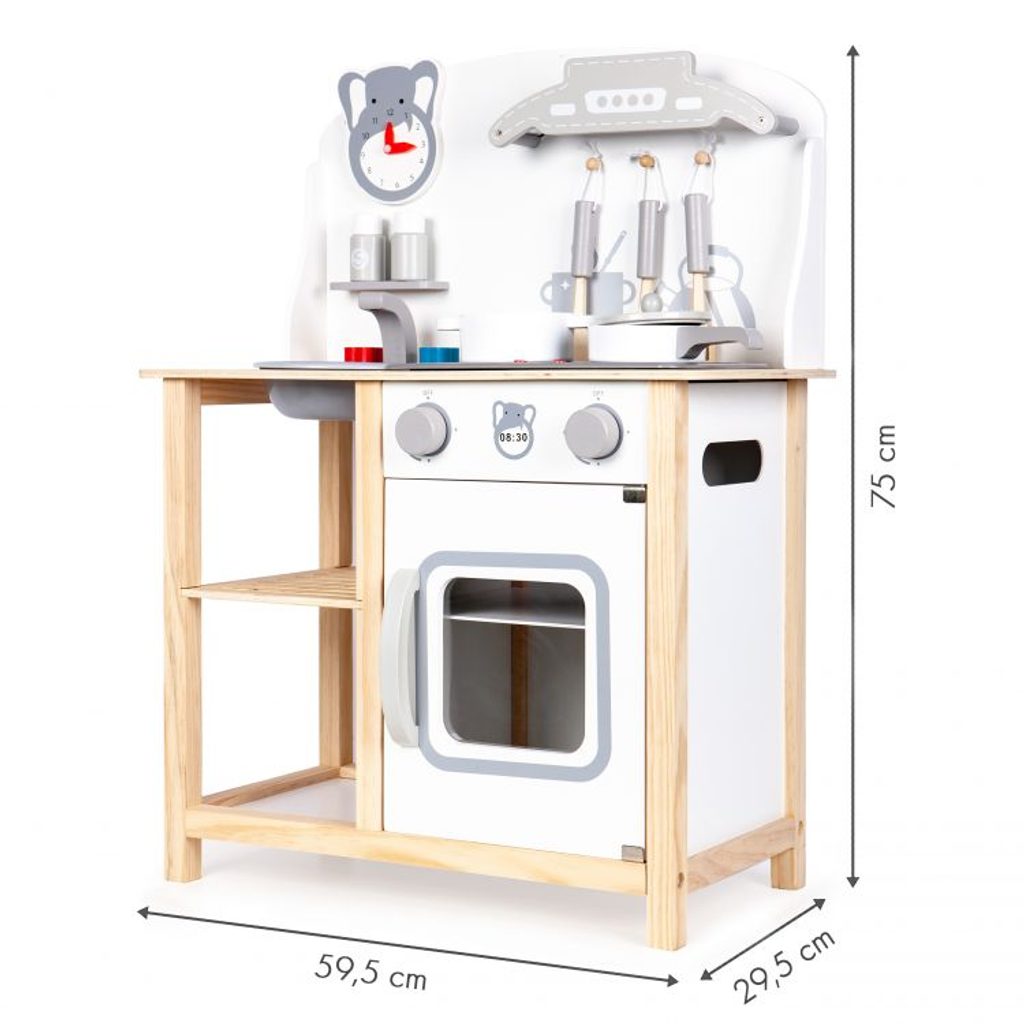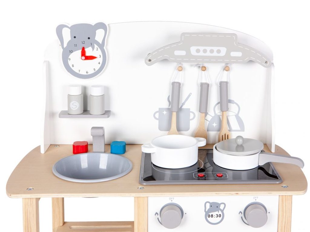 Dřevěná dětská kuchyňka Ecotoys s příslušenstvím pro děti od 3 let věku. Je vybavena celkem 7 kusy dřevěného nádobí. Vaše dítě se určitě s touto kuchyňkou nudit nebude. Hořáky sporáku jsou podsvícené LED diodami a malý reproduktor vydává zvuky vaření. Kuchyňka má plastový dřez s dřevěnými kohoutky, odkládací poličku, otočné vypínače sporáku a otevírací troubu. Je vyrobena pouze z kvalitního dřeva v pestrobarevném provedení.