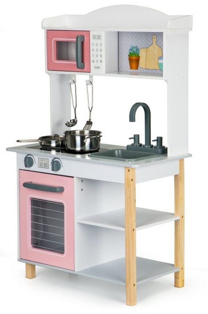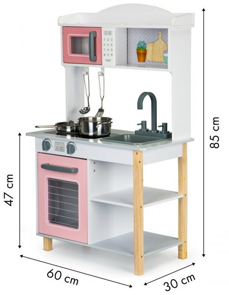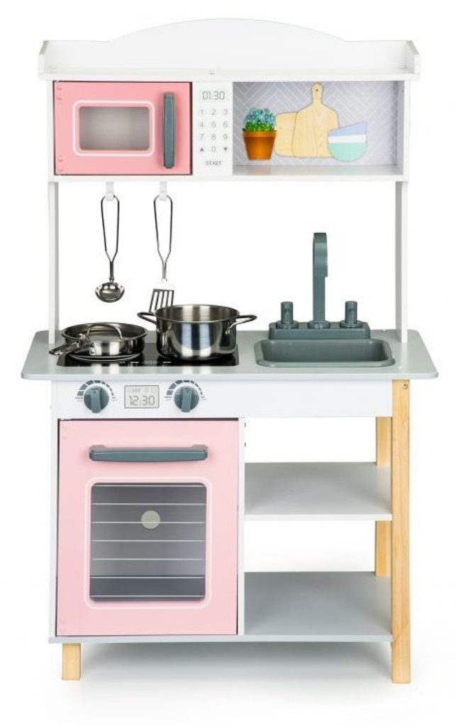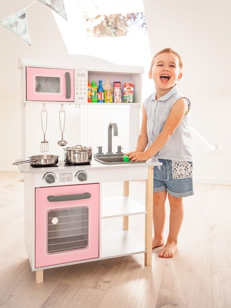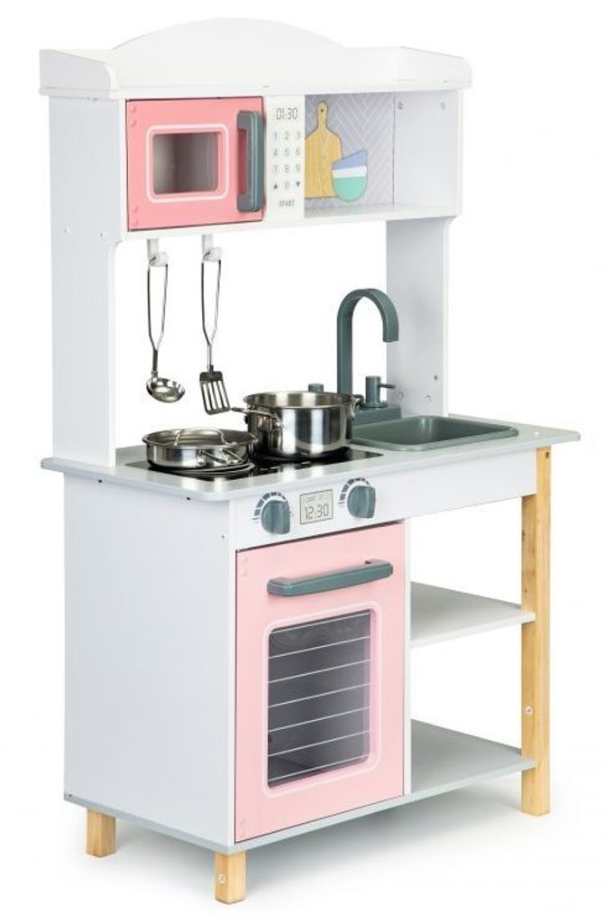 Dřevěná dětská kuchyňka Ecotoys Pink Kitchen s příslušenstvím pro děti od 3 let věku. Je vybavena celkem 5 kusy hliníkového nádobí. Vaše dítě se určitě s touto velkou kuchyňkou nudit nebude. Trouba a šuplík jsou otevírací. Otočné jsou také vypínače u sporáku. Tyto vydávají otočením zvuk "klik". Kuchyňka je vyrobena ze dřeva v pestrobarevném provedení.