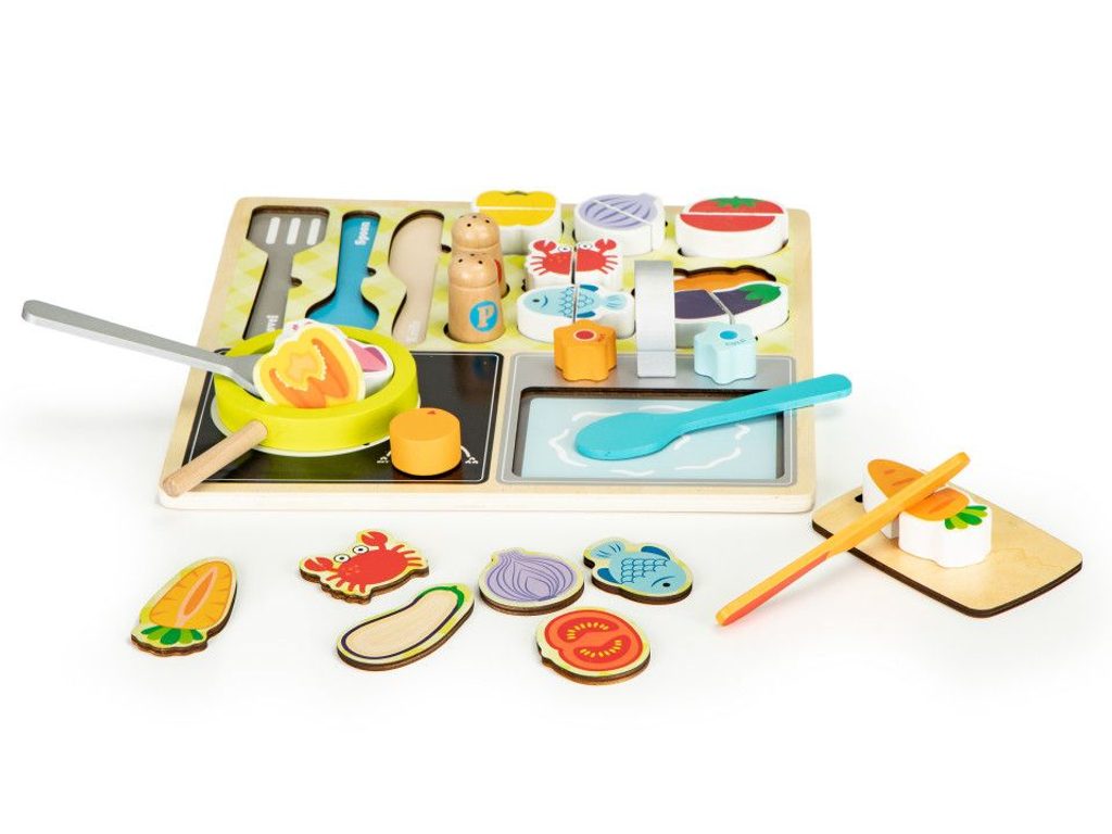 Dřevěná dětská mini kuchyňka na desce Ecotoys Kitchen Desk s celkem 13 kusy příslušenství je určena pro děti od 3 let věku. Základem sestavy je deska o rozměru 30x30 cm v provedení kuchyňské linky s otvory na vkládání příslušenství. Součástí sady jsou ovoce a zelenina se suchým zipem, lze je tak pomocí přiloženého bezpečného nože krájet. Dále zde dítě najde solničku a pepřenku, kuchyňské náčiní, hrnce a imitace ostatních potravin. Vodovodní kohoutky a vypínač sporáku jsou otočné. Vše je vyrobeno ze dřeva v pestrobarevném provedení.