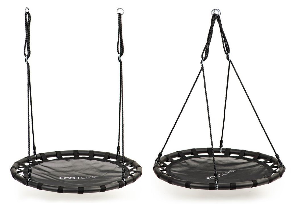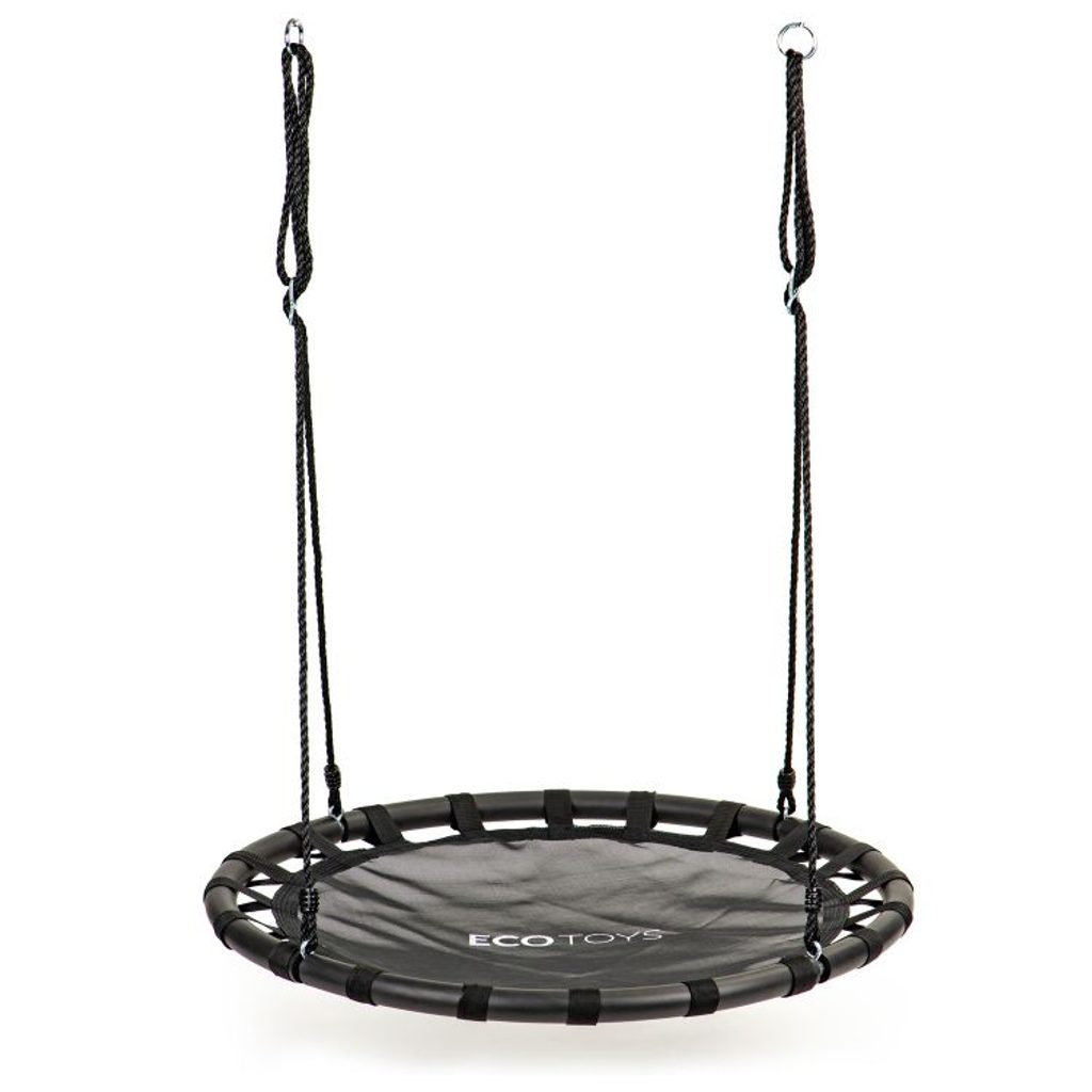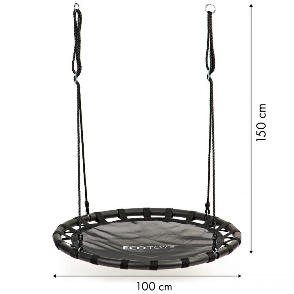 Ecotoys dětská houpačka Čapí hnízdo černá je určena pro děti od 3 let věku. Je opatřena širokým sedadlem o průměru 100 cm vyrobeného z odolného barevného polyesteru. Závěsy jsou nastavitelné až do délky 150 cm a ukotvují se pomocí kovových šroubů. Velmi snadná montáž.