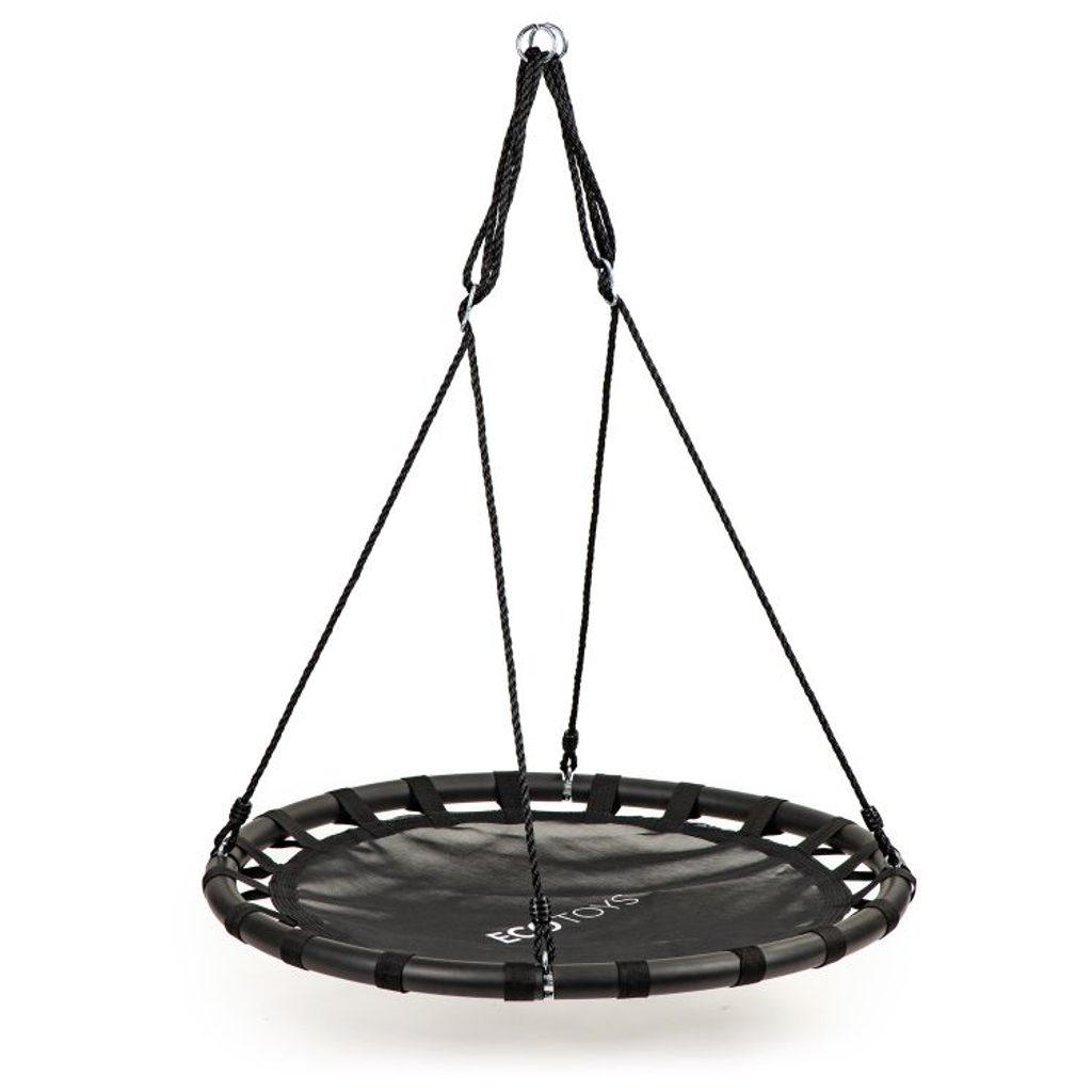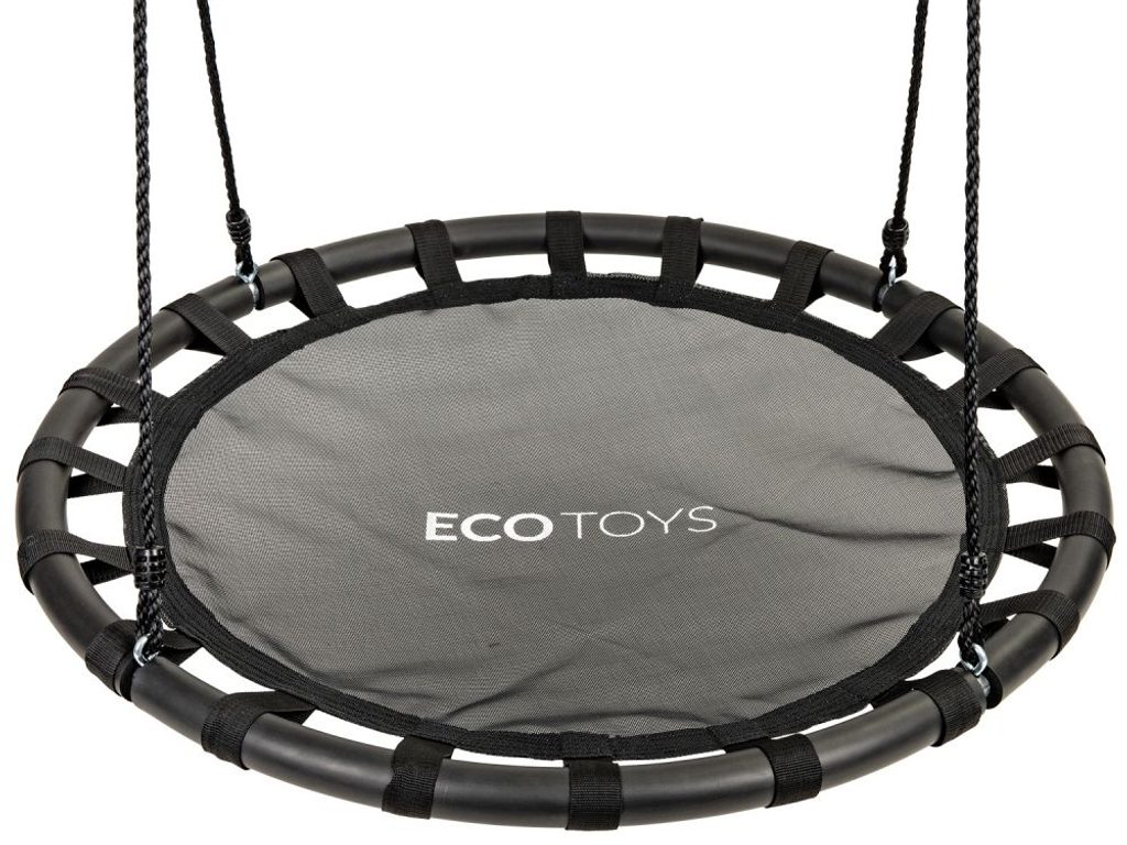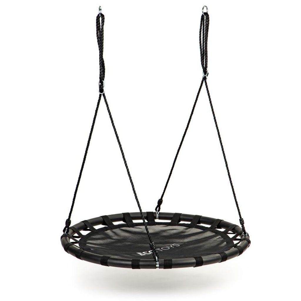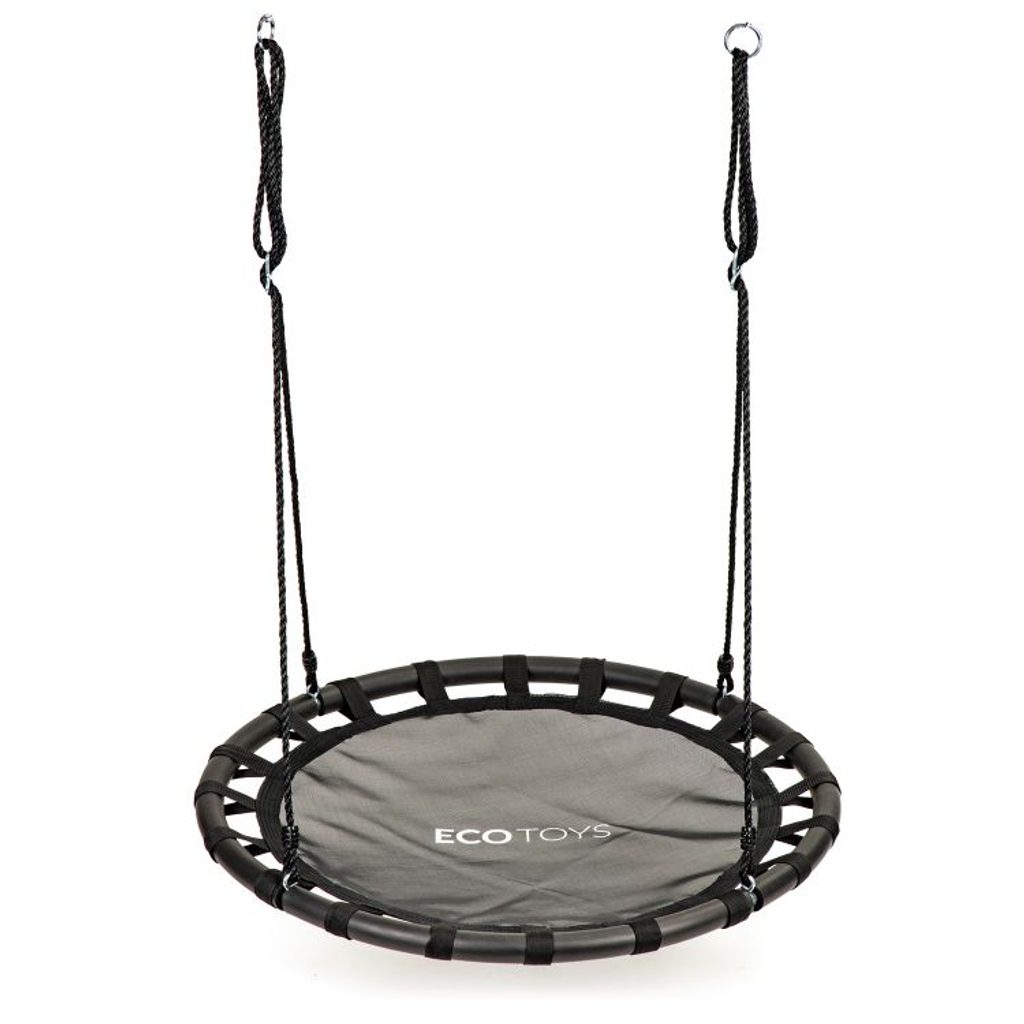 Ecotoys dětská houpačka Čapí hnízdo černá je určena pro děti od 3 let věku. Je opatřena širokým sedadlem o průměru 100 cm vyrobeného z odolného barevného polyesteru. Závěsy jsou nastavitelné až do délky 150 cm a ukotvují se pomocí kovových šroubů. Velmi snadná montáž.