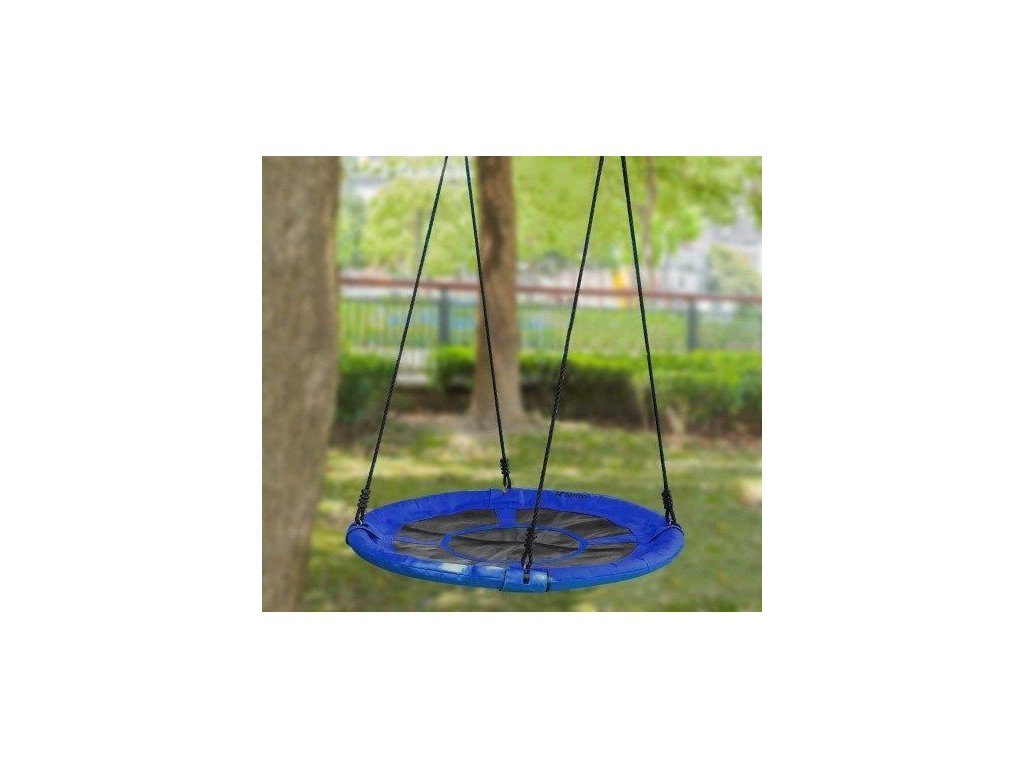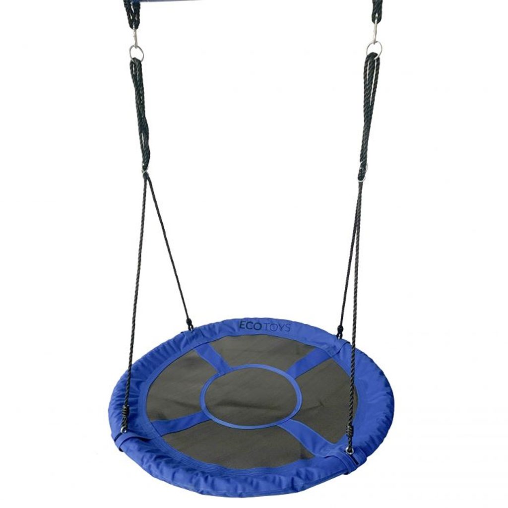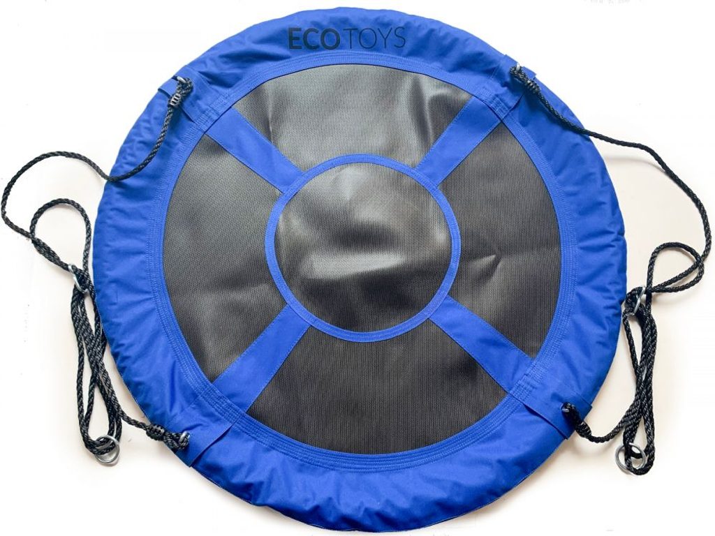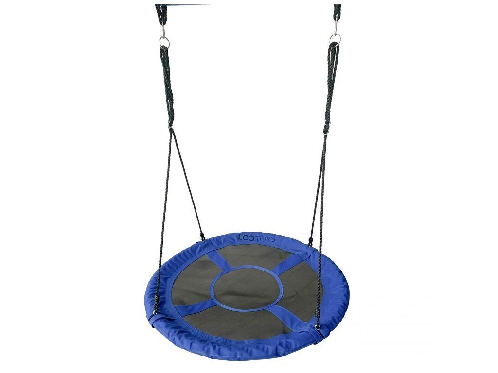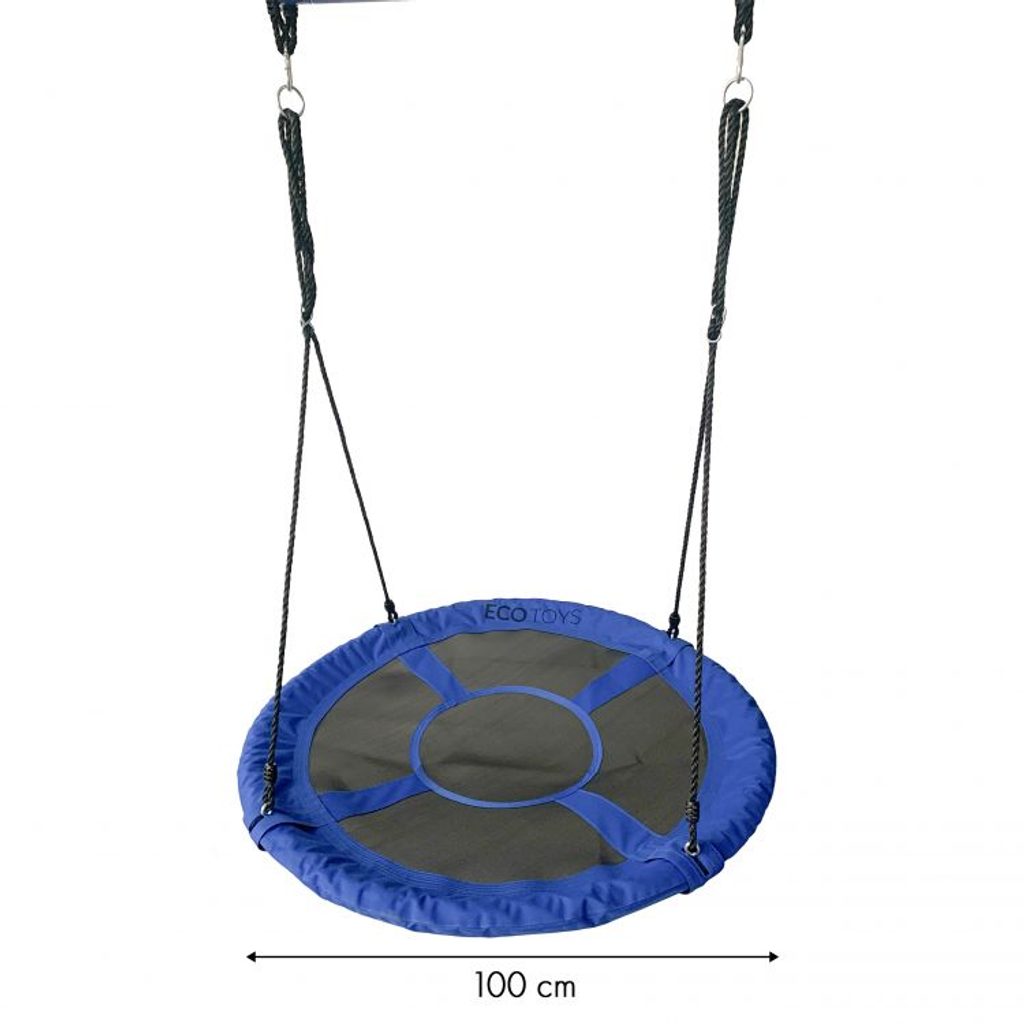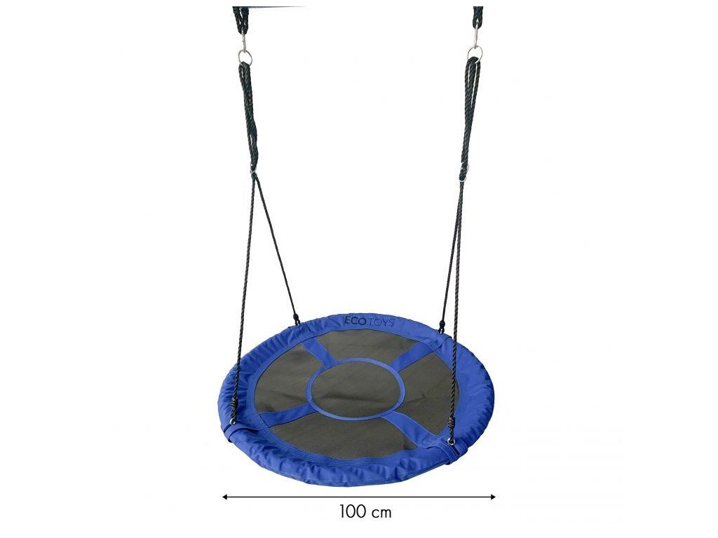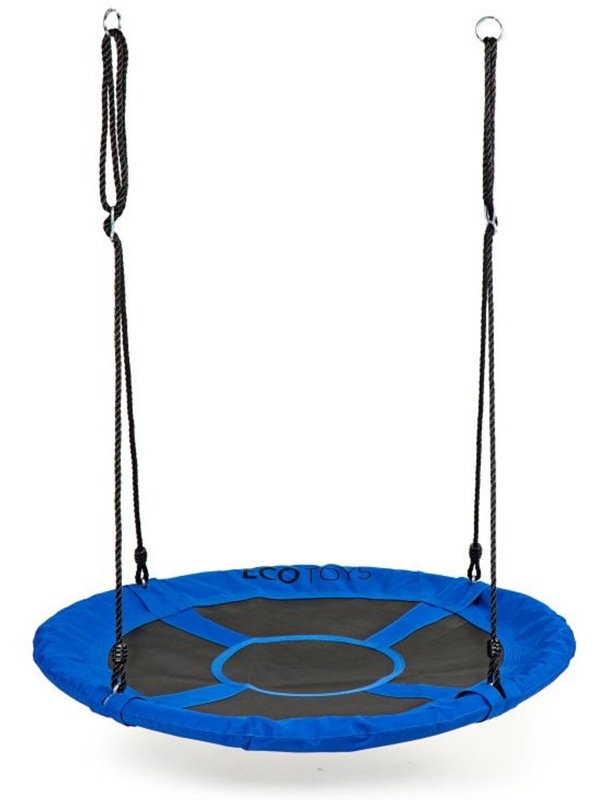 Ecotoys dětská houpačka Čapí hnízdo modrá je určena pro děti od 3 let věku. Je opatřena širokým sedadlem o průměru 100 cm vyrobeného z odolného barevného polyesteru. Závěsy jsou nastavitelné až do délky 160 cm a ukotvují se pomocí kovových šroubů. Velmi snadná montáž.