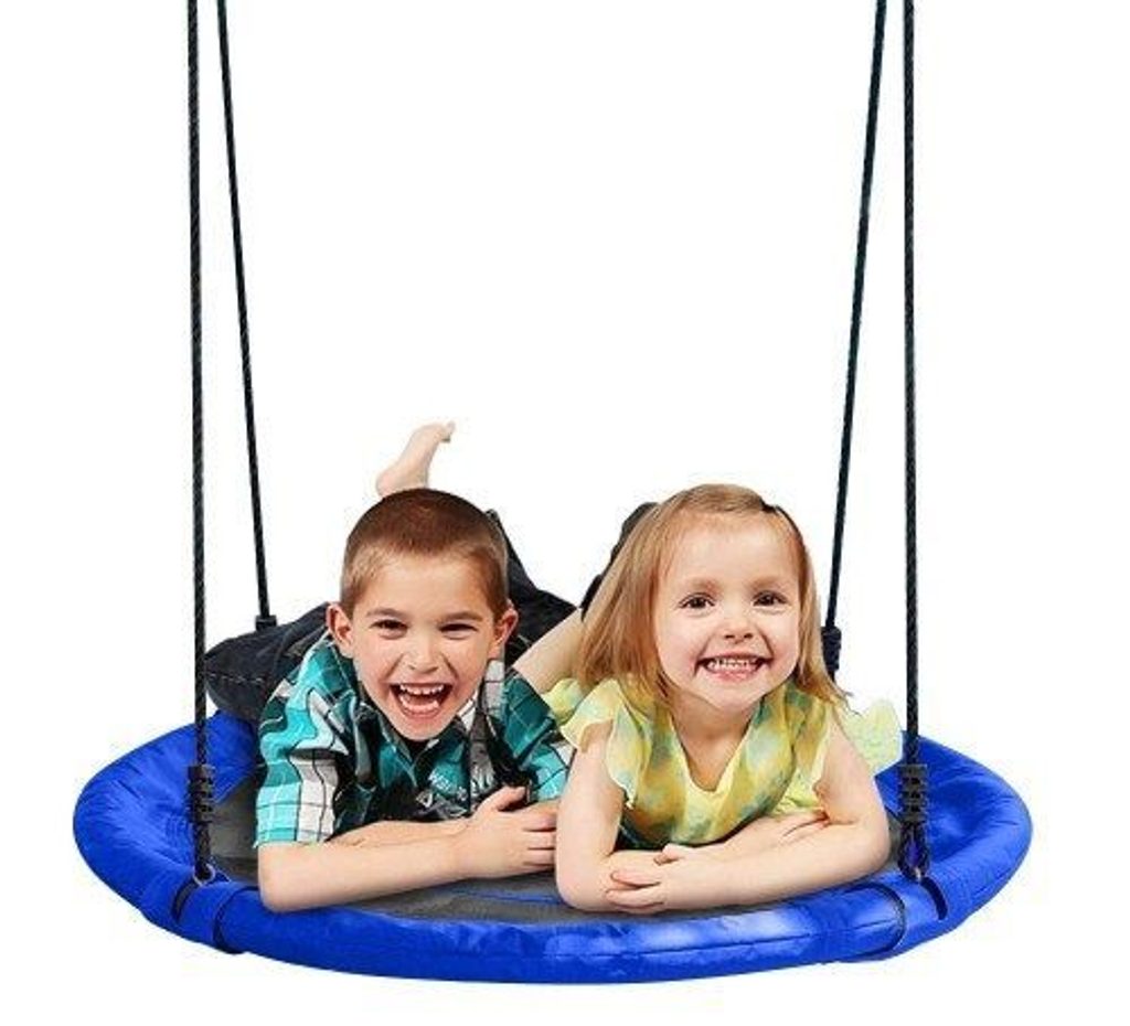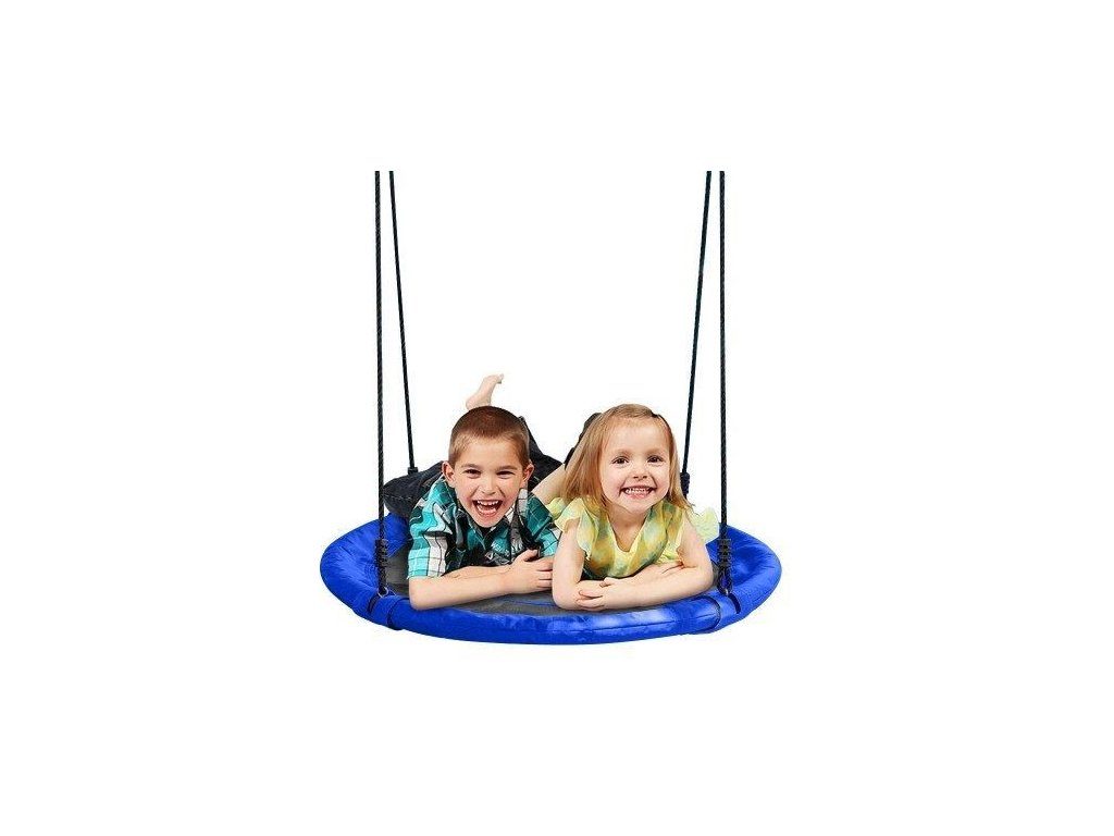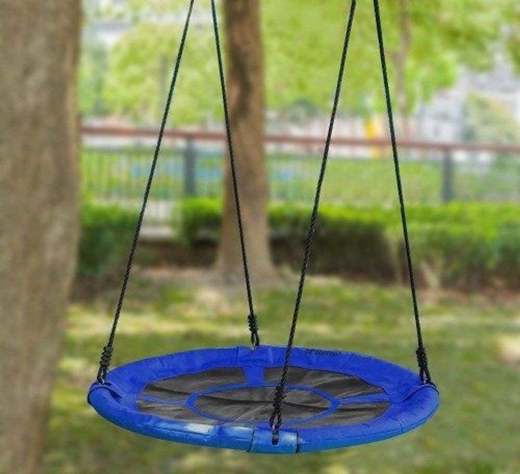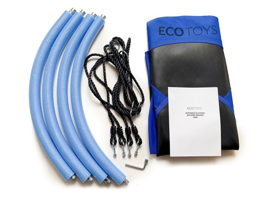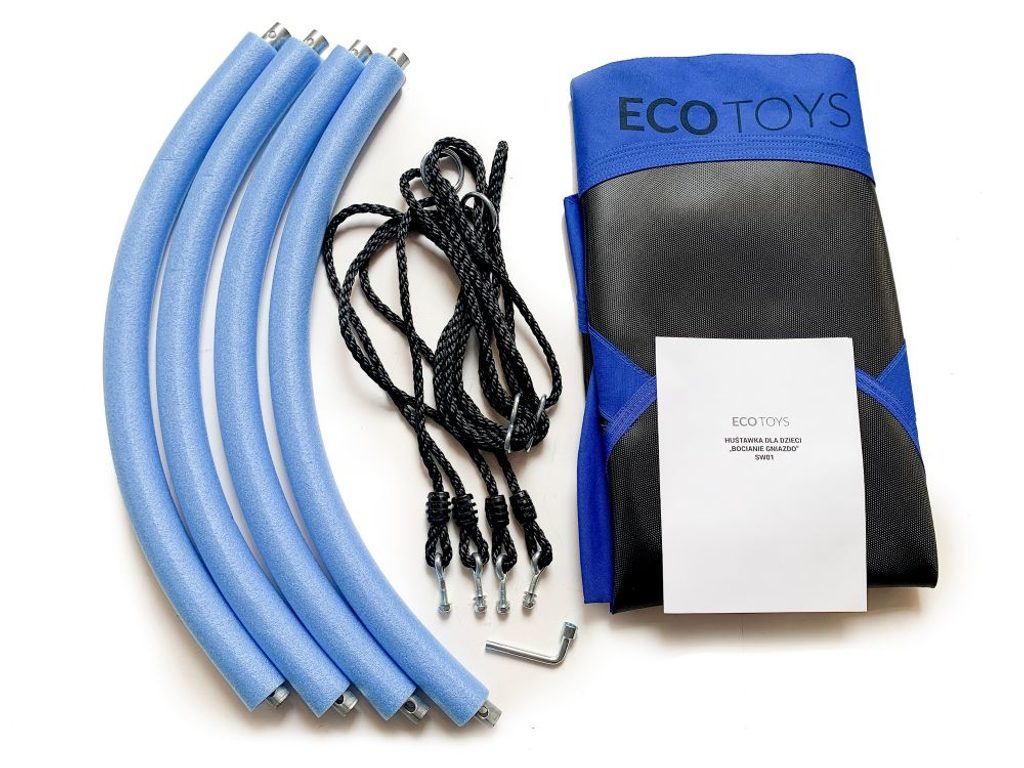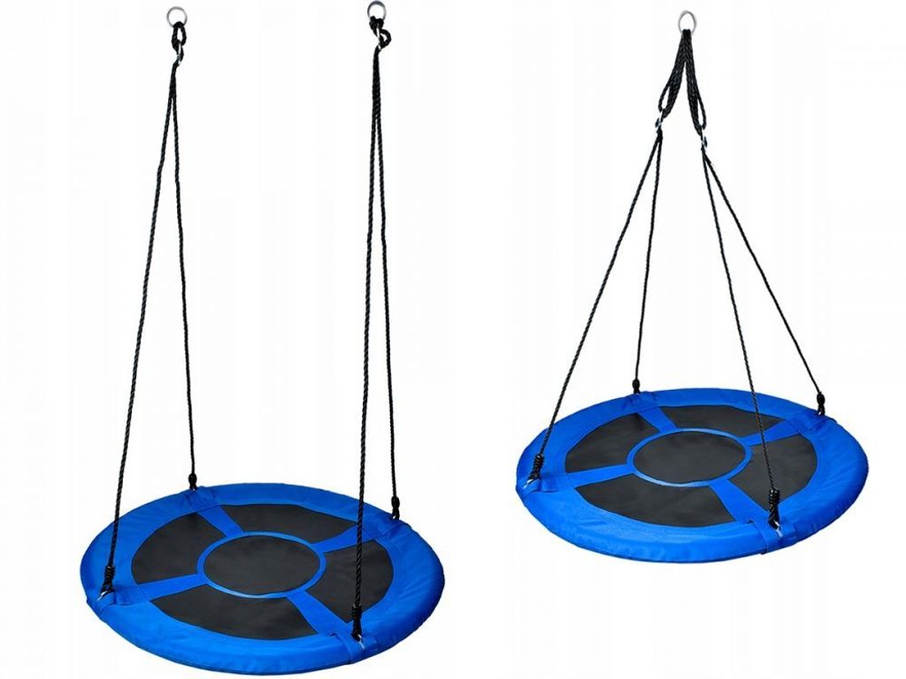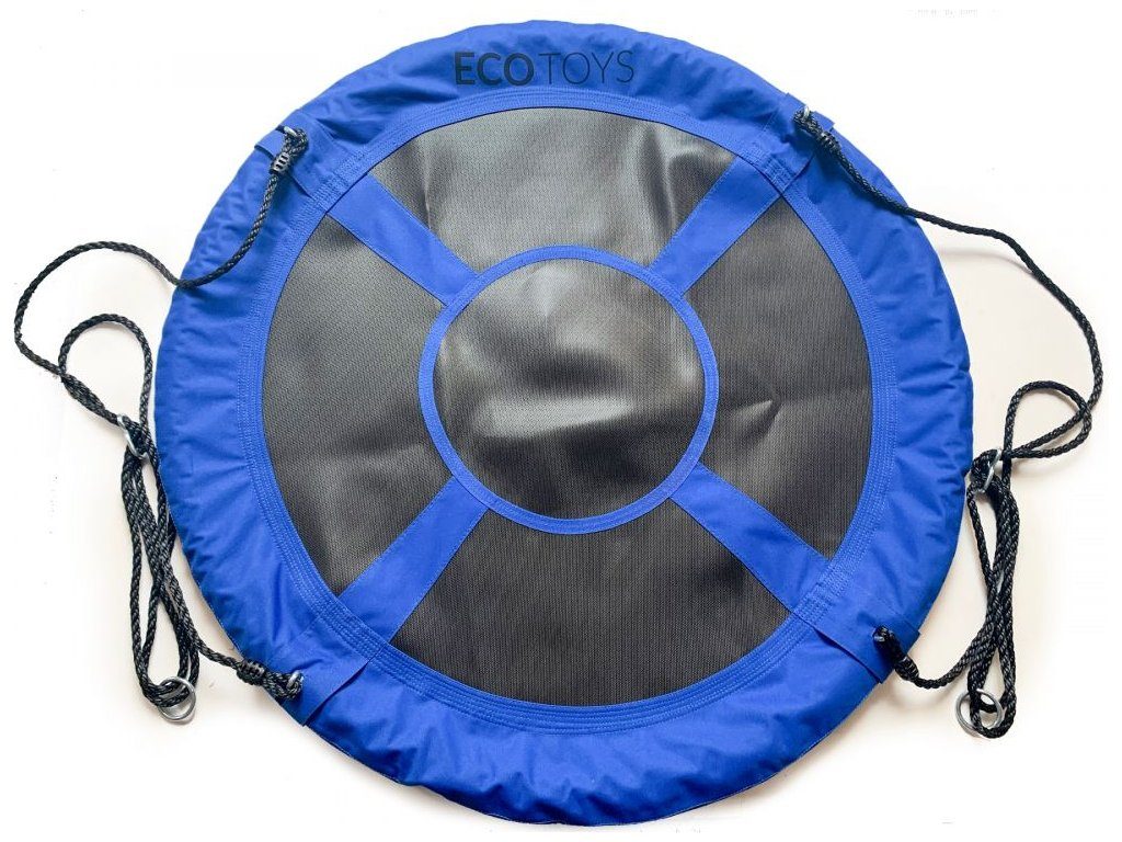 Ecotoys dětská houpačka Čapí hnízdo modrá je určena pro děti od 3 let věku. Je opatřena širokým sedadlem o průměru 100 cm vyrobeného z odolného barevného polyesteru. Závěsy jsou nastavitelné až do délky 160 cm a ukotvují se pomocí kovových šroubů. Velmi snadná montáž.