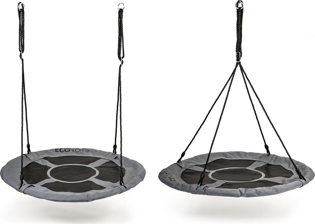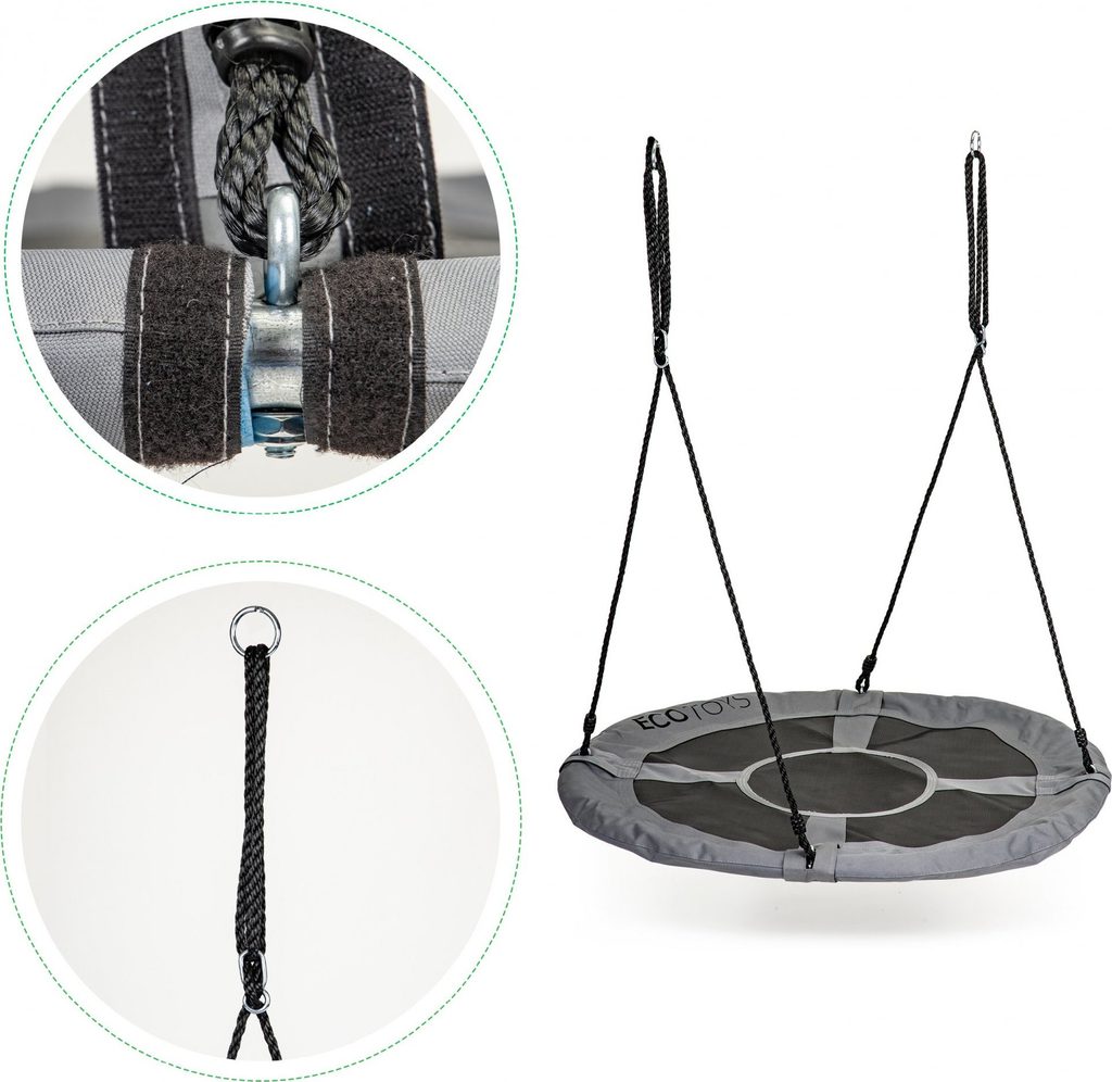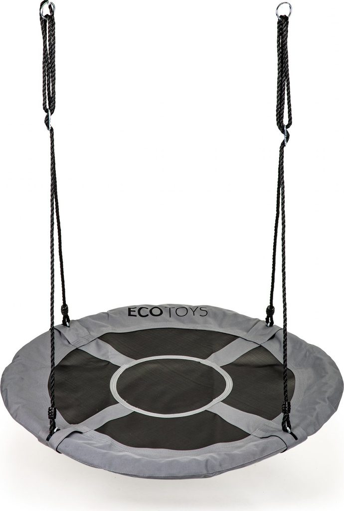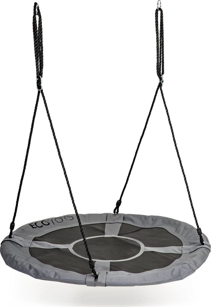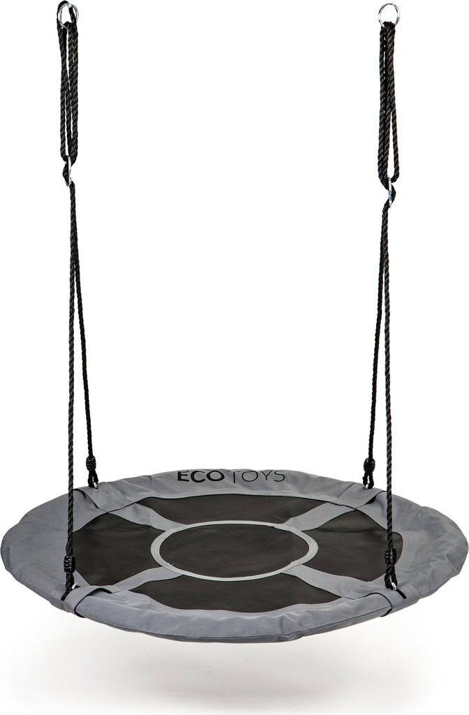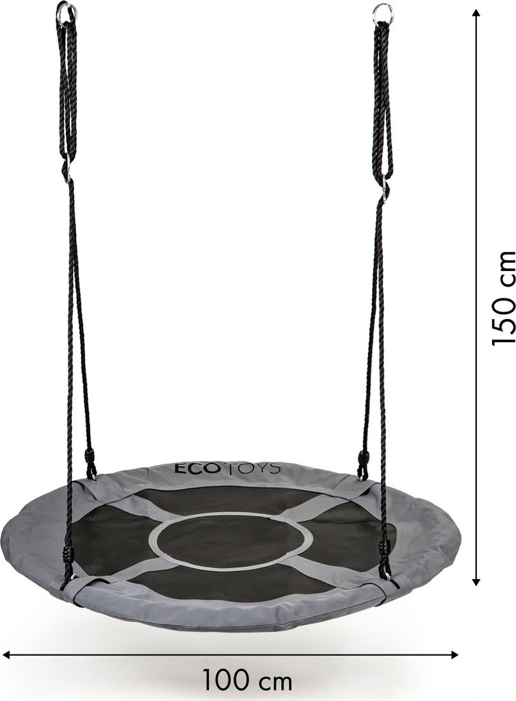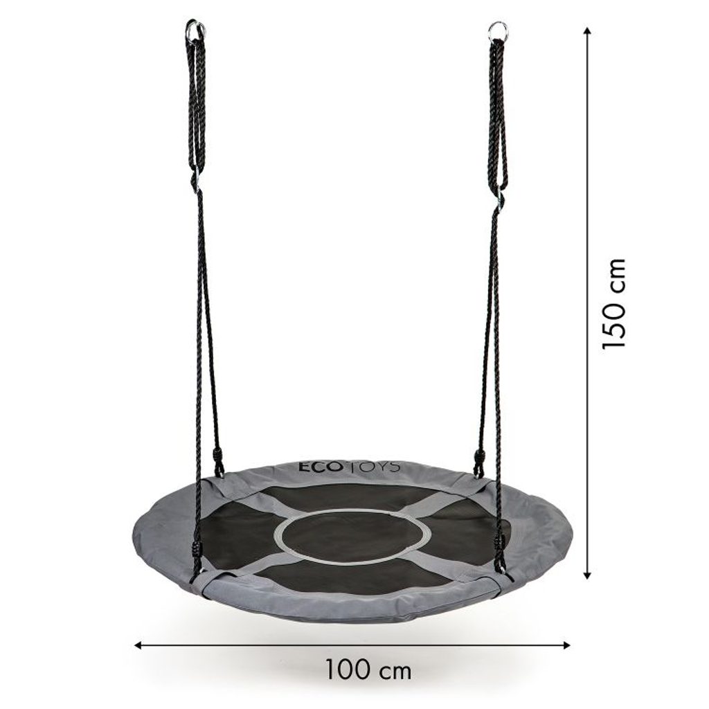 Ecotoys dětská houpačka Čapí hnízdo šedá je určena pro děti od 3 let věku. Je opatřena širokým sedadlem o průměru 100 cm vyrobeného z odolného barevného polyesteru. Závěsy jsou nastavitelné až do délky 150 cm a ukotvují se pomocí kovových šroubů. Velmi snadná montáž.
