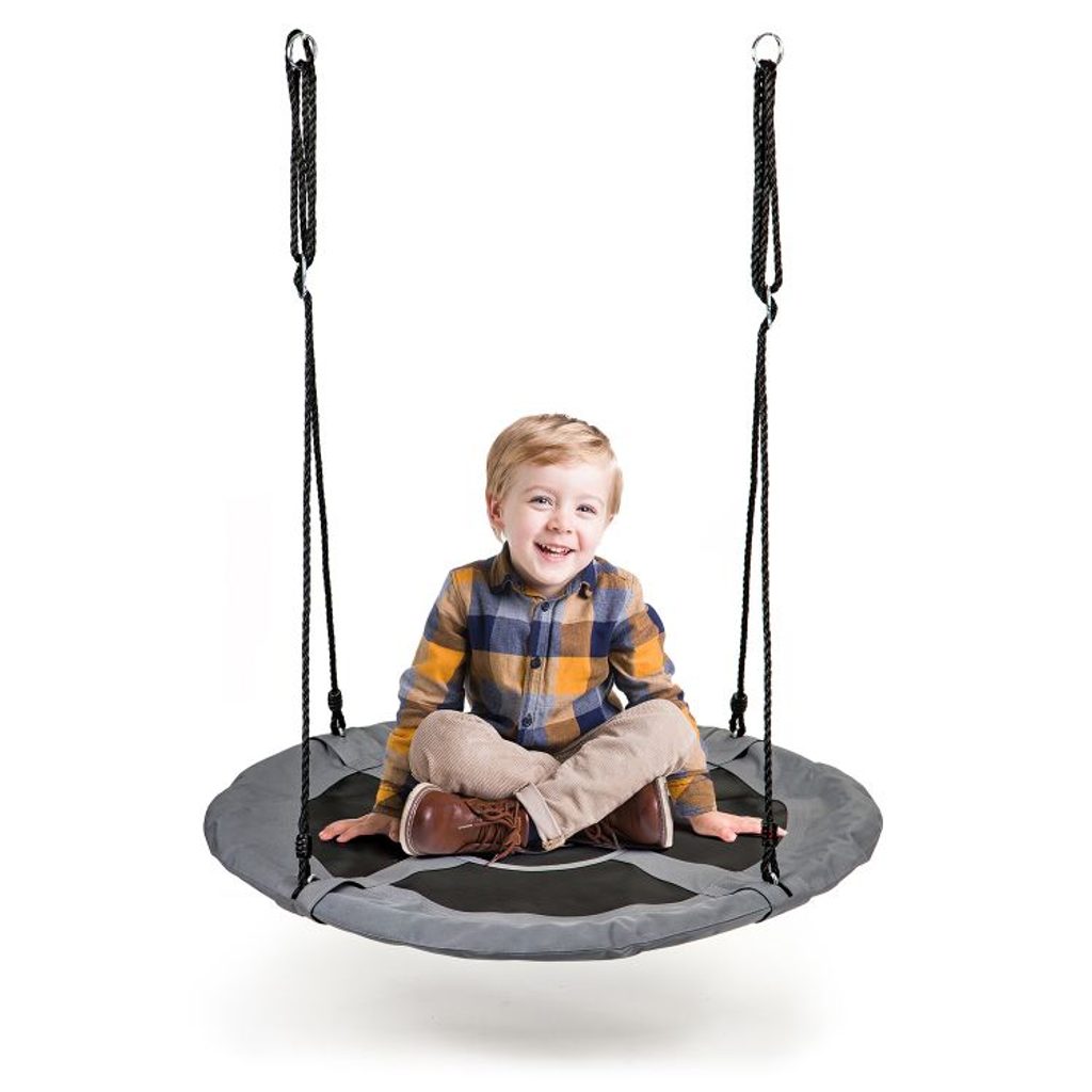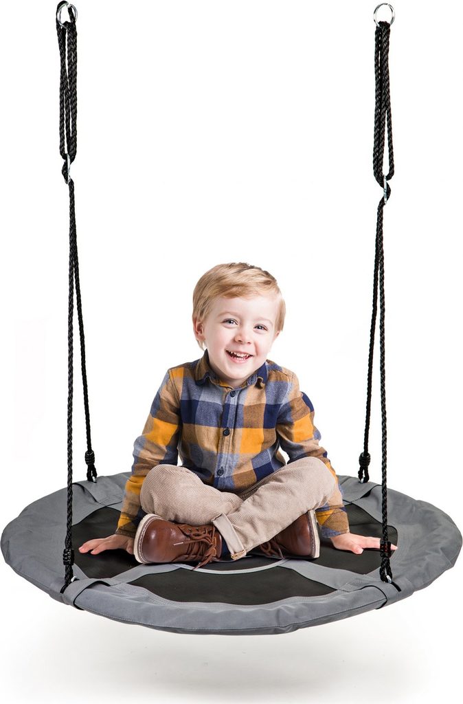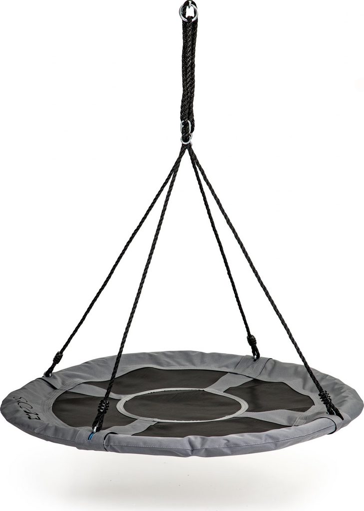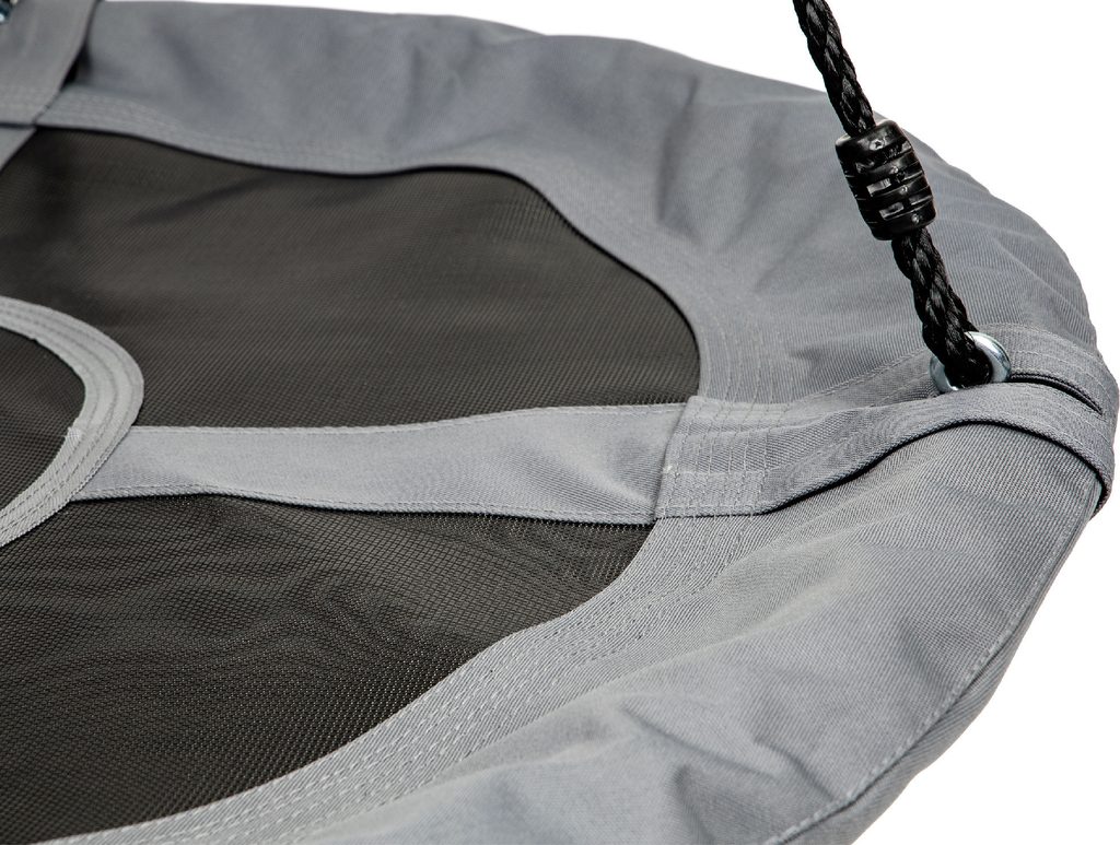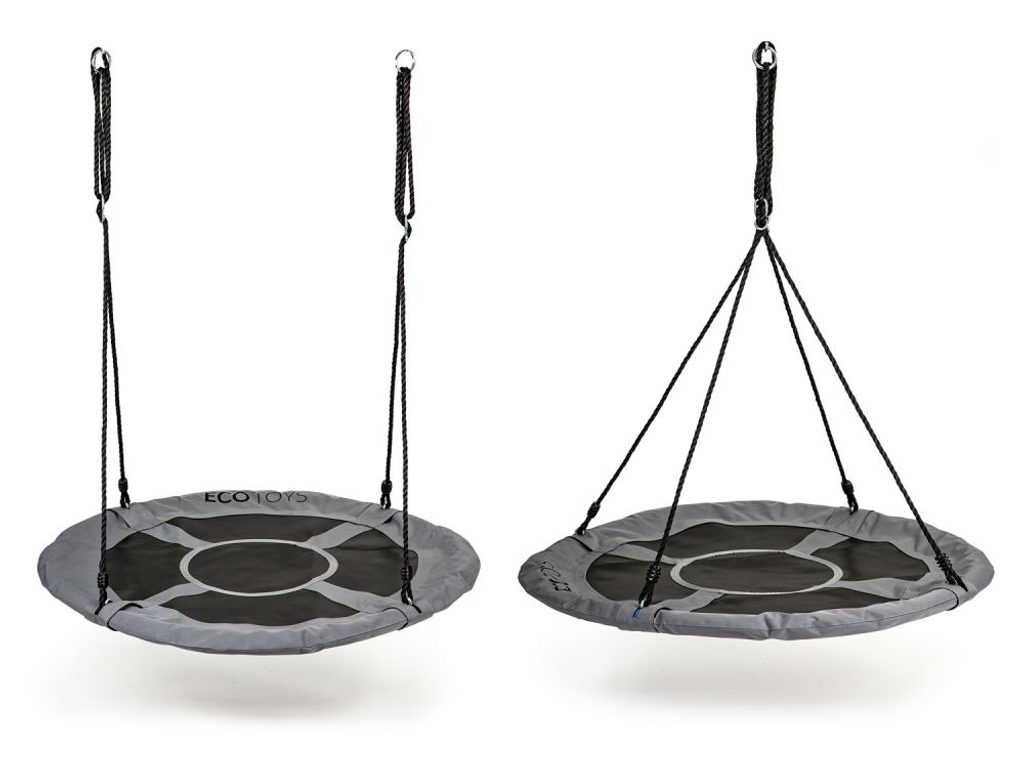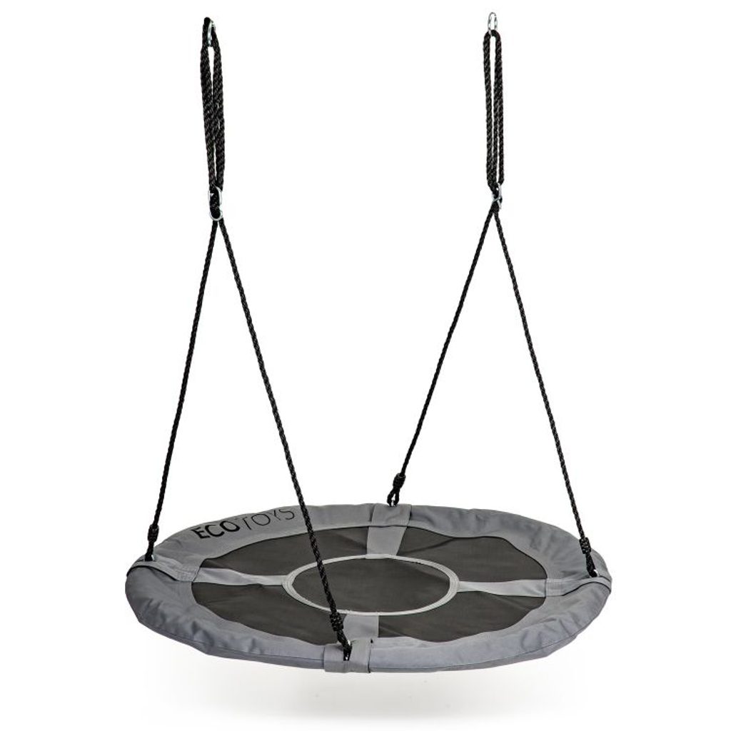 Ecotoys dětská houpačka Čapí hnízdo šedá je určena pro děti od 3 let věku. Je opatřena širokým sedadlem o průměru 100 cm vyrobeného z odolného barevného polyesteru. Závěsy jsou nastavitelné až do délky 150 cm a ukotvují se pomocí kovových šroubů. Velmi snadná montáž.