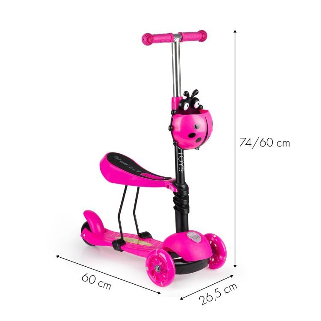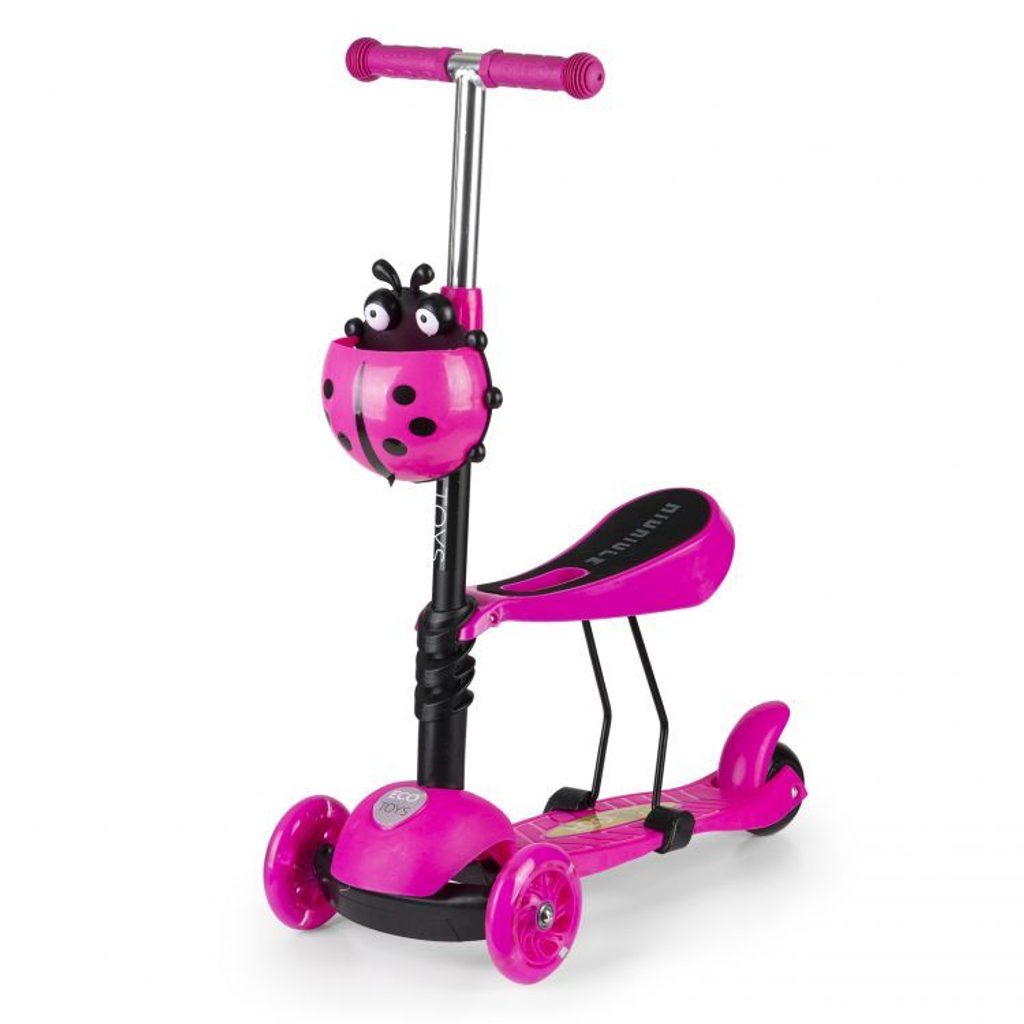 Dětská balanční koloběžka Ecotoys se svítícími koly a demontovatelným sedátkem. Koloběžku lze tak využít i jako odrážedlo. Je osazena tichými protiskluzovými koly s LED světly, které svítí během jízdy. Zatáčení probíhá na principu pohybu těla -nakláněním. Řídítka mají nastavitelnou výšku a protiskluzovou úpravu rukojeťí. V zadní části je umístěn blatník, který slouží jako nožní brzda. Koloběžka je určena pro děti od 3 let věku a 25 kg hmotnosti.