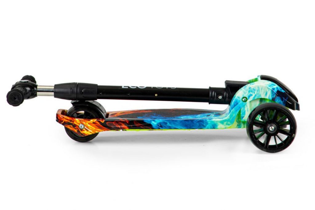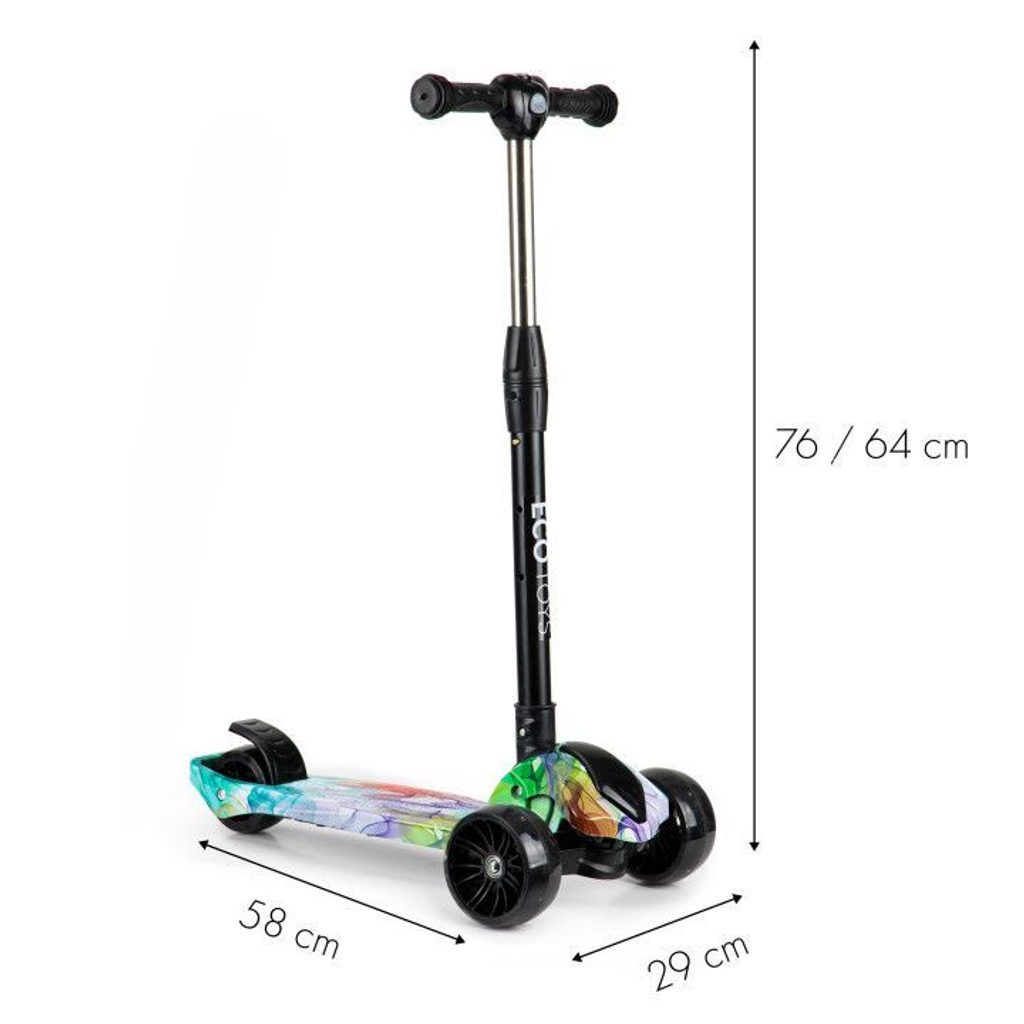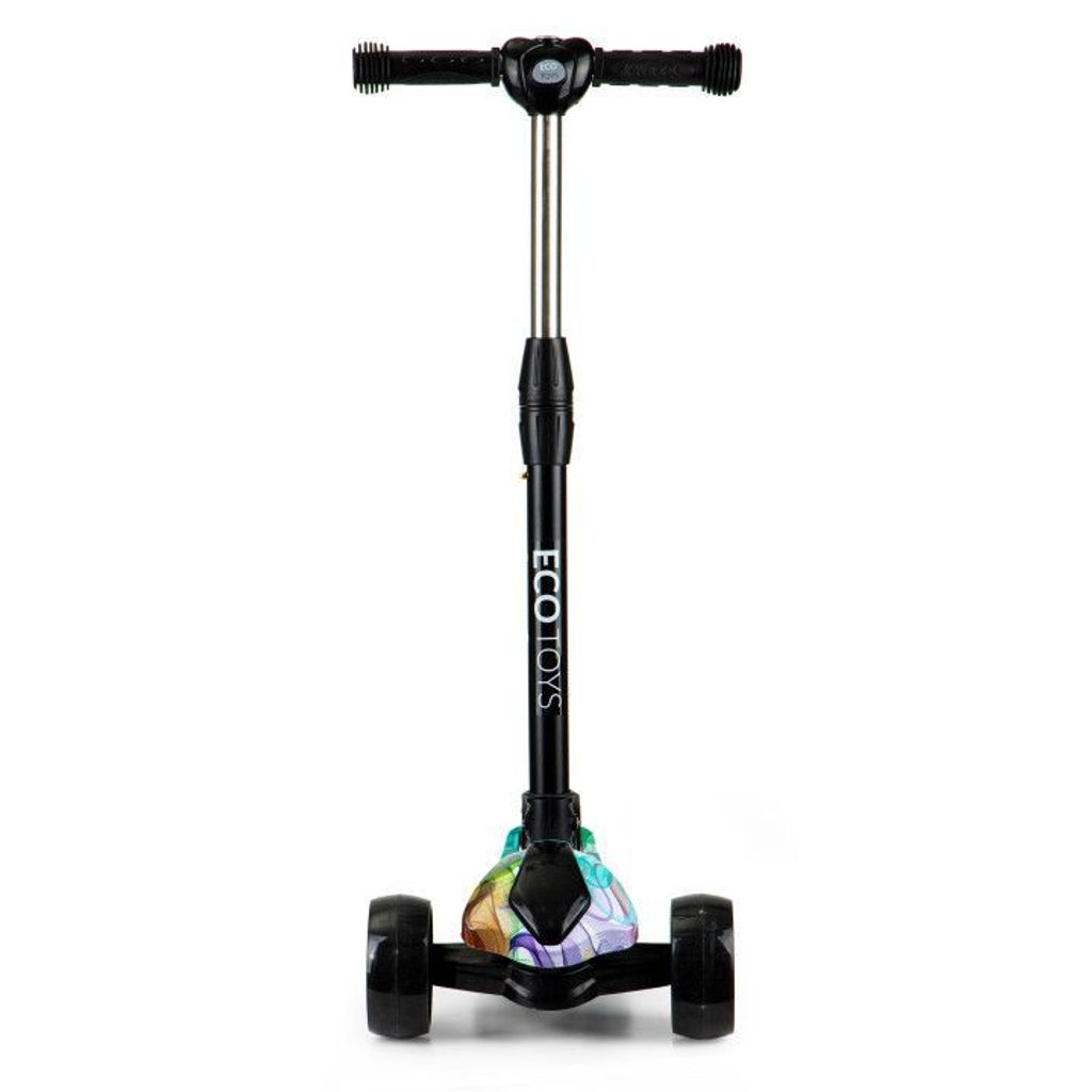 Dětská balanční koloběžka Ecotoys se svítícími koly. Je osazena tichými protiskluzovými koly s LED světly, které svítí během jízdy. Řídítka mají nastavitelnou výšku, protiskluzovou úpravu rukojeťí a zabudovaný kompas. Zatáčení probíhá na principu pohybu těla -nakláněním. V zadní části je umístěn blatník, který slouží jako nožní brzda. Koloběžka je určena pro děti od 3 let věku a 25 kg hmotnosti.