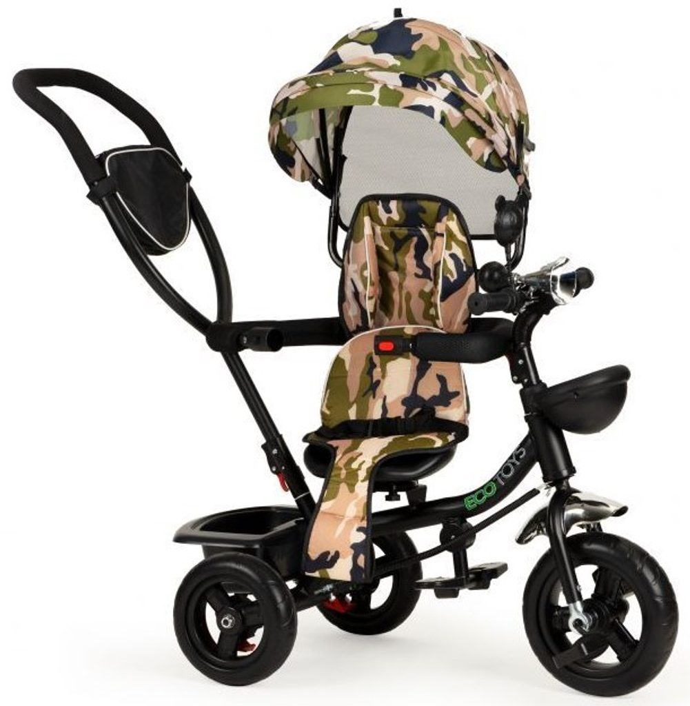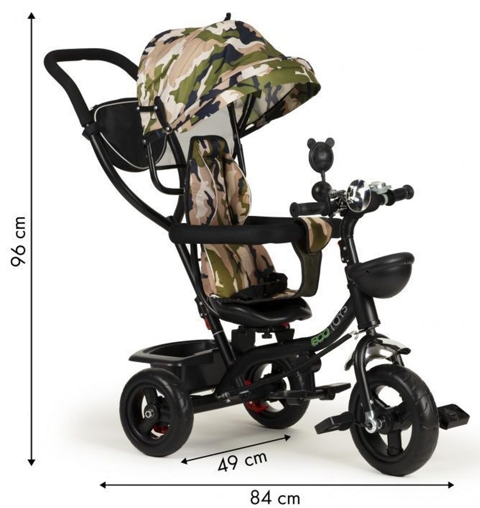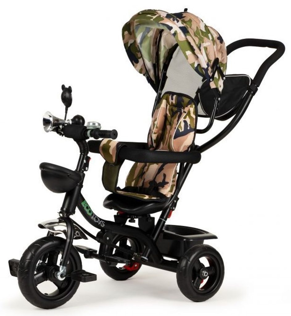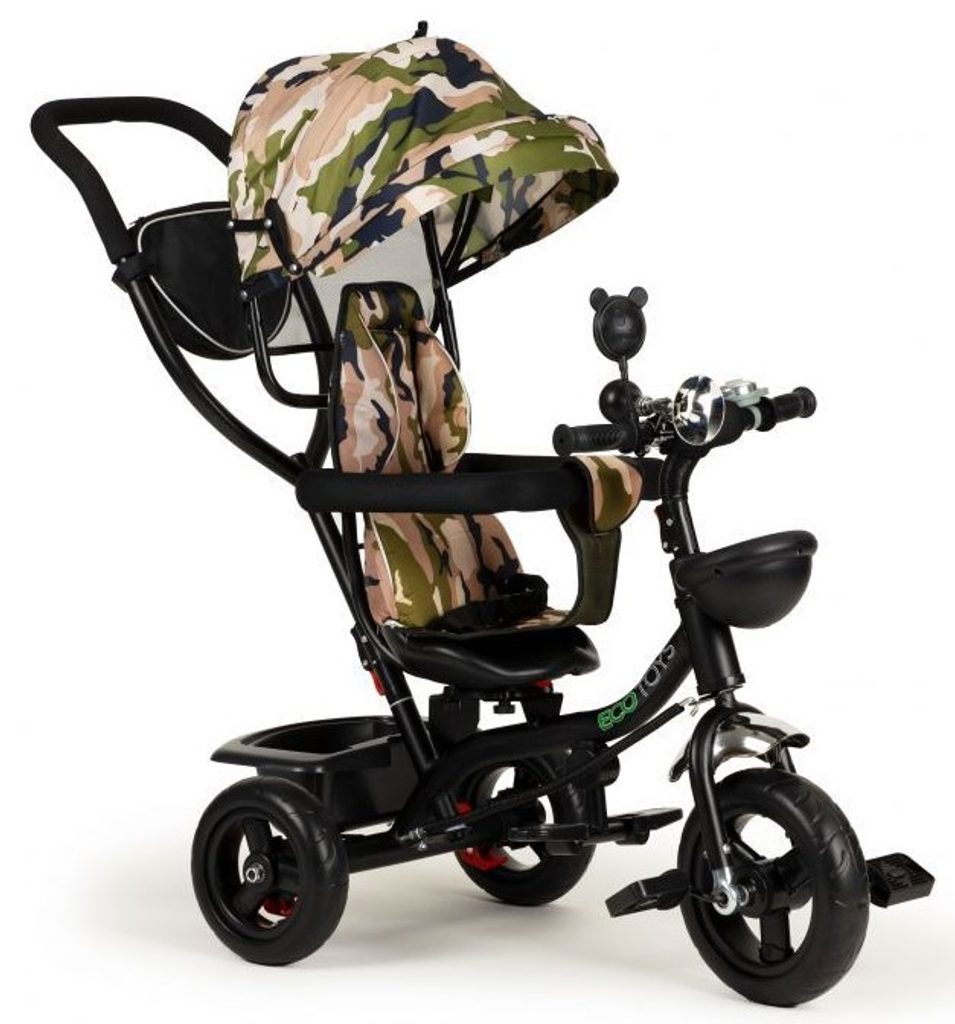 Dětská tříkolka Ecotoys 2v1 s otočným sedadlem. Je určena pro děti od 1 do 5 let. Vybavena praktickou odnímatelnou stříškou proti slunci a dešti. V zadní části je umístěn velký koš na hračky, v přední části potom menší košík. Tříkolka má pevnou ocelovou konstrukci a odolná gumová kola usazená v pevných plastových ráfcích. Madlo a bezpečnostní pásy zabraňují vypadnutí dítěte z kočárku. Na řídítkách je zvoneček a veselé zrcátko. Pro větší bezpečnost mohou tříkolku řídit i rodiče a zadní kola mají 2 nezávislé brzdy. Sedadlo lze otočit o 360° a to ve směru jízdy nebo čelem k rodiči a navíc usnadní nastupování nejmladším dětem.