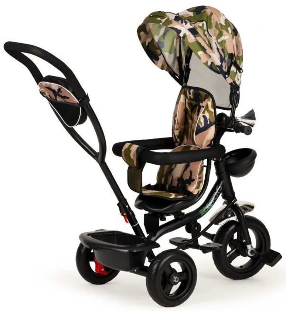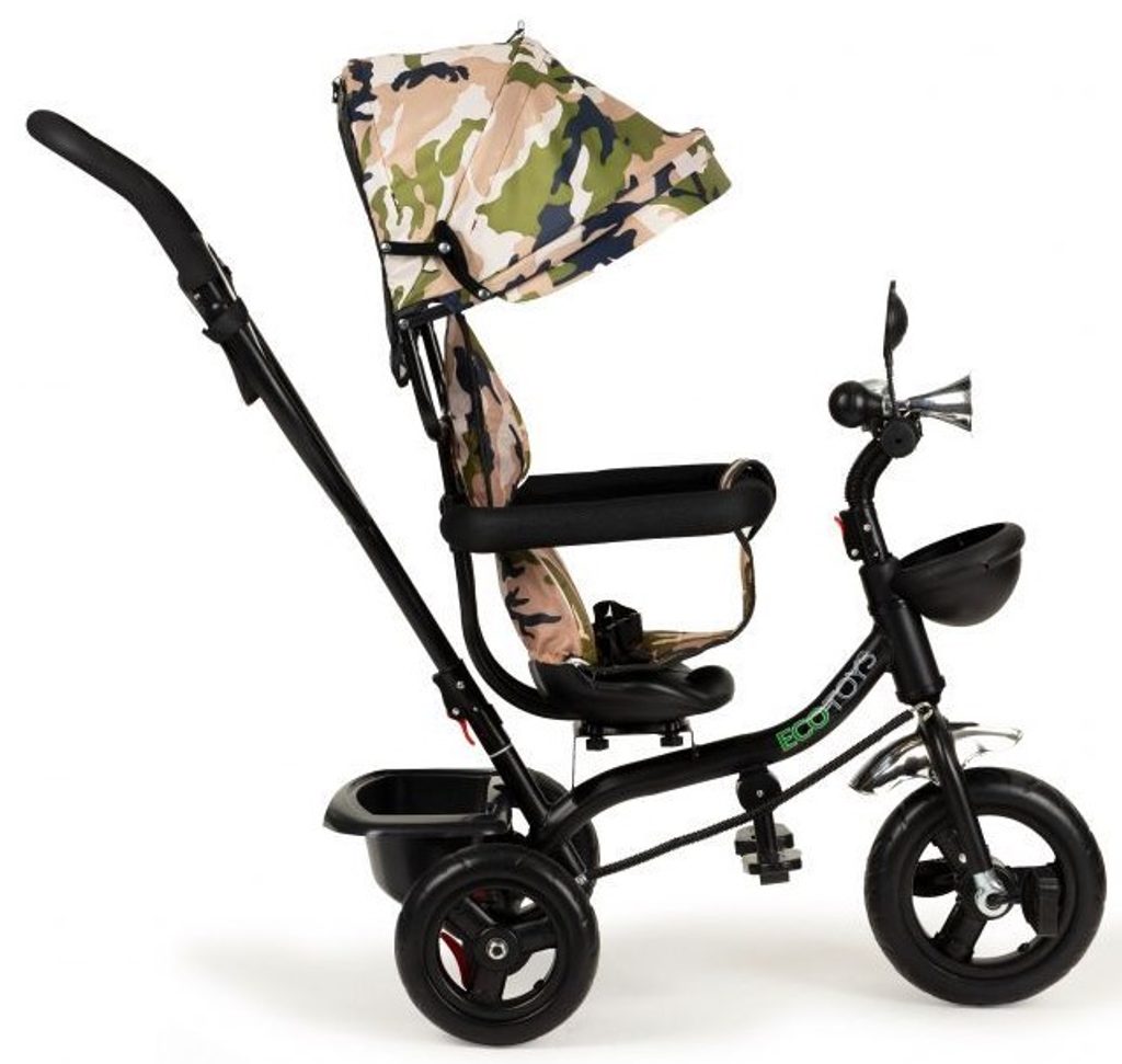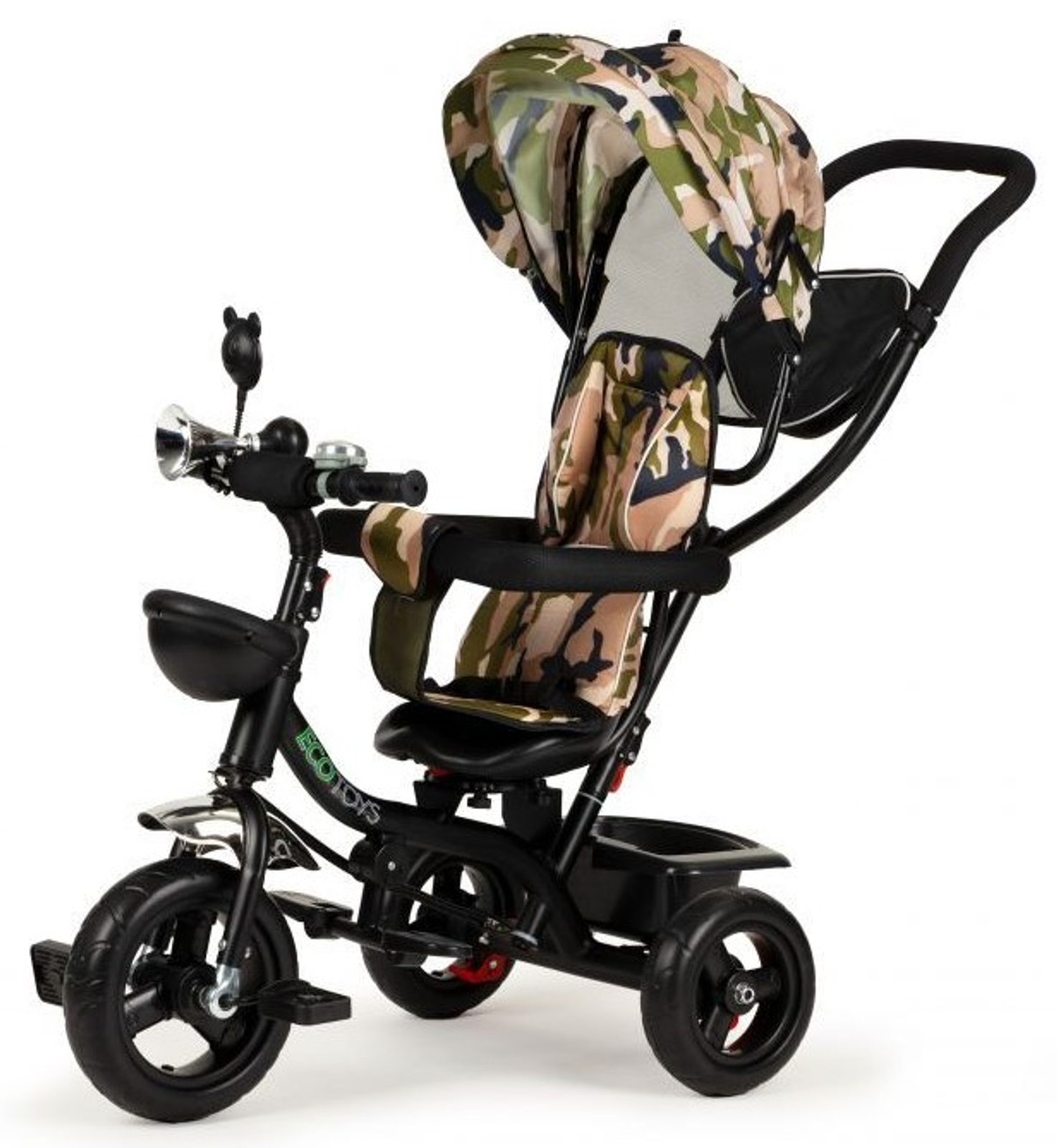 Dětská tříkolka Ecotoys 2v1 s otočným sedadlem. Je určena pro děti od 1 do 5 let. Vybavena praktickou odnímatelnou stříškou proti slunci a dešti. V zadní části je umístěn velký koš na hračky, v přední části potom menší košík. Tříkolka má pevnou ocelovou konstrukci a odolná gumová kola usazená v pevných plastových ráfcích. Madlo a bezpečnostní pásy zabraňují vypadnutí dítěte z kočárku. Na řídítkách je zvoneček a veselé zrcátko. Pro větší bezpečnost mohou tříkolku řídit i rodiče a zadní kola mají 2 nezávislé brzdy. Sedadlo lze otočit o 360° a to ve směru jízdy nebo čelem k rodiči a navíc usnadní nastupování nejmladším dětem.