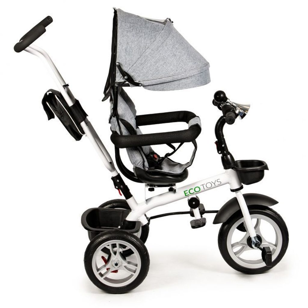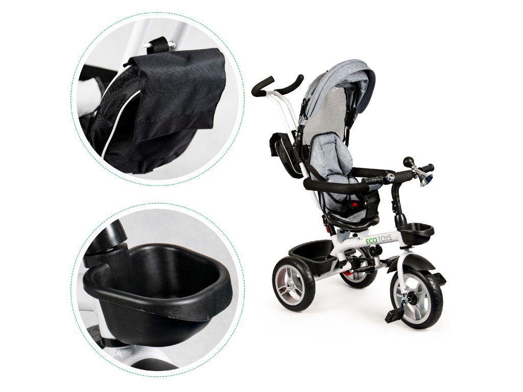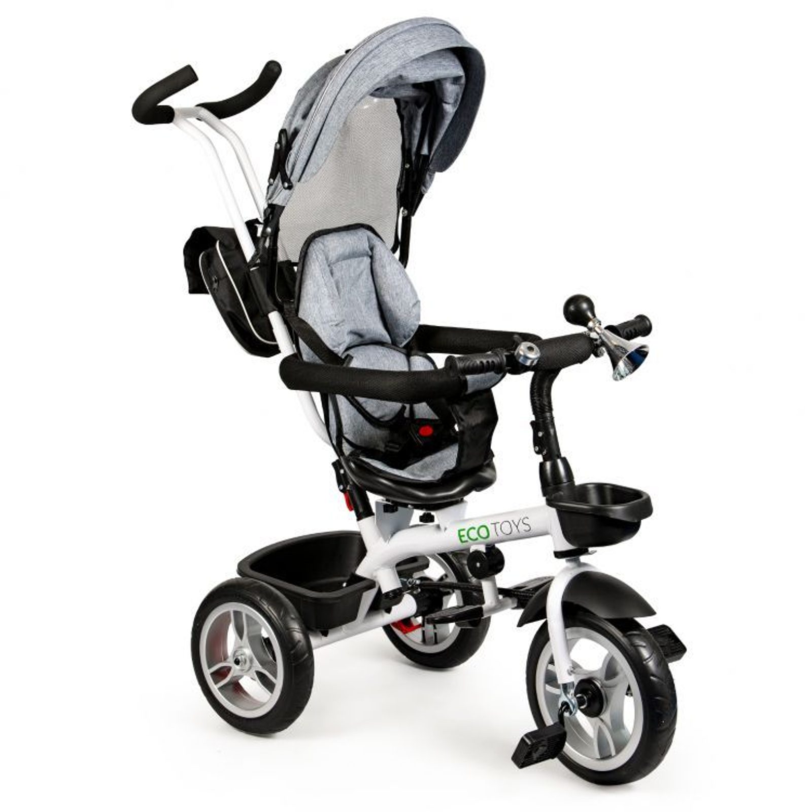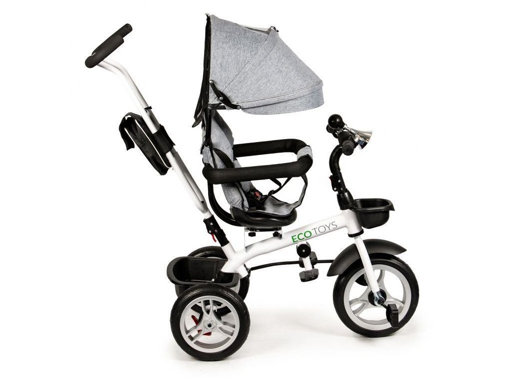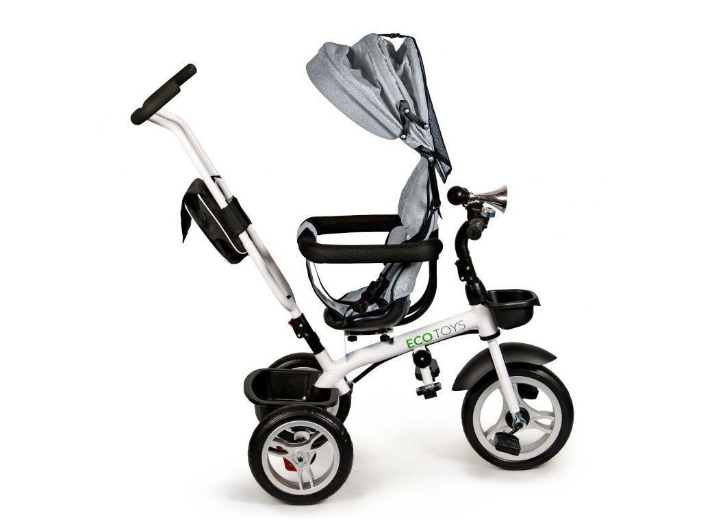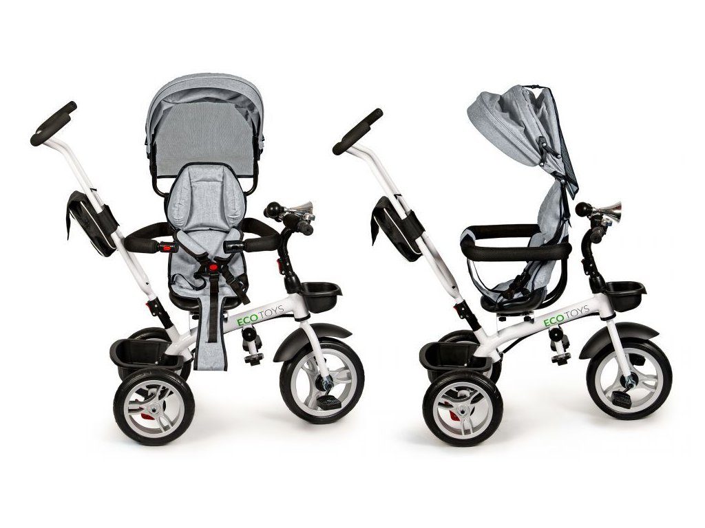 Dětská tříkolka Ecotoys 2v1 s otočným sedadlem je určena pro děti od 1 do 5 let. Vybavena praktickou odnímatelnou stříškou proti slunci a dešti. V zadní části je umístěn velký koš na hračky, v přední části potom menší košík. Tříkolka má pevnou ocelovou konstrukci a odolná EVA kola usazená v pevných plastových ráfcích. Madlo a 5 bodové bezpečnostní pásy zabraňují vypadnutí dítěte z kočárku. Na řídítkách je zvoneček a klakson. Pro větší bezpečnost mohou tříkolku řídit i rodiče a zadní kola mají 2 nezávislé brzdy. Sedadlo lze otočit o 360° a to ve směru jízdy nebo čelem k rodiči a navíc usnadní nastupování nejmladším dětem.