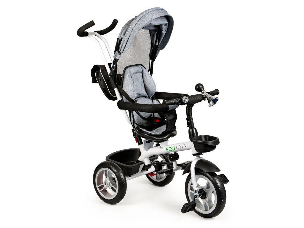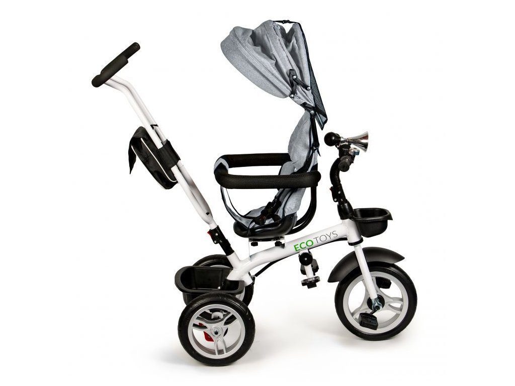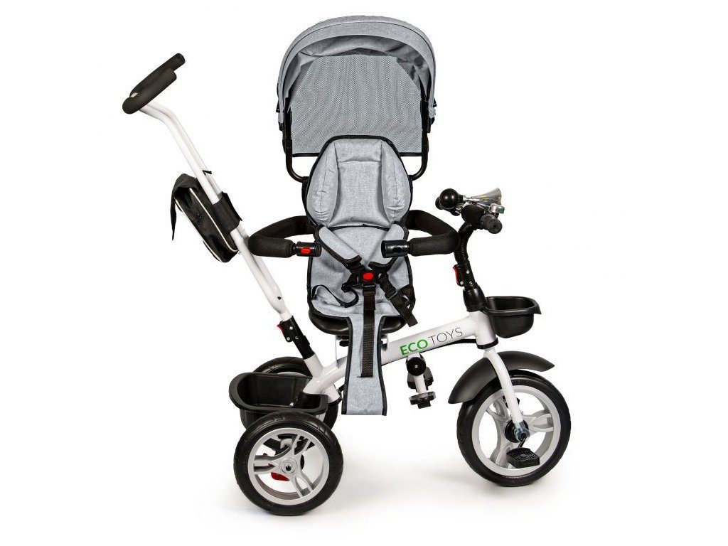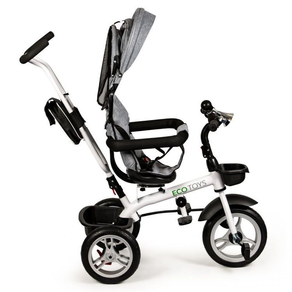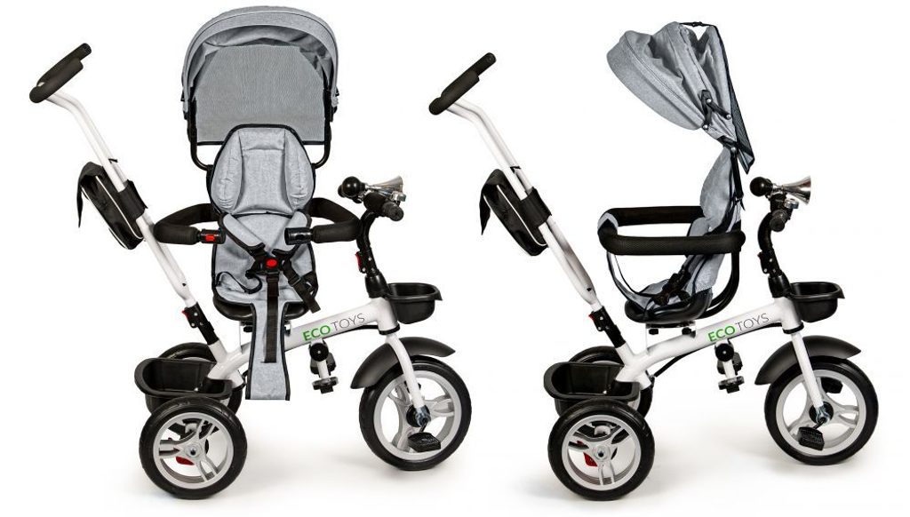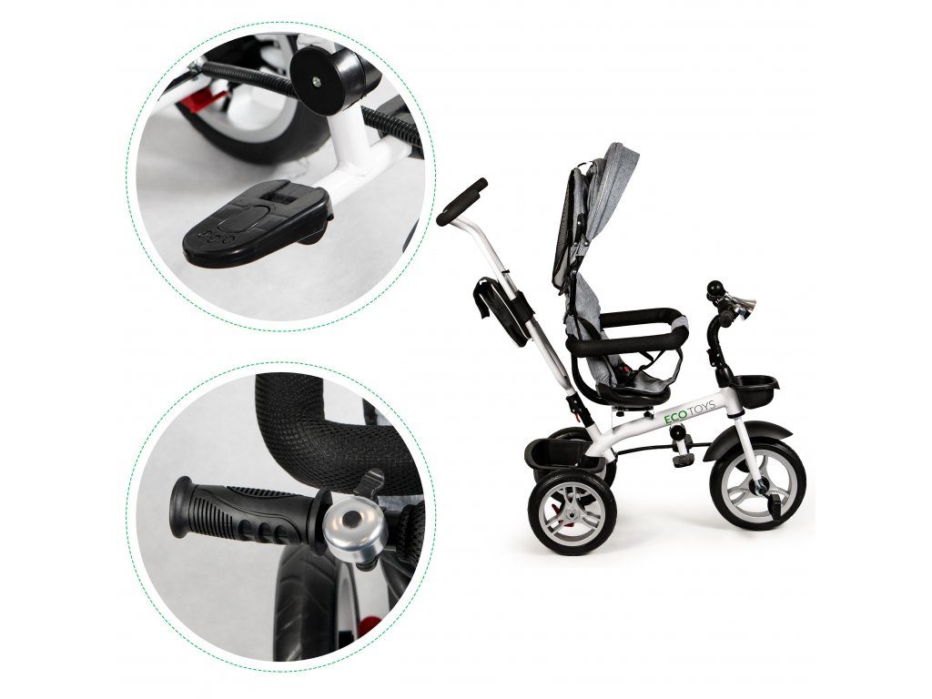 Dětská tříkolka Ecotoys 2v1 s otočným sedadlem je určena pro děti od 1 do 5 let. Vybavena praktickou odnímatelnou stříškou proti slunci a dešti. V zadní části je umístěn velký koš na hračky, v přední části potom menší košík. Tříkolka má pevnou ocelovou konstrukci a odolná EVA kola usazená v pevných plastových ráfcích. Madlo a 5 bodové bezpečnostní pásy zabraňují vypadnutí dítěte z kočárku. Na řídítkách je zvoneček a klakson. Pro větší bezpečnost mohou tříkolku řídit i rodiče a zadní kola mají 2 nezávislé brzdy. Sedadlo lze otočit o 360° a to ve směru jízdy nebo čelem k rodiči a navíc usnadní nastupování nejmladším dětem.