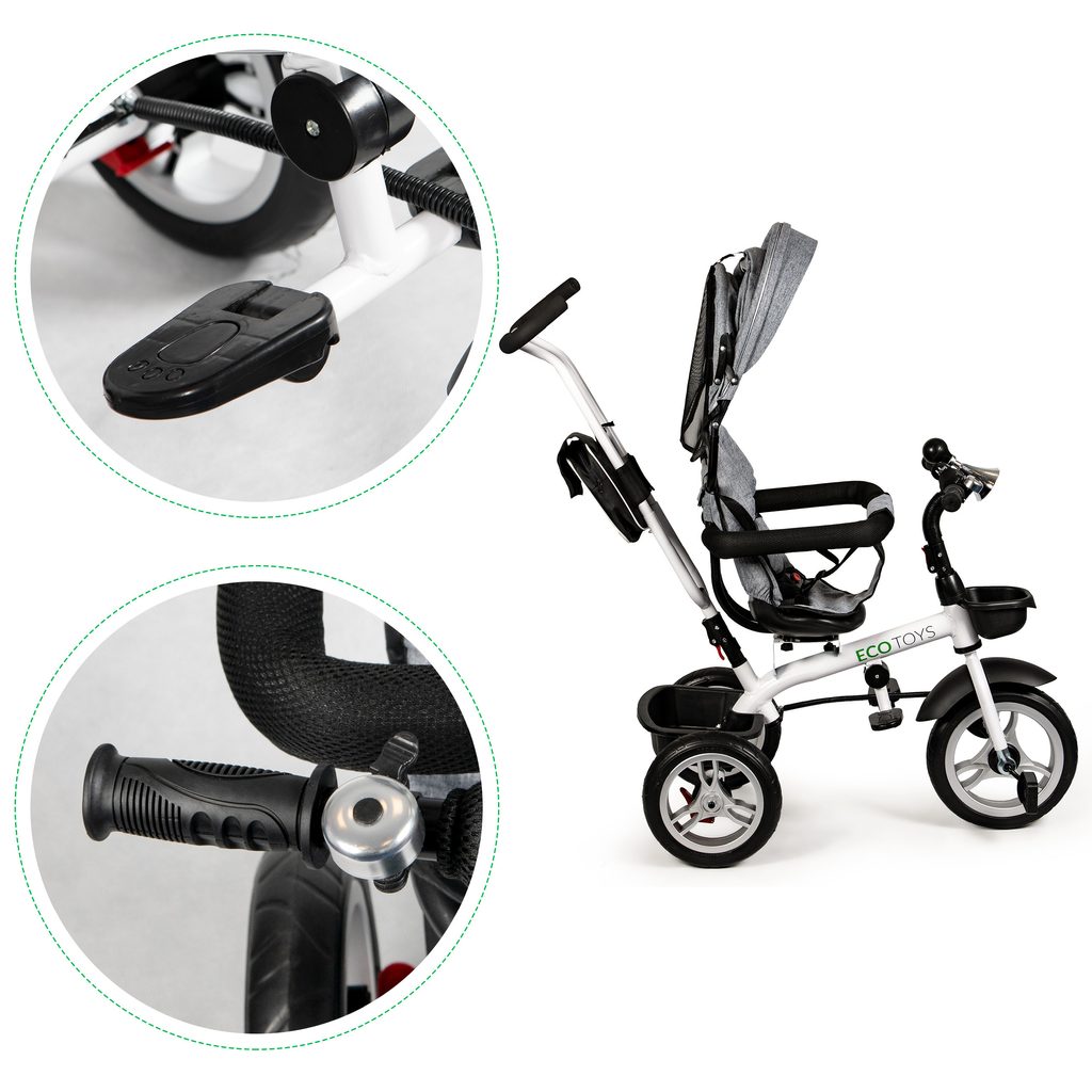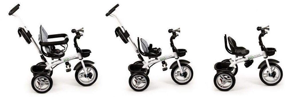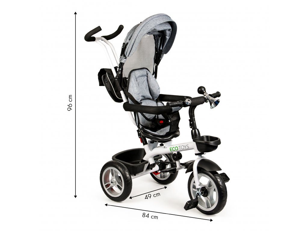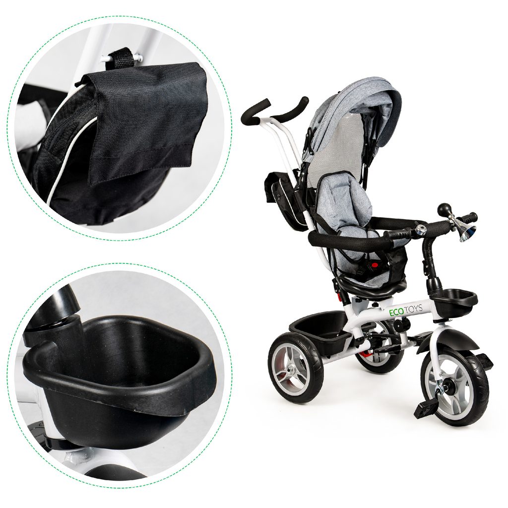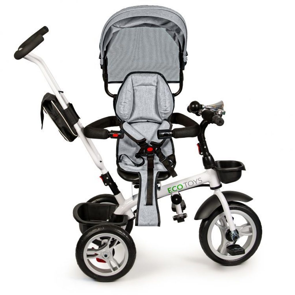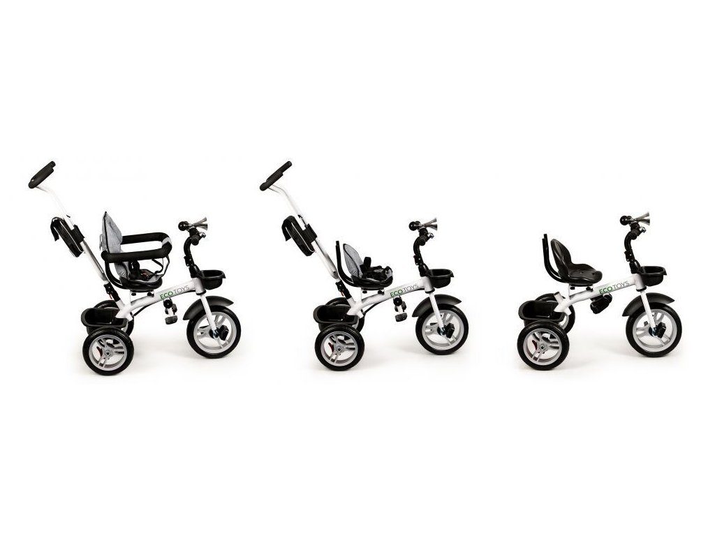 Dětská tříkolka Ecotoys 2v1 s otočným sedadlem je určena pro děti od 1 do 5 let. Vybavena praktickou odnímatelnou stříškou proti slunci a dešti. V zadní části je umístěn velký koš na hračky, v přední části potom menší košík. Tříkolka má pevnou ocelovou konstrukci a odolná EVA kola usazená v pevných plastových ráfcích. Madlo a 5 bodové bezpečnostní pásy zabraňují vypadnutí dítěte z kočárku. Na řídítkách je zvoneček a klakson. Pro větší bezpečnost mohou tříkolku řídit i rodiče a zadní kola mají 2 nezávislé brzdy. Sedadlo lze otočit o 360° a to ve směru jízdy nebo čelem k rodiči a navíc usnadní nastupování nejmladším dětem.