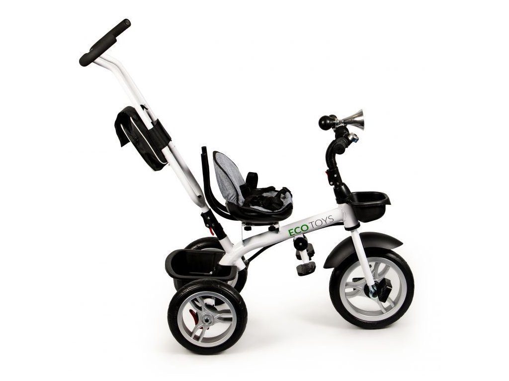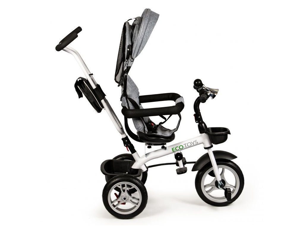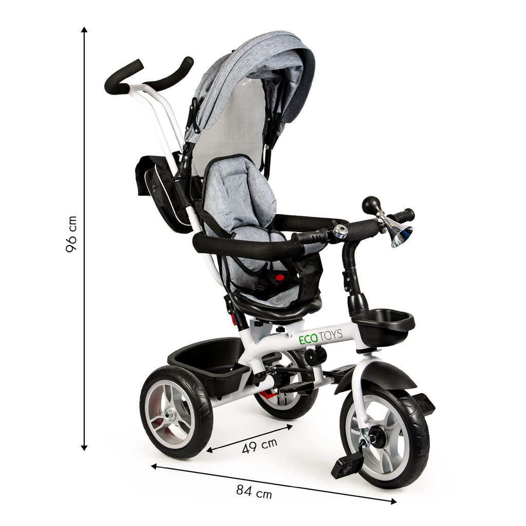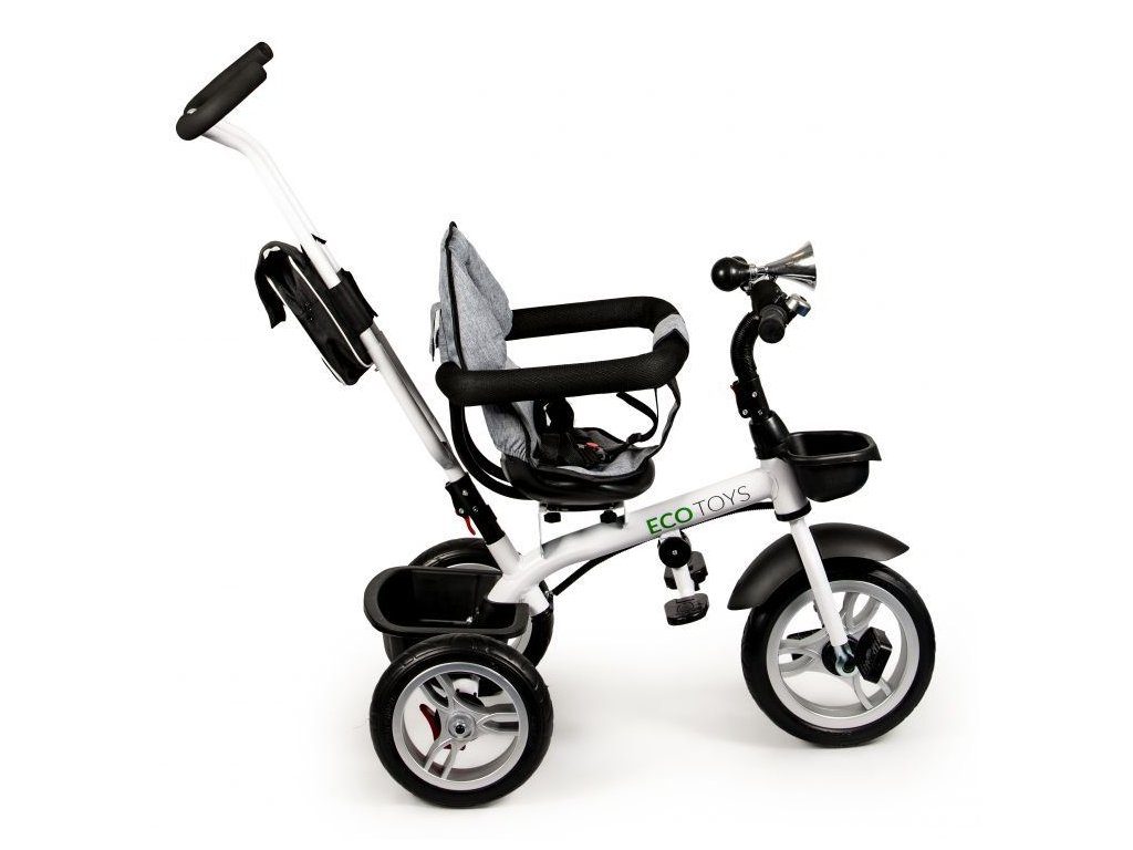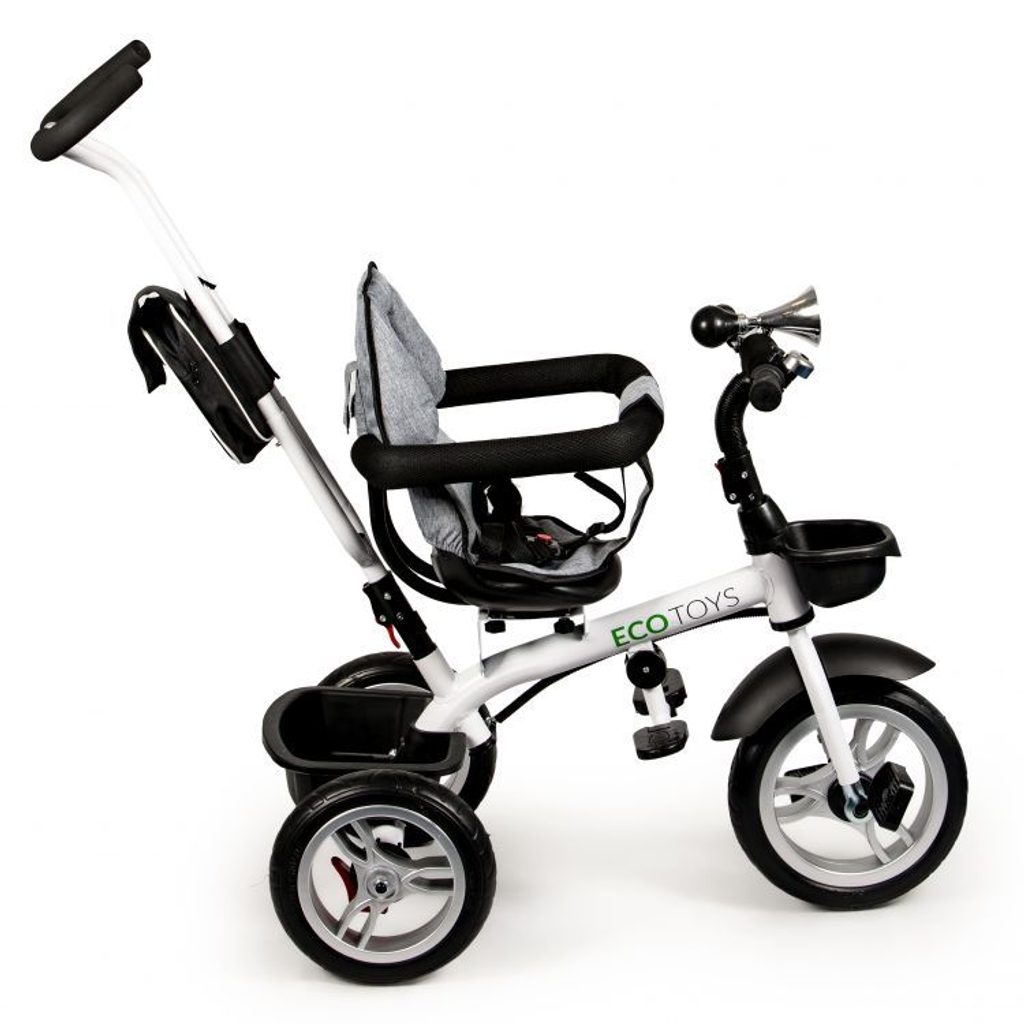 Dětská tříkolka Ecotoys 2v1 s otočným sedadlem je určena pro děti od 1 do 5 let. Vybavena praktickou odnímatelnou stříškou proti slunci a dešti. V zadní části je umístěn velký koš na hračky, v přední části potom menší košík. Tříkolka má pevnou ocelovou konstrukci a odolná EVA kola usazená v pevných plastových ráfcích. Madlo a 5 bodové bezpečnostní pásy zabraňují vypadnutí dítěte z kočárku. Na řídítkách je zvoneček a klakson. Pro větší bezpečnost mohou tříkolku řídit i rodiče a zadní kola mají 2 nezávislé brzdy. Sedadlo lze otočit o 360° a to ve směru jízdy nebo čelem k rodiči a navíc usnadní nastupování nejmladším dětem.