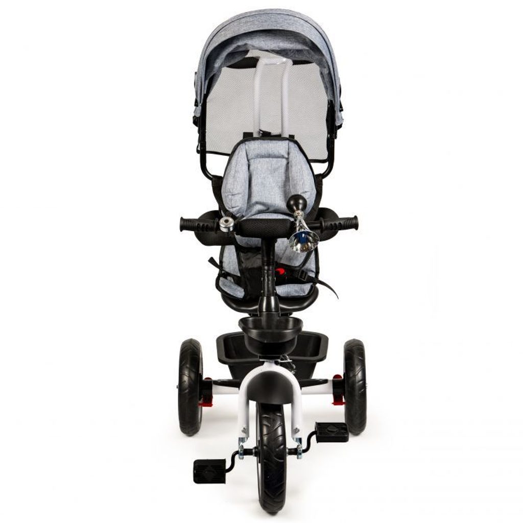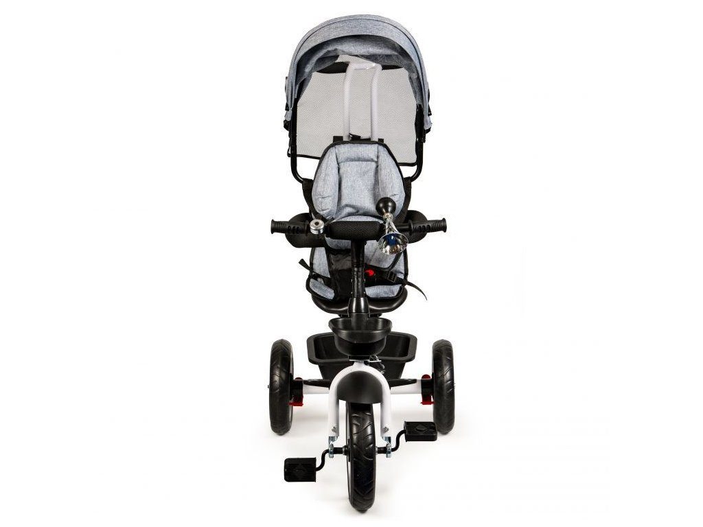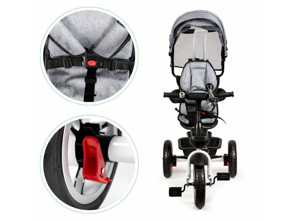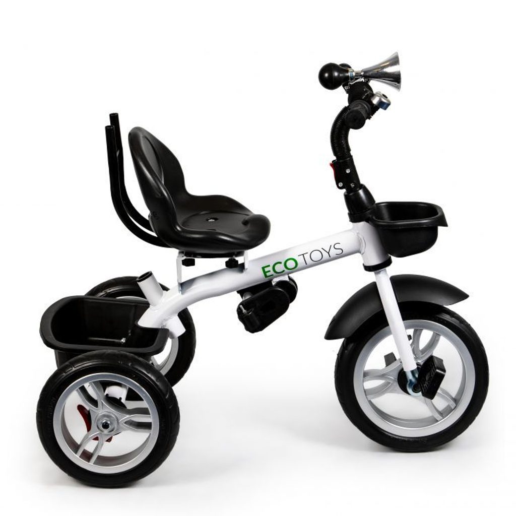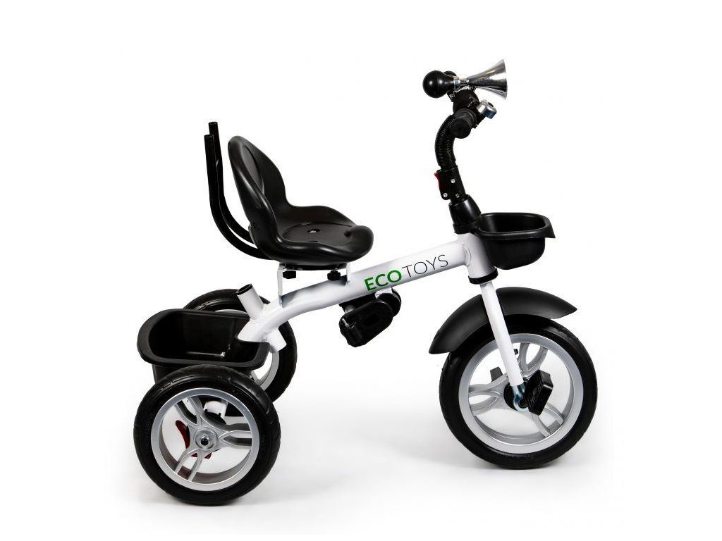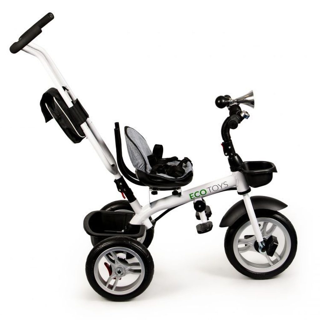 Dětská tříkolka Ecotoys 2v1 s otočným sedadlem je určena pro děti od 1 do 5 let. Vybavena praktickou odnímatelnou stříškou proti slunci a dešti. V zadní části je umístěn velký koš na hračky, v přední části potom menší košík. Tříkolka má pevnou ocelovou konstrukci a odolná EVA kola usazená v pevných plastových ráfcích. Madlo a 5 bodové bezpečnostní pásy zabraňují vypadnutí dítěte z kočárku. Na řídítkách je zvoneček a klakson. Pro větší bezpečnost mohou tříkolku řídit i rodiče a zadní kola mají 2 nezávislé brzdy. Sedadlo lze otočit o 360° a to ve směru jízdy nebo čelem k rodiči a navíc usnadní nastupování nejmladším dětem.