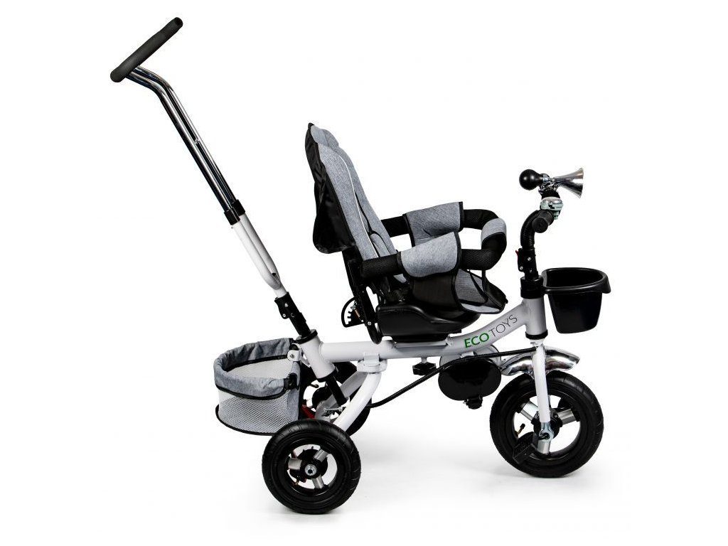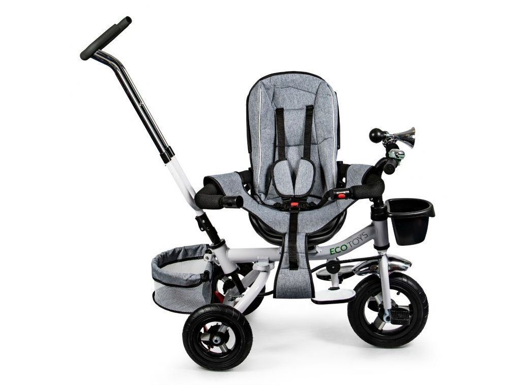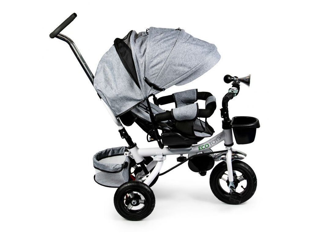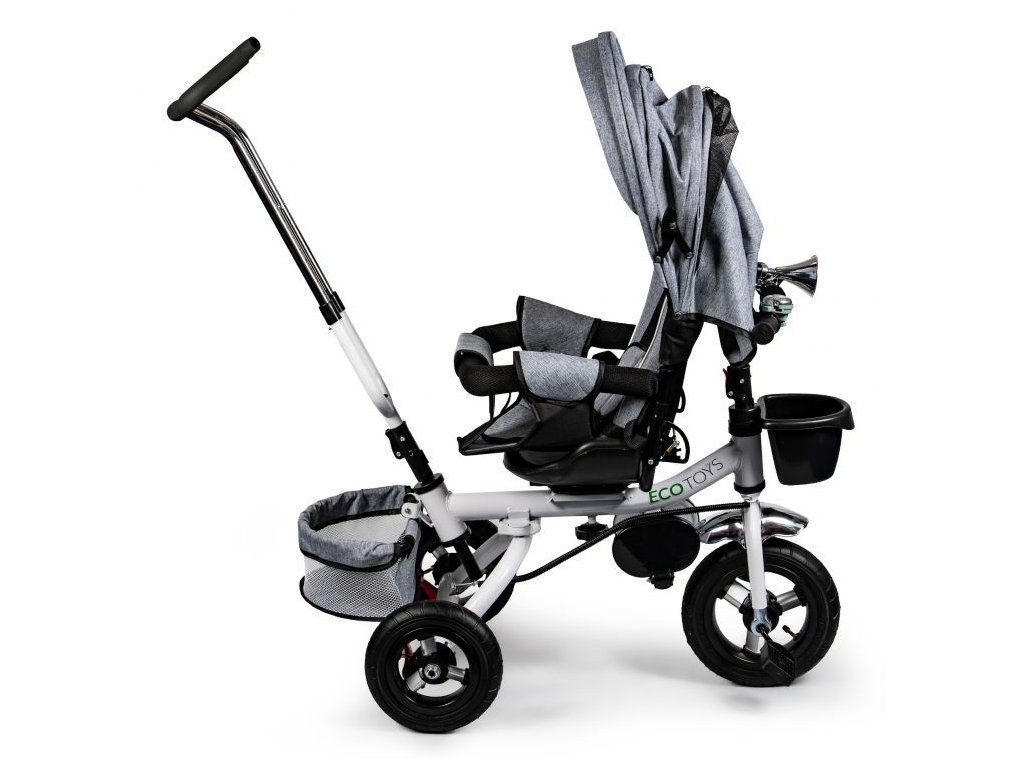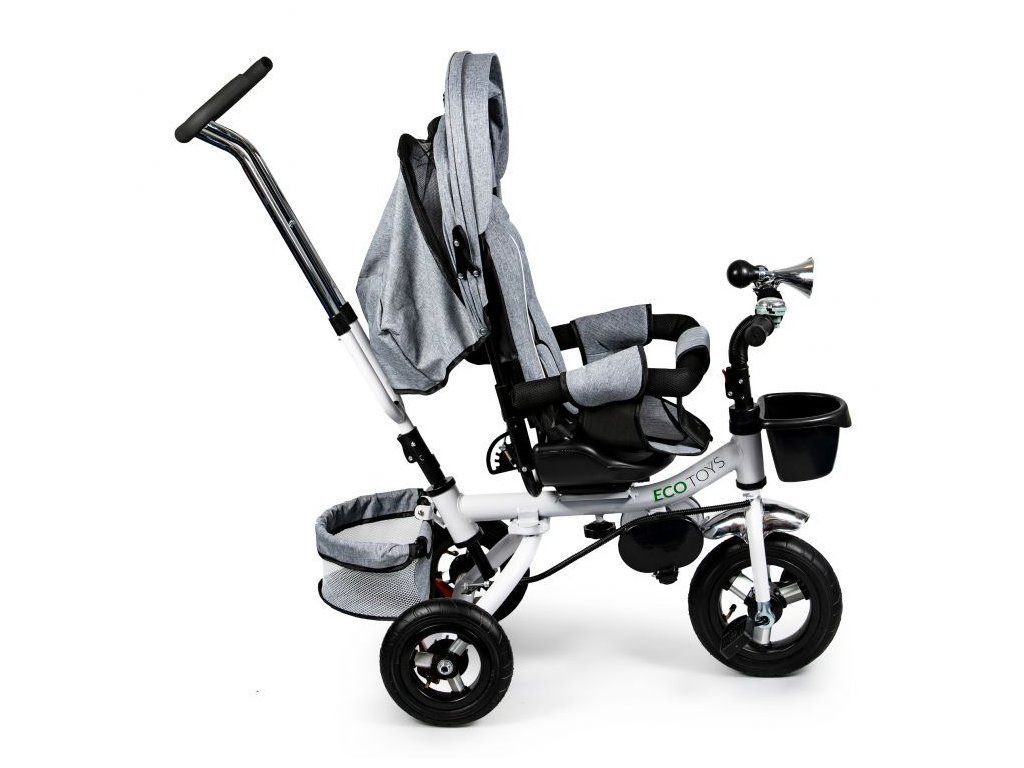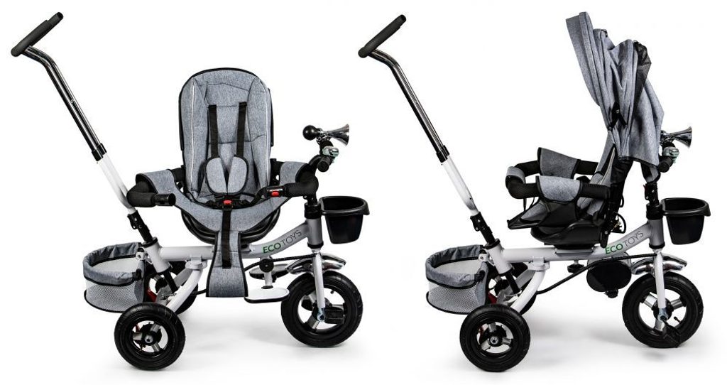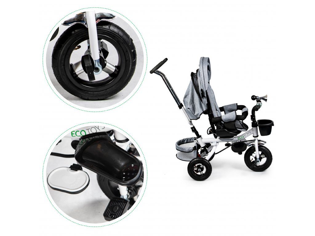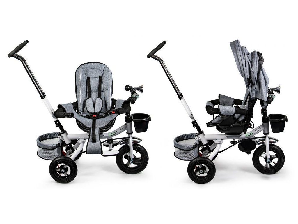 Dětská tříkolka Ecotoys s otočným sedadlem. Je určena pro děti od 1 do 5 let. Vybavena praktickou odnímatelnou stříškou proti slunci a dešti. V zadní části je umístěn velký a v přední menší košna hračky. Pokud dítě nedosáhne na pedály, může si opřít nohy o sklopné stupačky. Tříkolka má robustní ocelovou konstrukci a odolná kola usazená v pevných plastových ráfcích. Madlo a 5bodové bezpečnostní pásy zabraňují vypadnutí dítěte z kočárku. Řídítka mají protiskluzové úchyty a je na nich umístěn efektní zvoneček. Pro větší bezpečnost mohou tříkolku řídit i rodiče pomocí vodící tyče, která je propojena s řídítky. Řídící tyč i stříšku lze odejmout. Sedátko lze otočit o 360° po směru jízdy nebo směrem k rodiči. Jednoduché složení zadních kol usnadní uskladnění a převoz tříkolky.