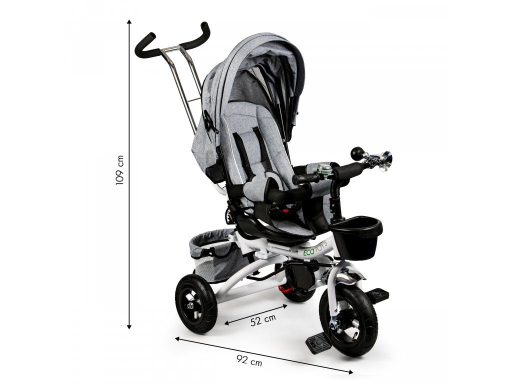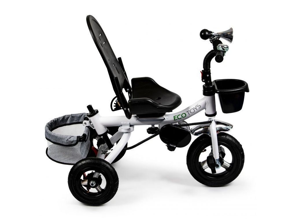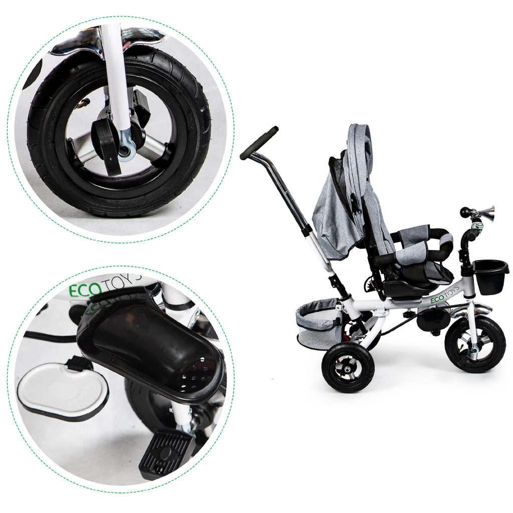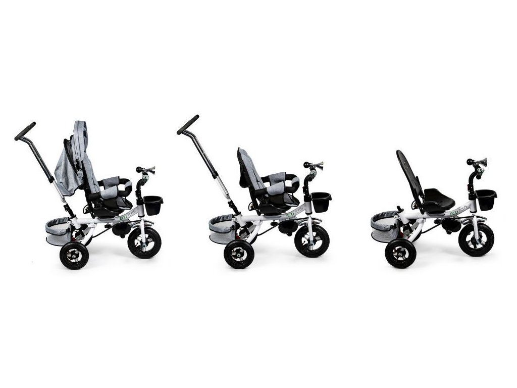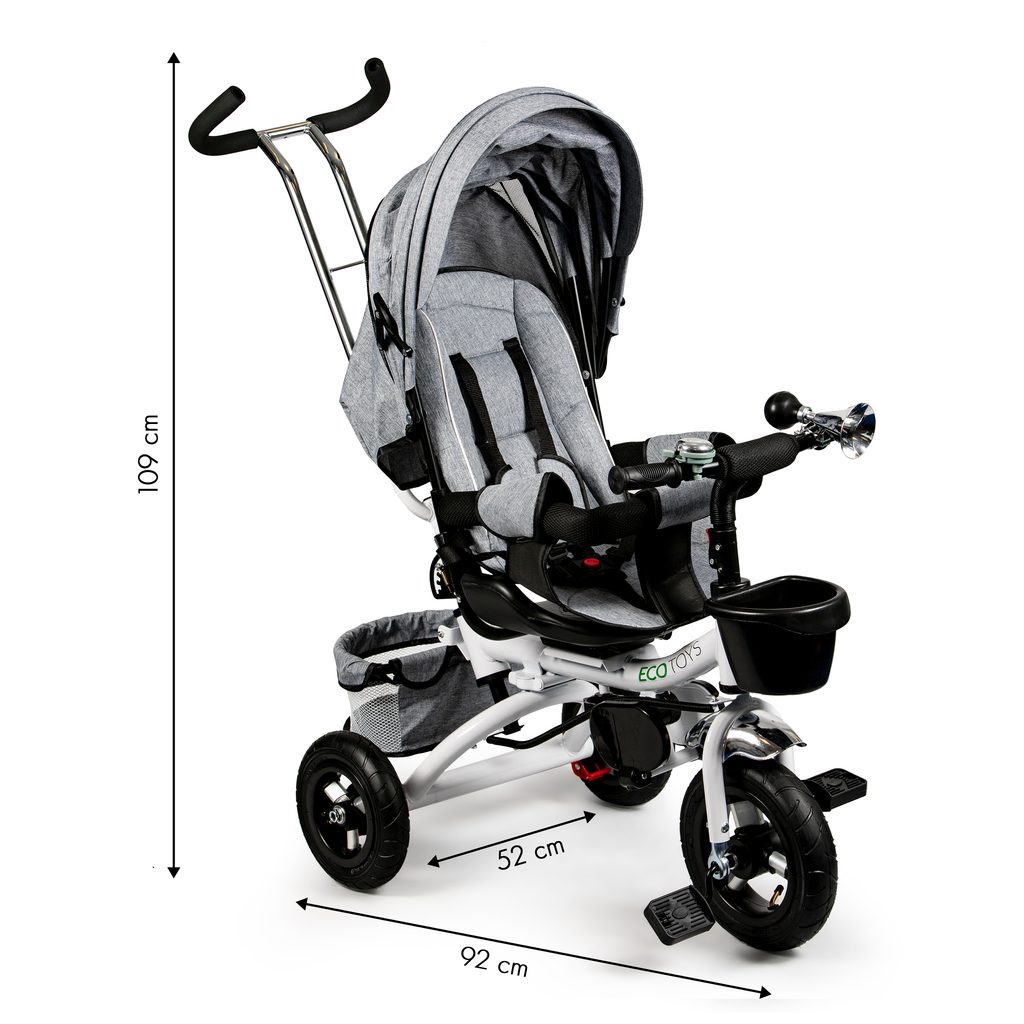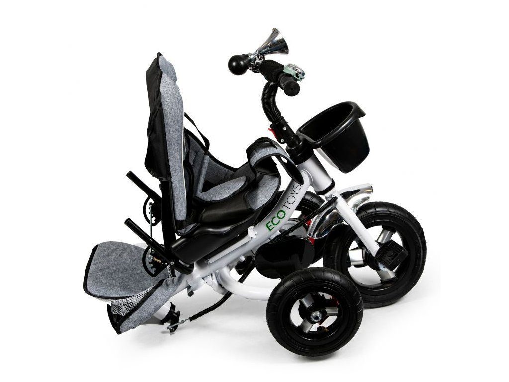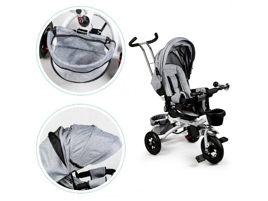 Dětská tříkolka Ecotoys s otočným sedadlem. Je určena pro děti od 1 do 5 let. Vybavena praktickou odnímatelnou stříškou proti slunci a dešti. V zadní části je umístěn velký a v přední menší košna hračky. Pokud dítě nedosáhne na pedály, může si opřít nohy o sklopné stupačky. Tříkolka má robustní ocelovou konstrukci a odolná kola usazená v pevných plastových ráfcích. Madlo a 5bodové bezpečnostní pásy zabraňují vypadnutí dítěte z kočárku. Řídítka mají protiskluzové úchyty a je na nich umístěn efektní zvoneček. Pro větší bezpečnost mohou tříkolku řídit i rodiče pomocí vodící tyče, která je propojena s řídítky. Řídící tyč i stříšku lze odejmout. Sedátko lze otočit o 360° po směru jízdy nebo směrem k rodiči. Jednoduché složení zadních kol usnadní uskladnění a převoz tříkolky.