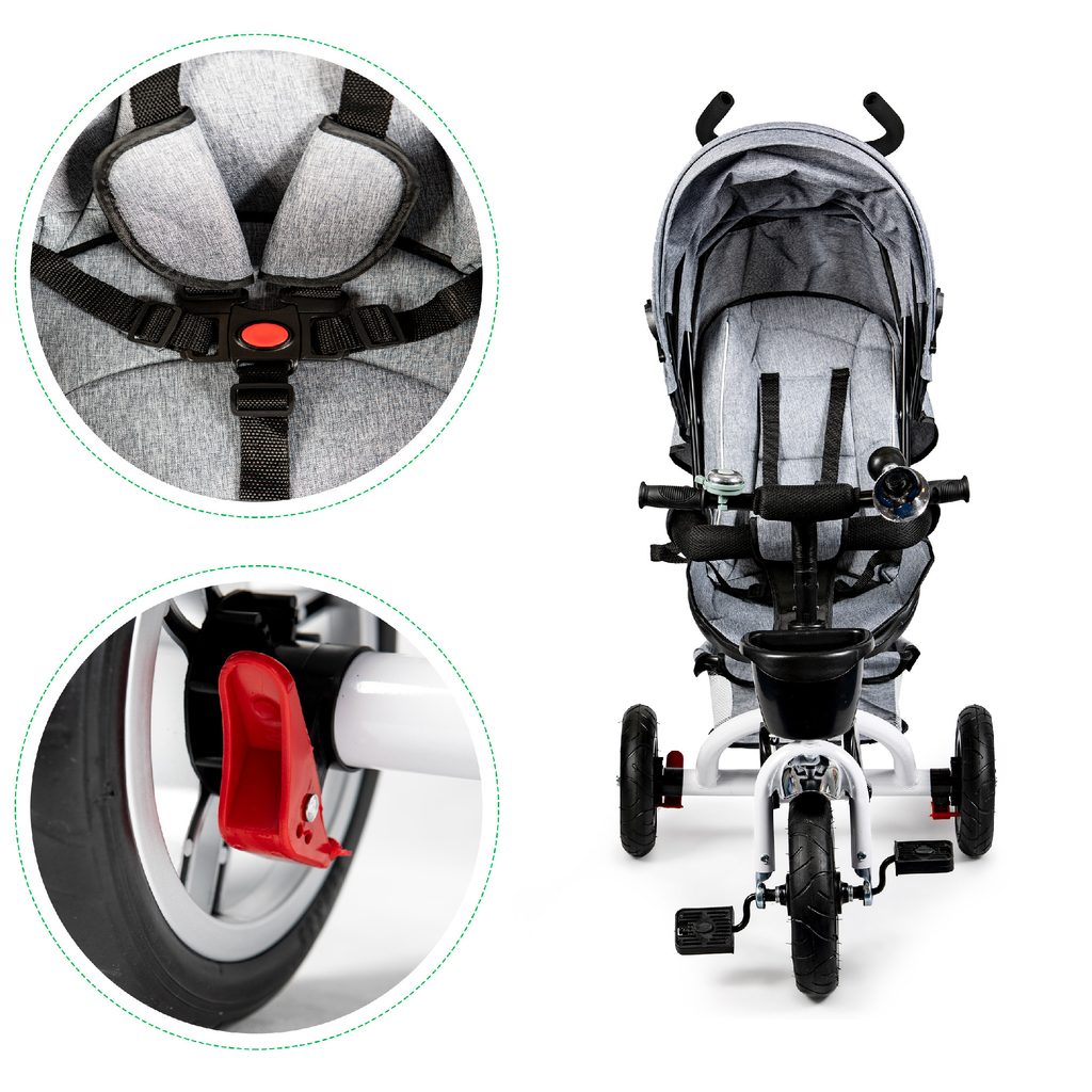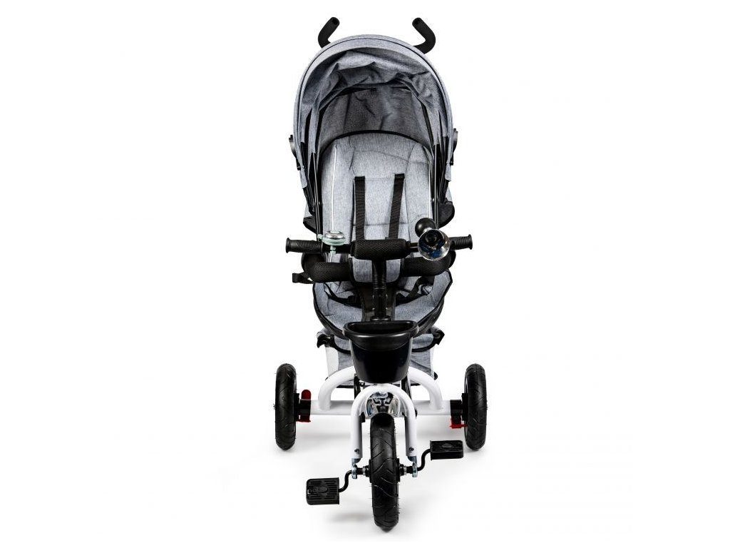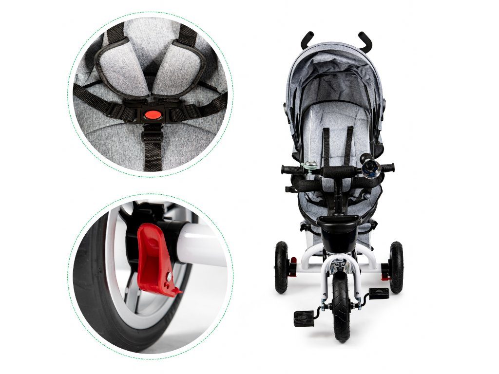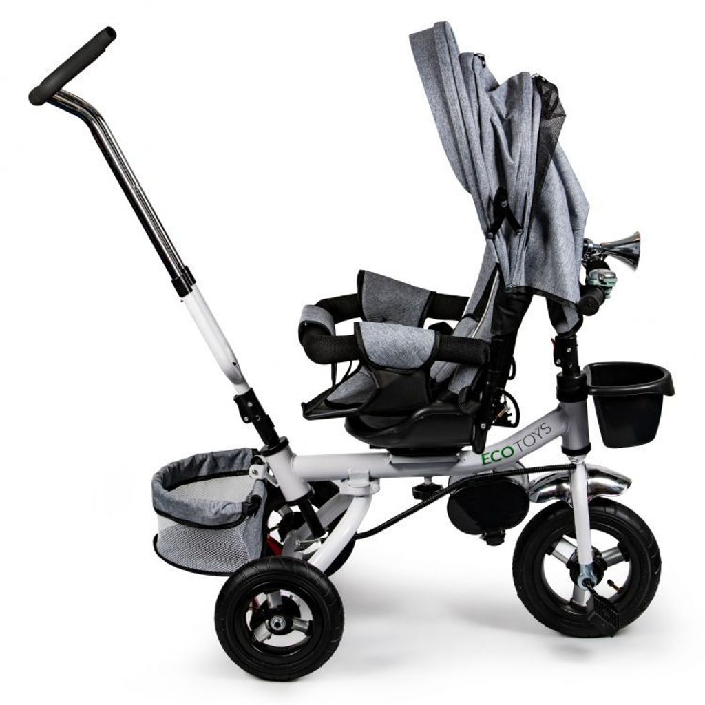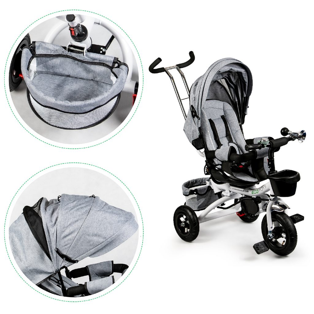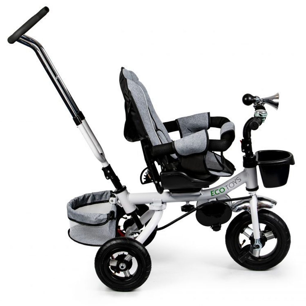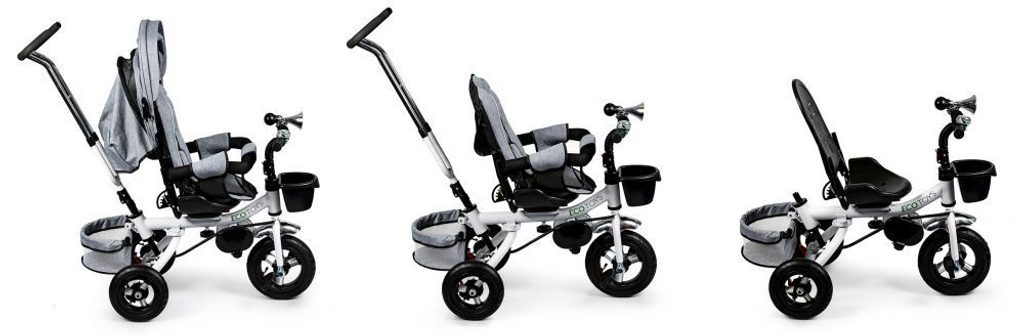 Dětská tříkolka Ecotoys s otočným sedadlem. Je určena pro děti od 1 do 5 let. Vybavena praktickou odnímatelnou stříškou proti slunci a dešti. V zadní části je umístěn velký a v přední menší košna hračky. Pokud dítě nedosáhne na pedály, může si opřít nohy o sklopné stupačky. Tříkolka má robustní ocelovou konstrukci a odolná kola usazená v pevných plastových ráfcích. Madlo a 5bodové bezpečnostní pásy zabraňují vypadnutí dítěte z kočárku. Řídítka mají protiskluzové úchyty a je na nich umístěn efektní zvoneček. Pro větší bezpečnost mohou tříkolku řídit i rodiče pomocí vodící tyče, která je propojena s řídítky. Řídící tyč i stříšku lze odejmout. Sedátko lze otočit o 360° po směru jízdy nebo směrem k rodiči. Jednoduché složení zadních kol usnadní uskladnění a převoz tříkolky.
