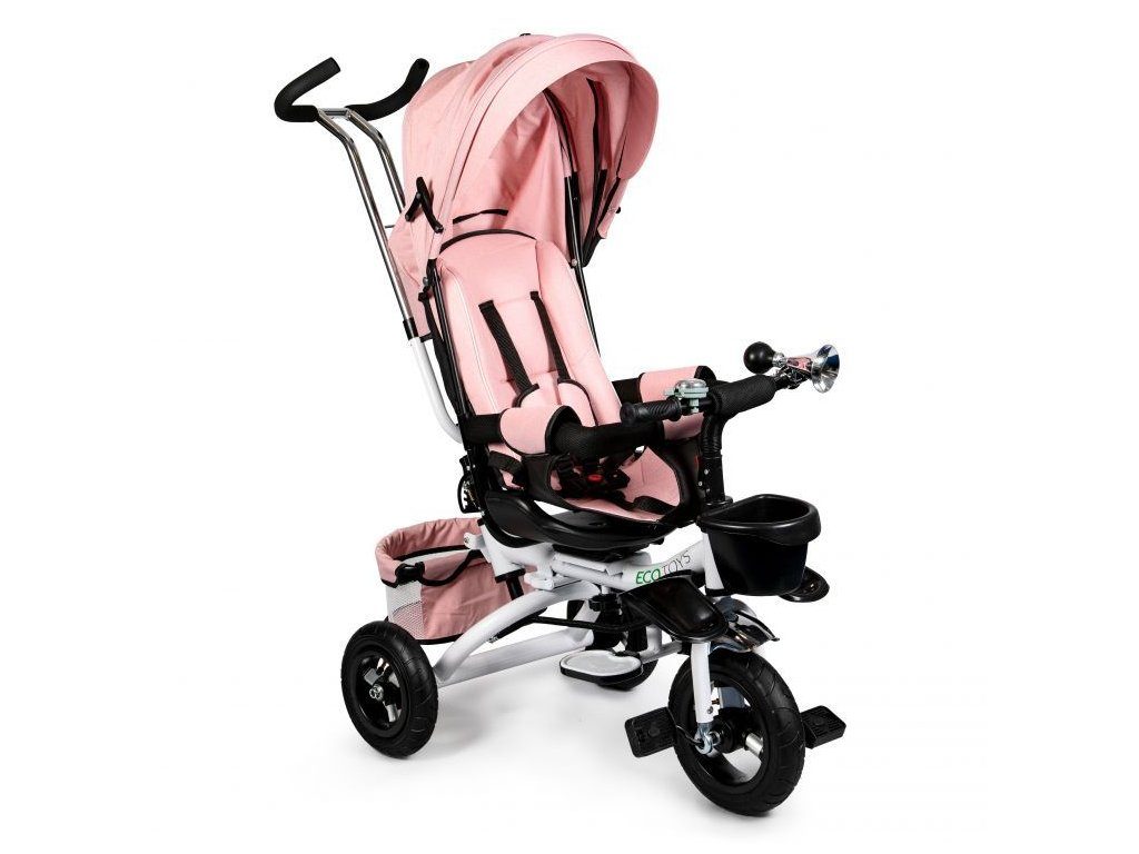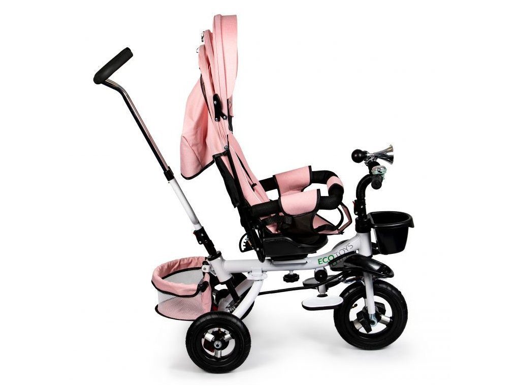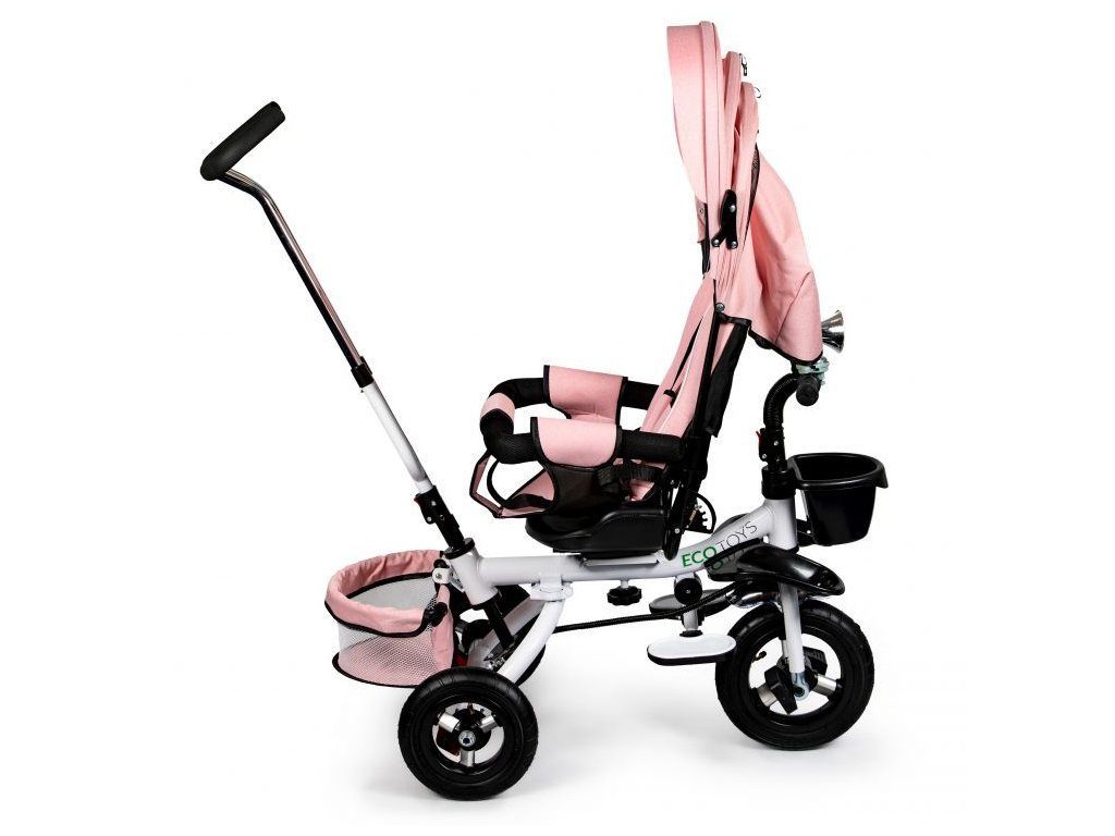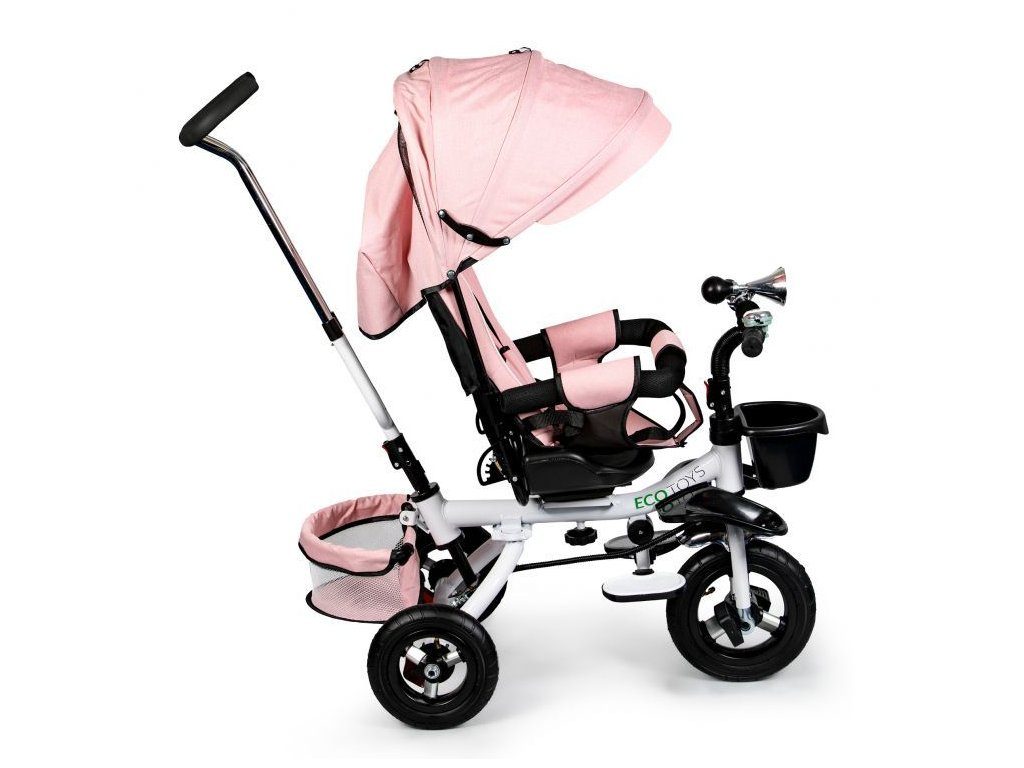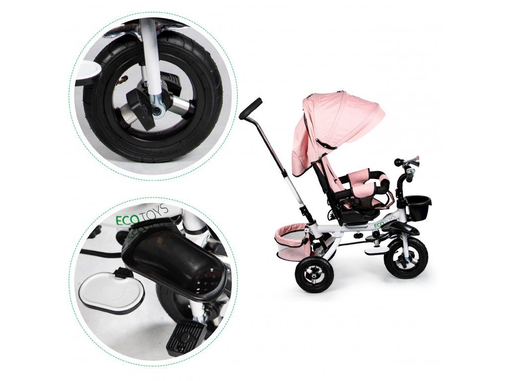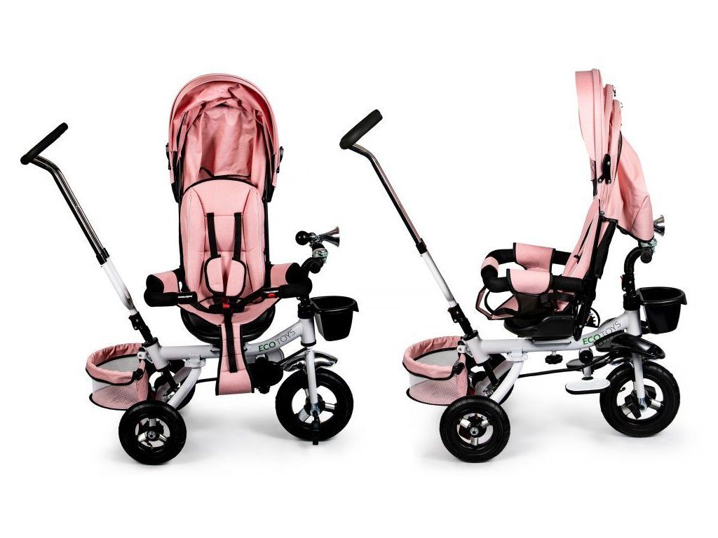 Dětská tříkolka Ecotoys s otočným sedadlem. Je určena pro děti od 1 do 5 let. Vybavena praktickou odnímatelnou stříškou proti slunci a dešti. V zadní části je umístěn velký a v přední menší košna hračky. Pokud dítě nedosáhne na pedály, může si opřít nohy o sklopné stupačky. Tříkolka má robustní ocelovou konstrukci a odolná kola usazená v pevných plastových ráfcích. Madlo a 5bodové bezpečnostní pásy zabraňují vypadnutí dítěte z kočárku. Řídítka mají protiskluzové úchyty a je na nich umístěn efektní zvoneček. Pro větší bezpečnost mohou tříkolku řídit i rodiče pomocí vodící tyče, která je propojena s řídítky. Řídící tyč i stříšku lze odejmout. Sedátko lze otočit o 360° po směru jízdy nebo směrem k rodiči. Jednoduché složení zadních kol usnadní uskladnění a převoz tříkolky.