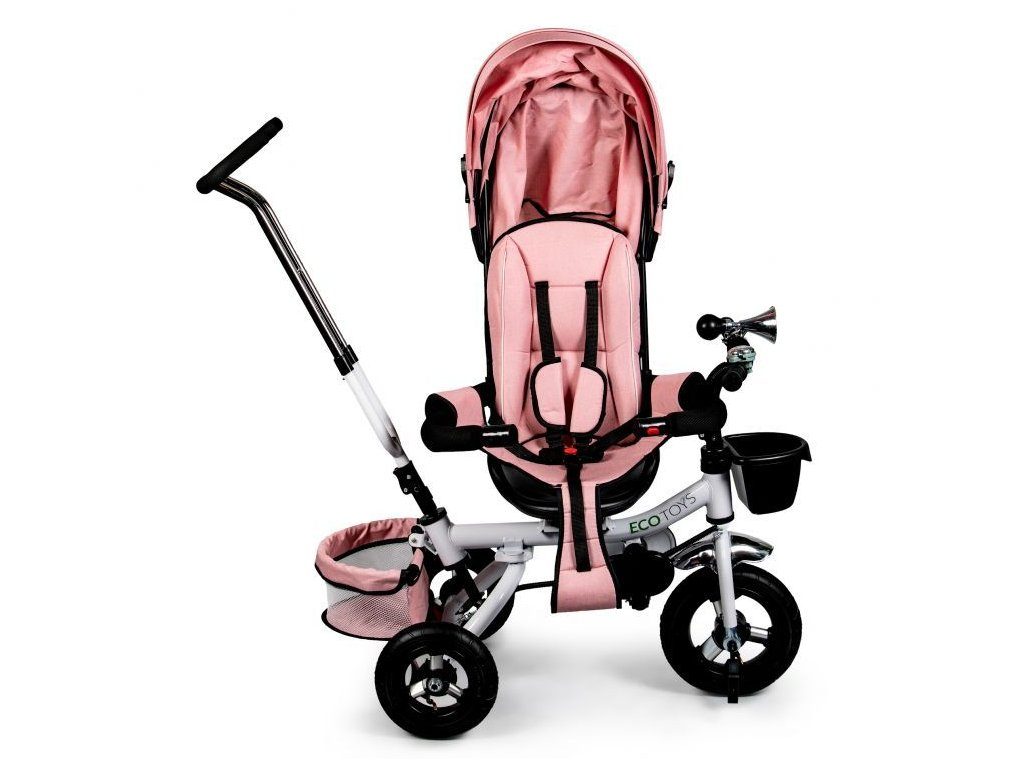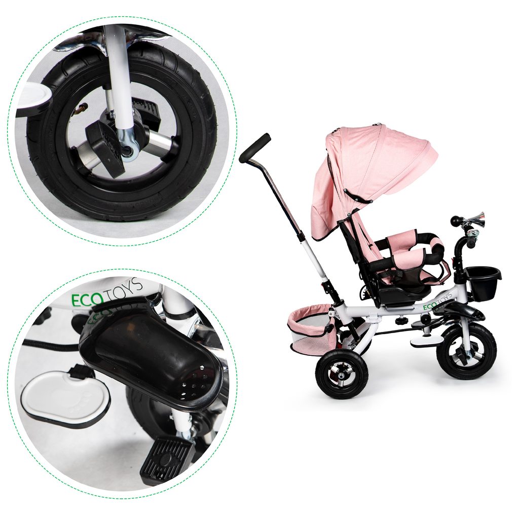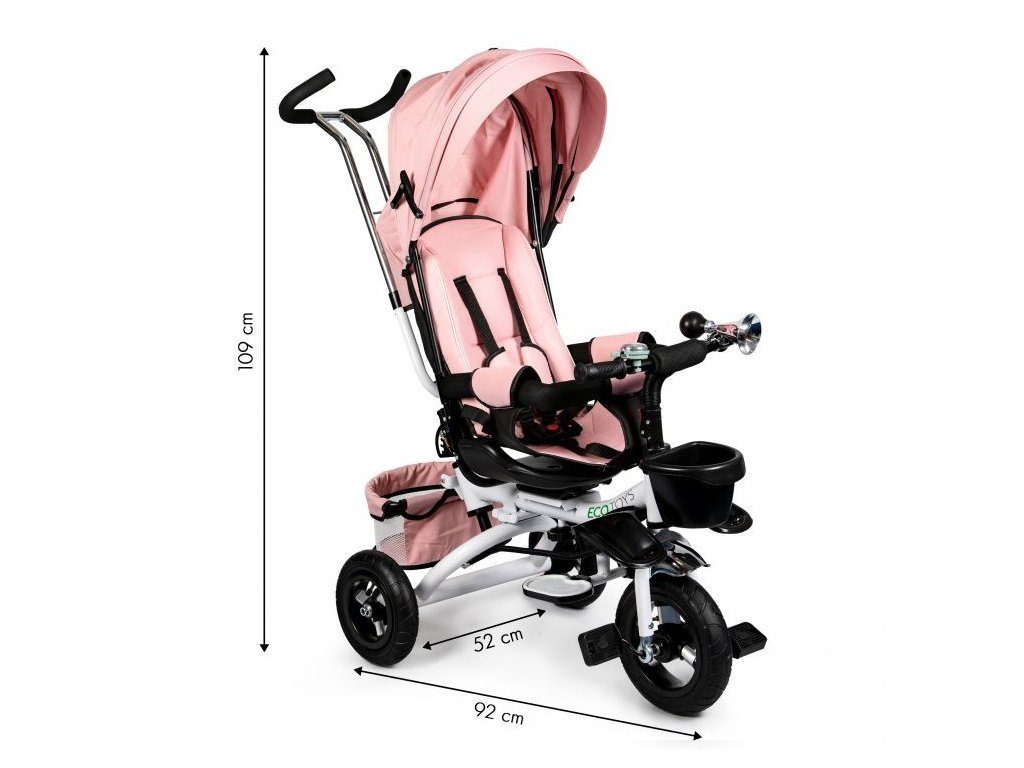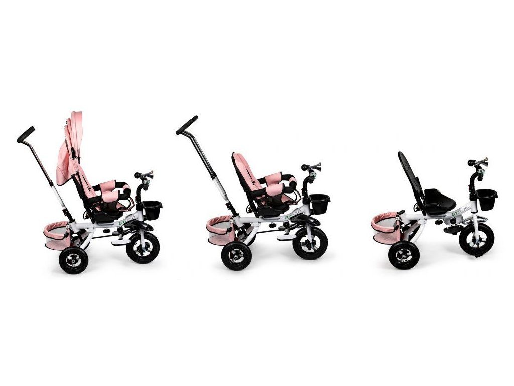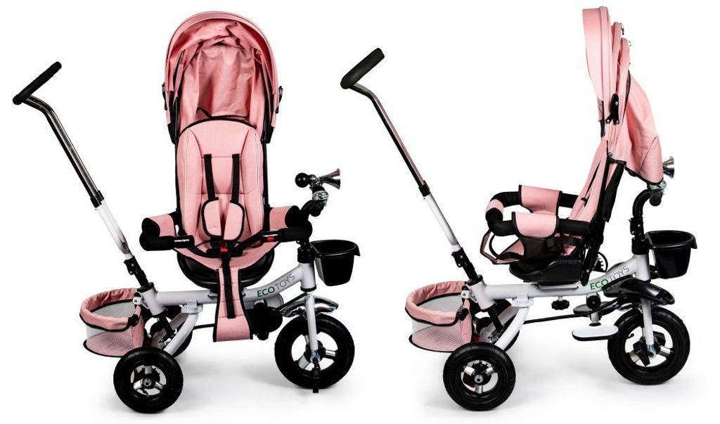 Dětská tříkolka Ecotoys s otočným sedadlem. Je určena pro děti od 1 do 5 let. Vybavena praktickou odnímatelnou stříškou proti slunci a dešti. V zadní části je umístěn velký a v přední menší košna hračky. Pokud dítě nedosáhne na pedály, může si opřít nohy o sklopné stupačky. Tříkolka má robustní ocelovou konstrukci a odolná kola usazená v pevných plastových ráfcích. Madlo a 5bodové bezpečnostní pásy zabraňují vypadnutí dítěte z kočárku. Řídítka mají protiskluzové úchyty a je na nich umístěn efektní zvoneček. Pro větší bezpečnost mohou tříkolku řídit i rodiče pomocí vodící tyče, která je propojena s řídítky. Řídící tyč i stříšku lze odejmout. Sedátko lze otočit o 360° po směru jízdy nebo směrem k rodiči. Jednoduché složení zadních kol usnadní uskladnění a převoz tříkolky.