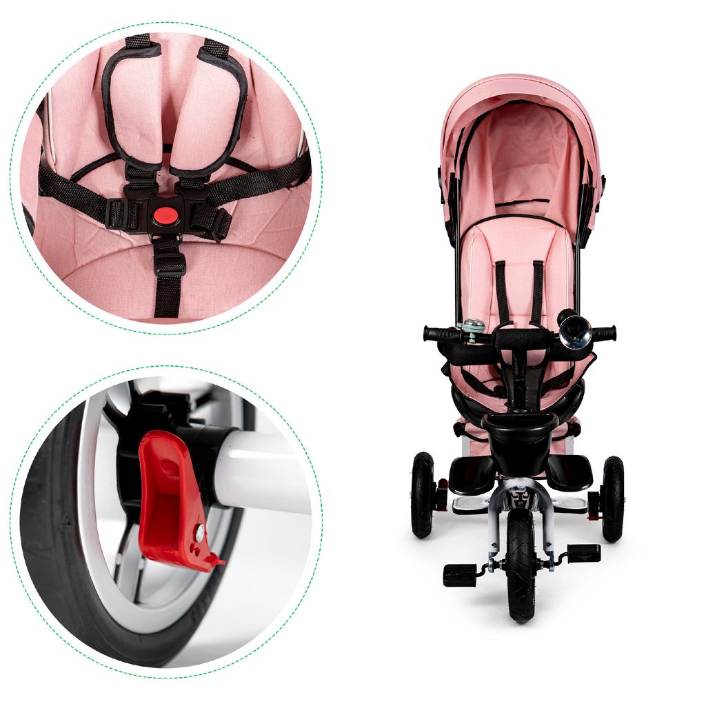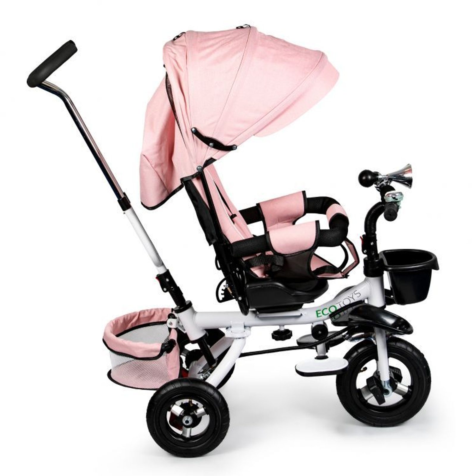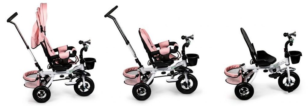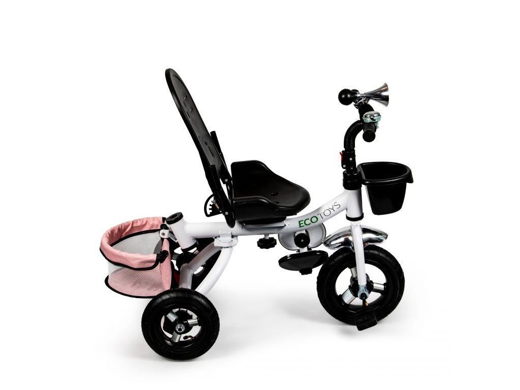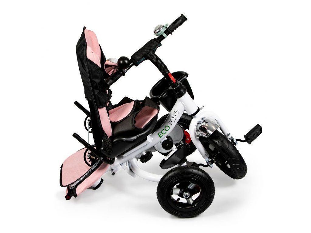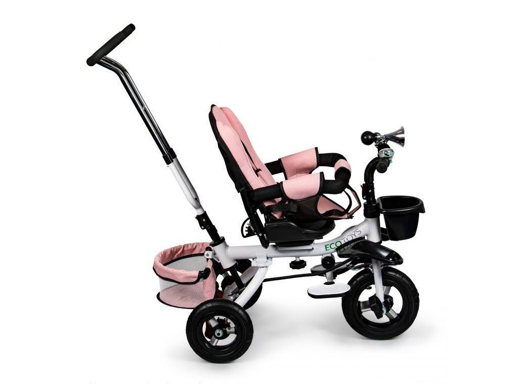 Dětská tříkolka Ecotoys s otočným sedadlem. Je určena pro děti od 1 do 5 let. Vybavena praktickou odnímatelnou stříškou proti slunci a dešti. V zadní části je umístěn velký a v přední menší košna hračky. Pokud dítě nedosáhne na pedály, může si opřít nohy o sklopné stupačky. Tříkolka má robustní ocelovou konstrukci a odolná kola usazená v pevných plastových ráfcích. Madlo a 5bodové bezpečnostní pásy zabraňují vypadnutí dítěte z kočárku. Řídítka mají protiskluzové úchyty a je na nich umístěn efektní zvoneček. Pro větší bezpečnost mohou tříkolku řídit i rodiče pomocí vodící tyče, která je propojena s řídítky. Řídící tyč i stříšku lze odejmout. Sedátko lze otočit o 360° po směru jízdy nebo směrem k rodiči. Jednoduché složení zadních kol usnadní uskladnění a převoz tříkolky.
