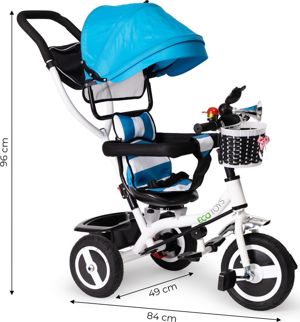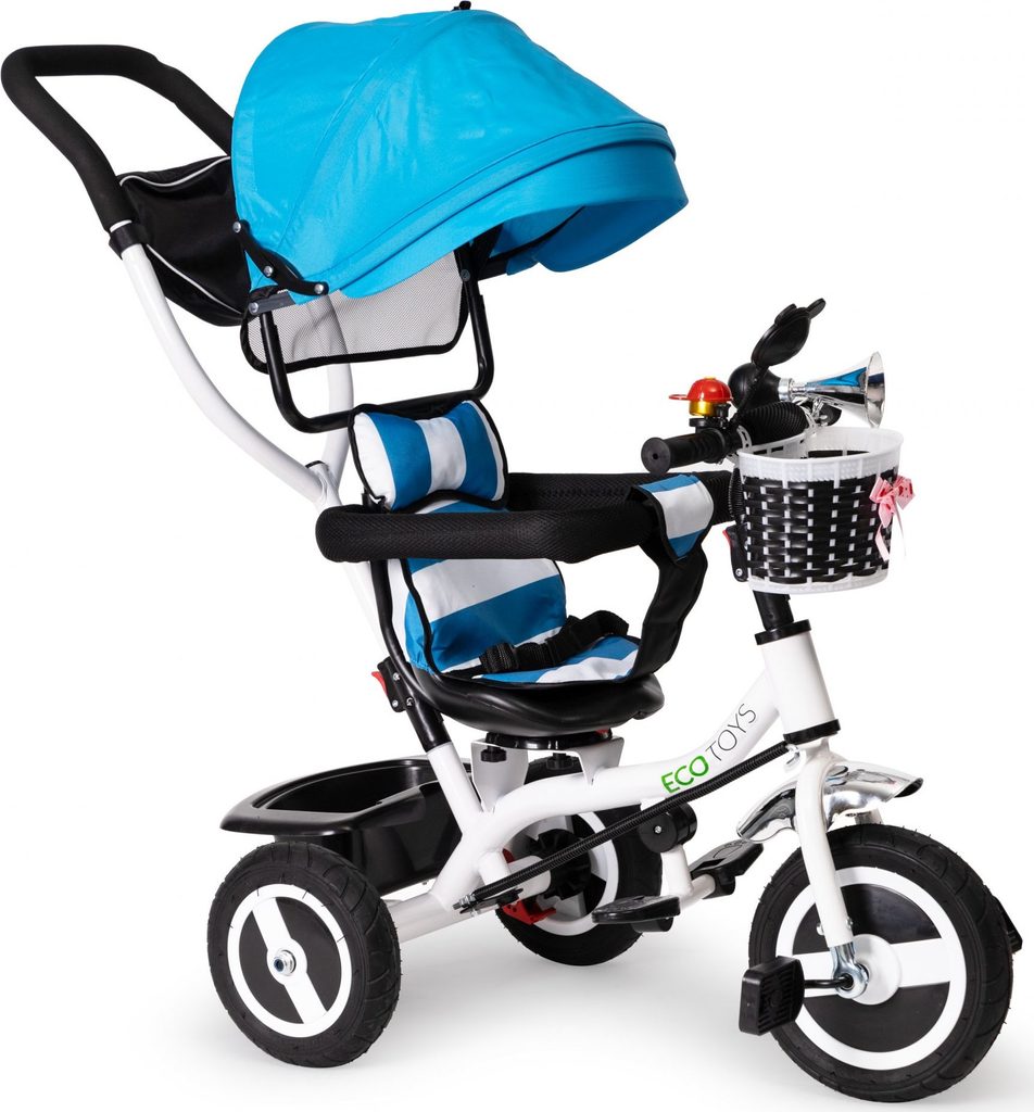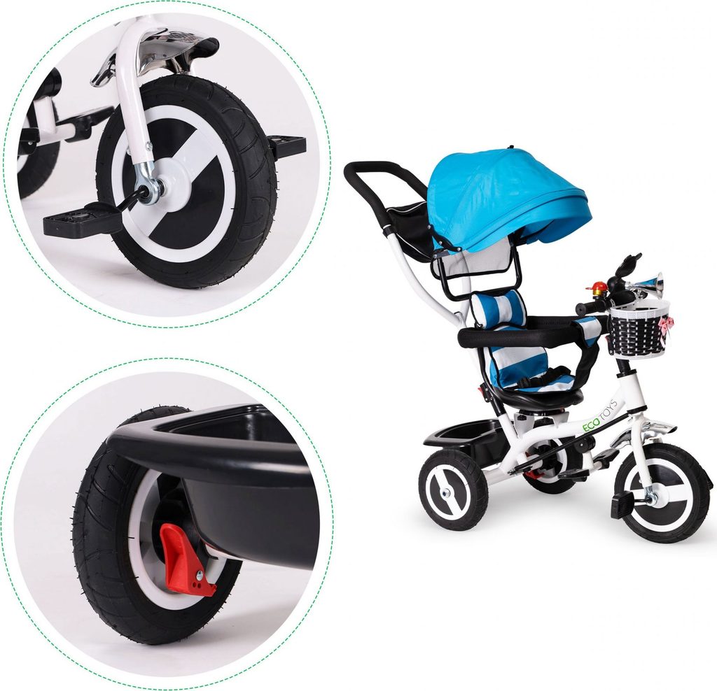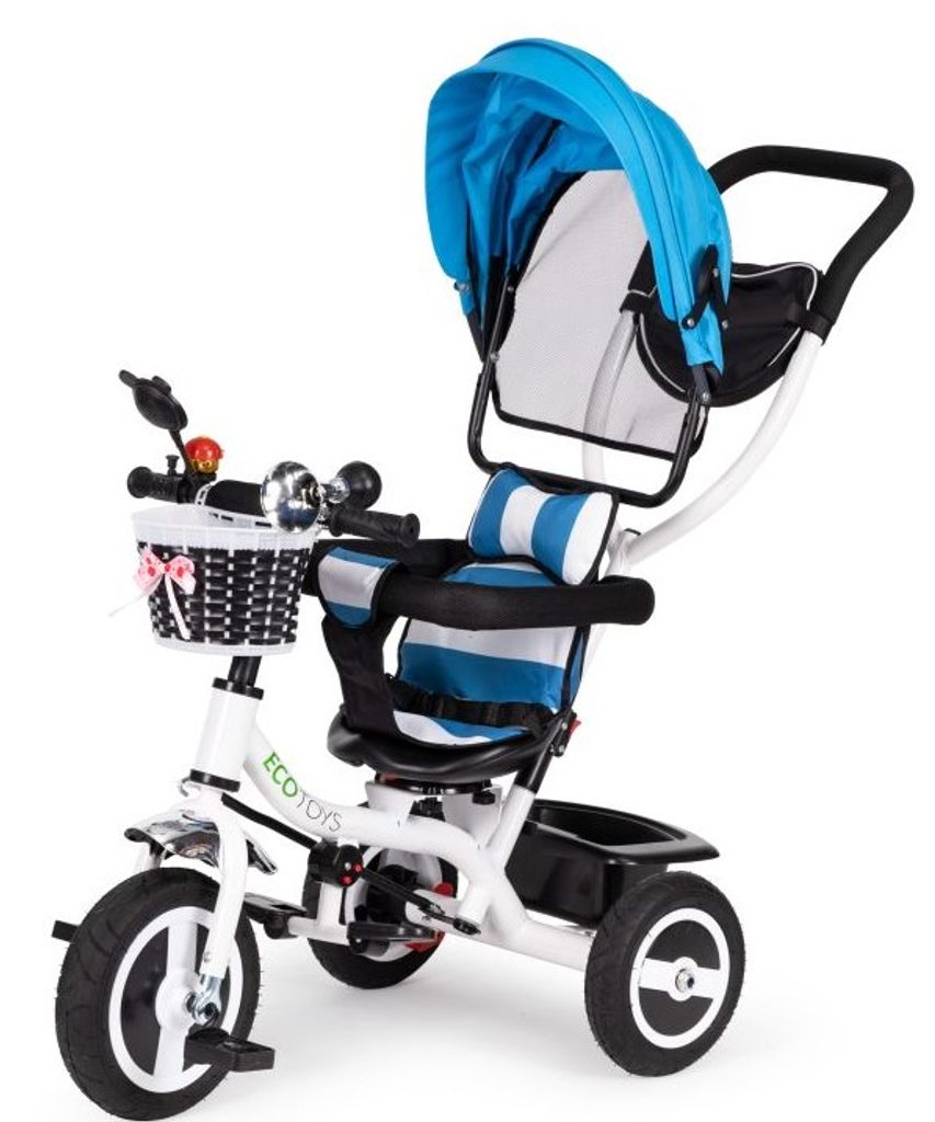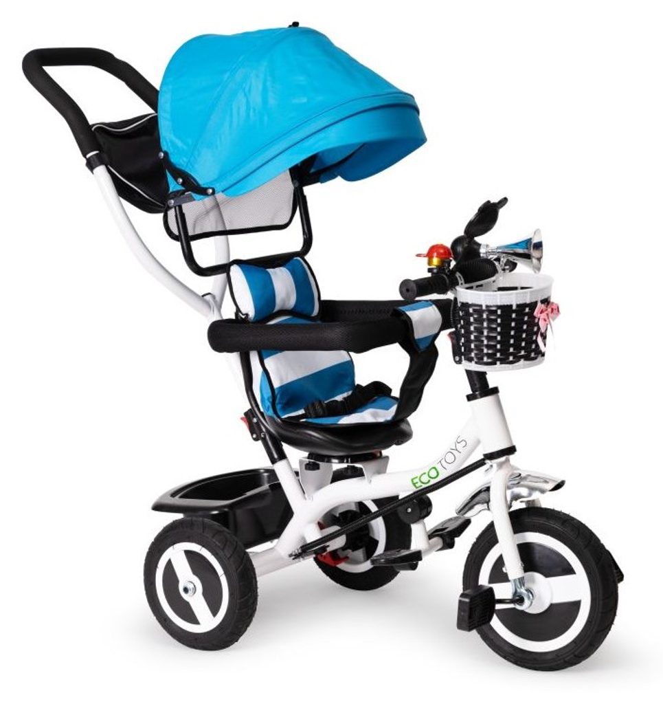 Dětská tříkolka Ecotoys s otočným sedadlem. Je určena pro děti od 1 do 5 let. Vybavena praktickou odnímatelnou stříškou proti slunci a dešti. V zadní části je umístěn velký koš na hračky, v přední části potom menší košík. Tříkolka má pevnou ocelovou konstrukci a odolná kola usazená v pevných plastových ráfcích. Madlo  a bezpečnostní pásy zabraňují vypadnutí dítěte z kočárku. Na řídítkách je zvoneček. Pro větší bezpečnost mohou tříkolku řídit i rodiče a zadní kola mají 2 nezávislé brzdy. Sedadlo lze otočit o 360° a to ve směru jízdy nebo čelem k rodiči a navíc usnadní nastupování nejmladším dětem.