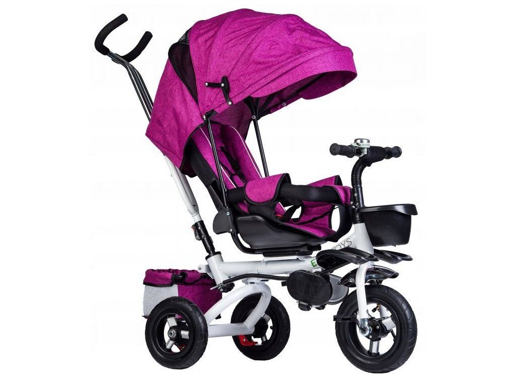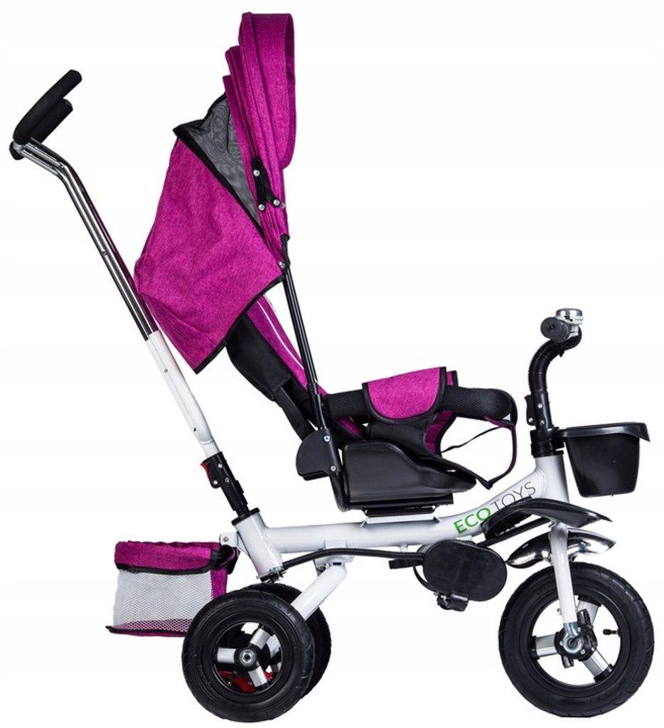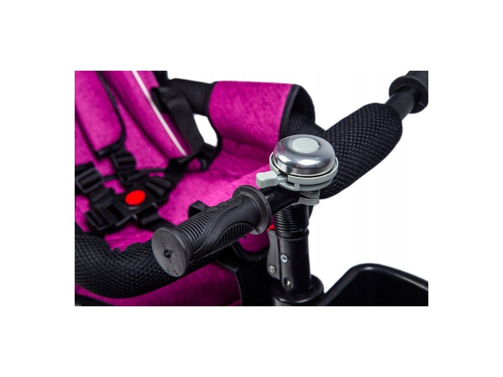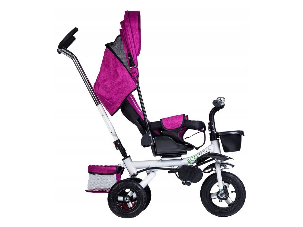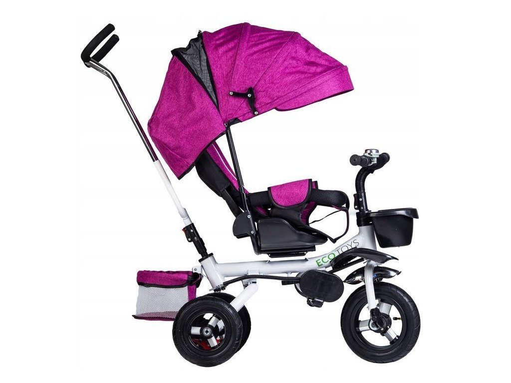 Dětská tříkolka Ecotoys s otočným sedadlem. Je určena pro děti od 1 do 5 let. Vybavena praktickou odnímatelnou stříškou proti slunci a dešti. V zadní části je umístěn velký a v přední menší košna hračky. Pokud dítě nedosáhne na pedály, může si opřít nohy o sklopné stupačky. Tříkolka má robustní ocelovou konstrukci a odolná kola usazená v pevných plastových ráfcích. Madlo a vyměkčené tříbodové bezpečnostní pásy zabraňují vypadnutí dítěte z kočárku. Řídítka mají protiskluzové úchyty a je na nich umístěn efektní zvoneček. Pro větší bezpečnost mohou tříkolku řídit i rodiče pomocí vodící tyče, která je propojena s řídítky. Sedátko lze otočit o 360° po směru jízdy nebo směrem k rodiči.Ecotoys-detska-trikolka-PINK-6