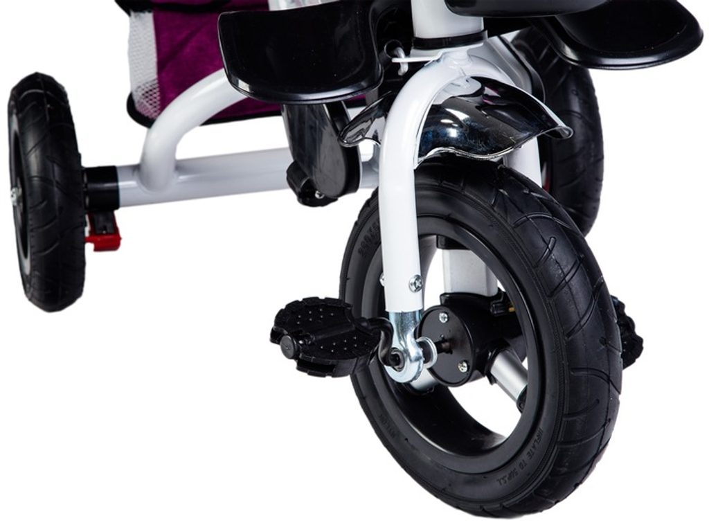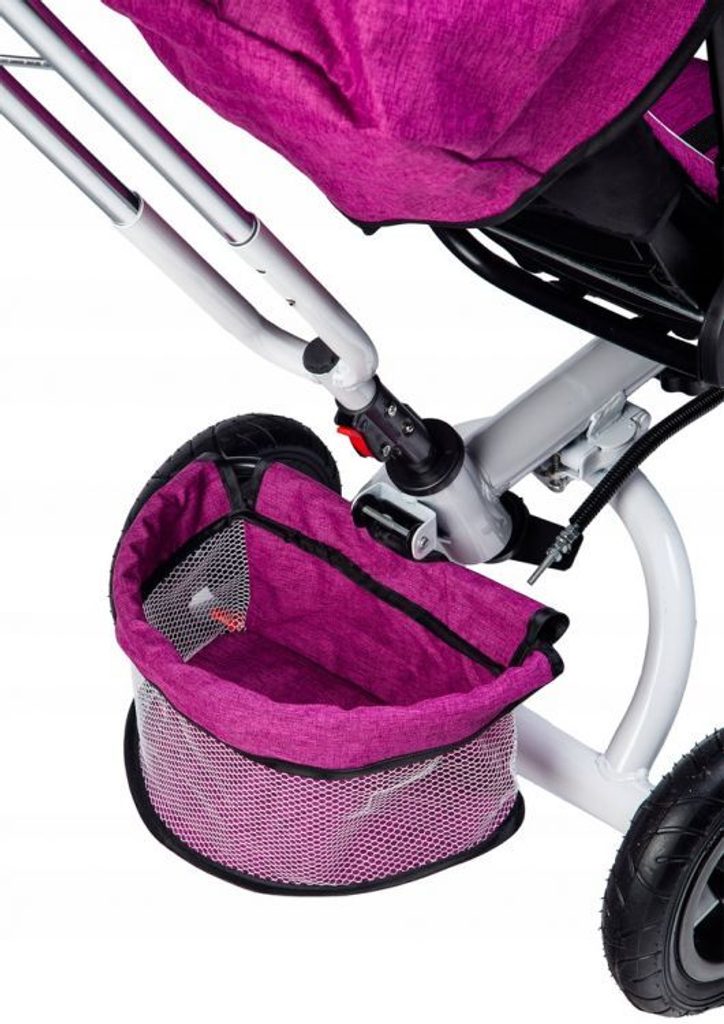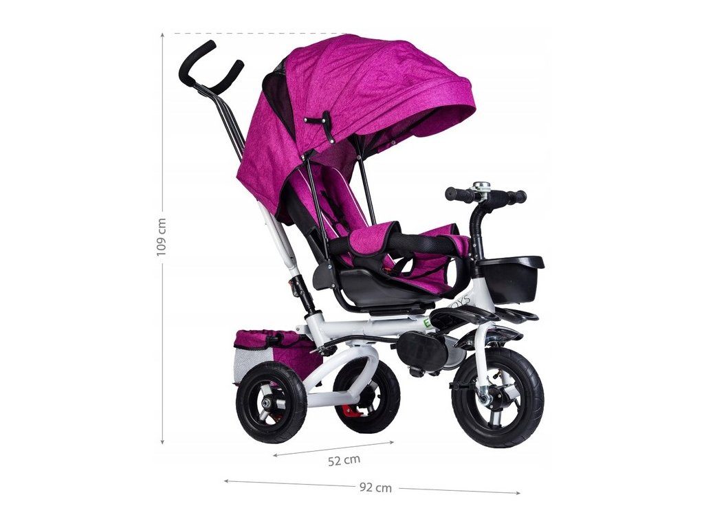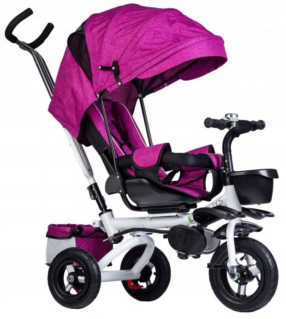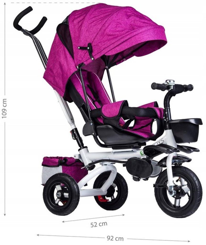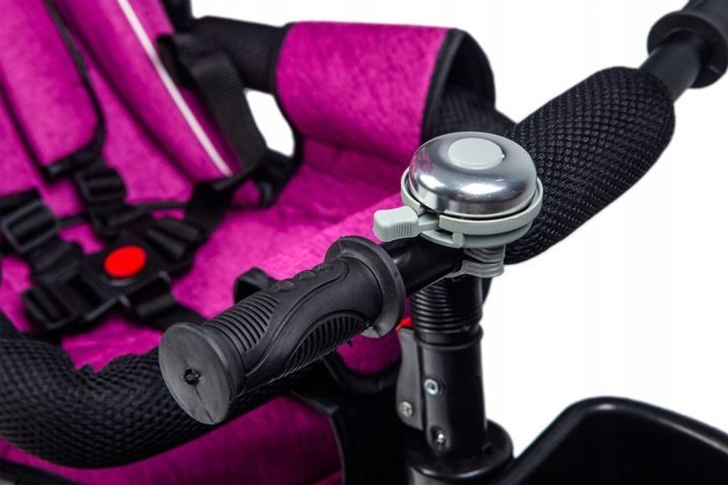 Dětská tříkolka Ecotoys s otočným sedadlem. Je určena pro děti od 1 do 5 let. Vybavena praktickou odnímatelnou stříškou proti slunci a dešti. V zadní části je umístěn velký a v přední menší košna hračky. Pokud dítě nedosáhne na pedály, může si opřít nohy o sklopné stupačky. Tříkolka má robustní ocelovou konstrukci a odolná kola usazená v pevných plastových ráfcích. Madlo a vyměkčené tříbodové bezpečnostní pásy zabraňují vypadnutí dítěte z kočárku. Řídítka mají protiskluzové úchyty a je na nich umístěn efektní zvoneček. Pro větší bezpečnost mohou tříkolku řídit i rodiče pomocí vodící tyče, která je propojena s řídítky. Sedátko lze otočit o 360° po směru jízdy nebo směrem k rodiči.Ecotoys-detska-trikolka-PINK-6