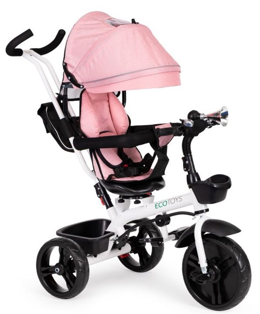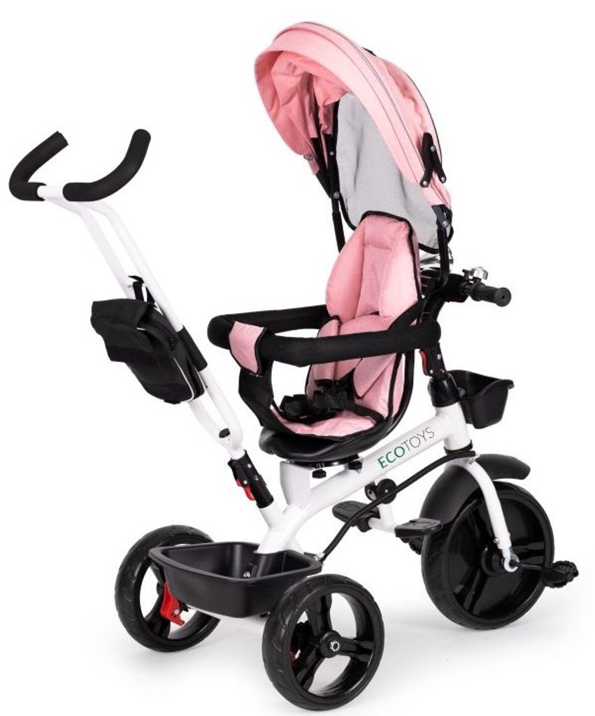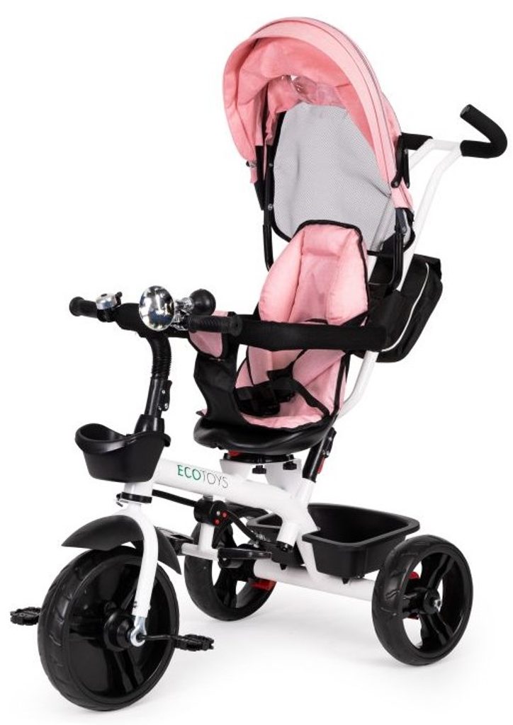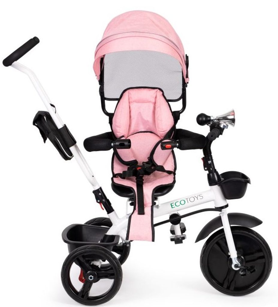 Dětská tříkolka Ecotoys S-Trike s otočným sedadlem je určena pro děti od 1 do 5 let. Vybavena praktickou odnímatelnou stříškou proti slunci a dešti. V zadní části je umístěn velký koš na hračky, v přední části potom menší košík. Tříkolka má pevnou ocelovou konstrukci a odolná EVA kola usazená v pevných plastových ráfcích. Madlo a pětibodové bezpečnostní pásy zabraňují vypadnutí dítěte z kočárku. Na řídítkách je umístěný klakson a zvoneček. Pro větší bezpečnost mohou tříkolku řídit i rodiče a zadní kola mají 2 nezávislé brzdy. Sedadlo lze otočit o 360° a to ve směru jízdy nebo čelem k rodiči a navíc usnadní nastupování nejmladším dětem.