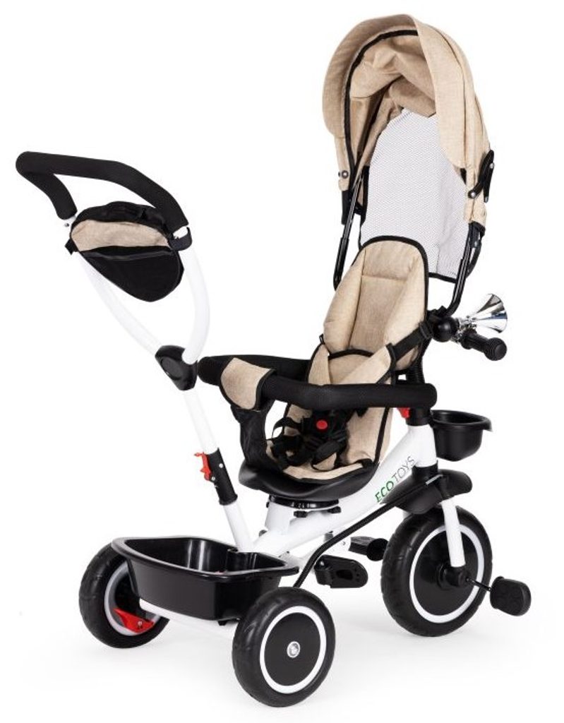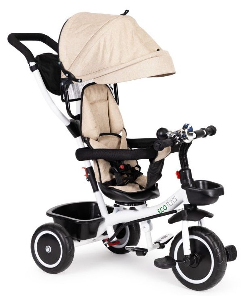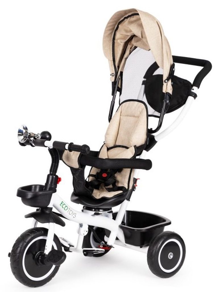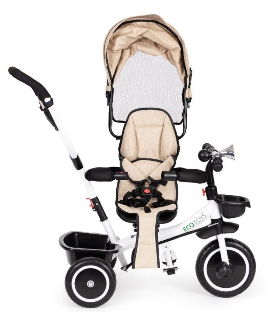 Dětská tříkolka Ecotoys S360 s otočným sedadlem je určena pro děti od 1 do 5 let. Vybavena praktickou odnímatelnou stříškou proti slunci a dešti. V zadní části je umístěn velký koš na hračky, v přední části potom menší košík. Tříkolka má pevnou ocelovou konstrukci a odolná EVA kola usazená v pevných plastových ráfcích. Madlo a 5 bodové bezpečnostní pásy zabraňují vypadnutí dítěte z kočárku. Na řídítkách je umístěný klakson. Pro větší bezpečnost mohou tříkolku řídit i rodiče a zadní kola mají 2 nezávislé brzdy. Sedadlo lze otočit o 360° a to ve směru jízdy nebo čelem k rodiči a navíc usnadní nastupování nejmladším dětem.