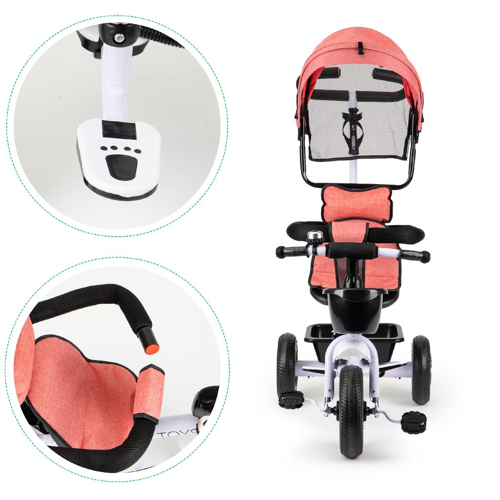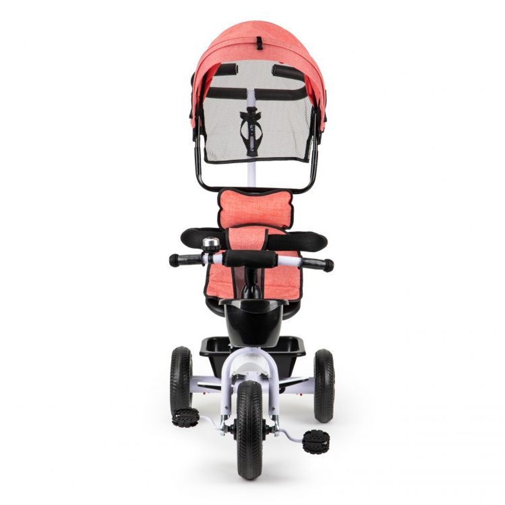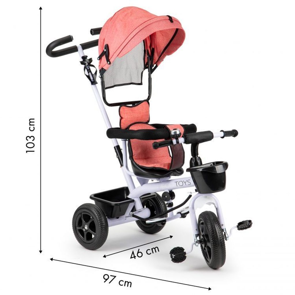 Dětská tříkolka Ecotoys Basic je určena pro děti od 1 do 5 let. Je vybavena praktickou odnímatelnou stříškou proti slunci a dešti. V zadní části je umístěn velký koš na hračky, v přední části potom menší košík. Tříkolka má pevnou ocelovou konstrukci a odolná EVA kola usazená v pevných plastových ráfcích. Madlo zabraňuje vypadnutí dítěte. Na řídítkách je umístěný zvoneček. Součástí je vodící tyč s držákem na pití pomocí které mohou tříkolku řídit i rodiče.