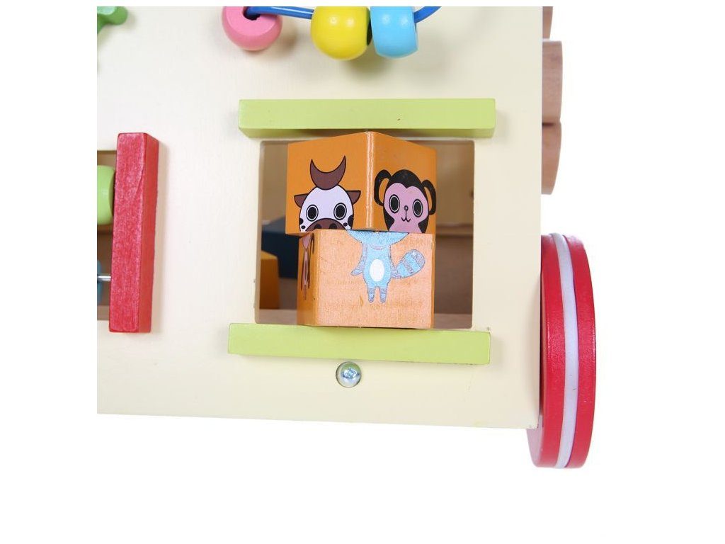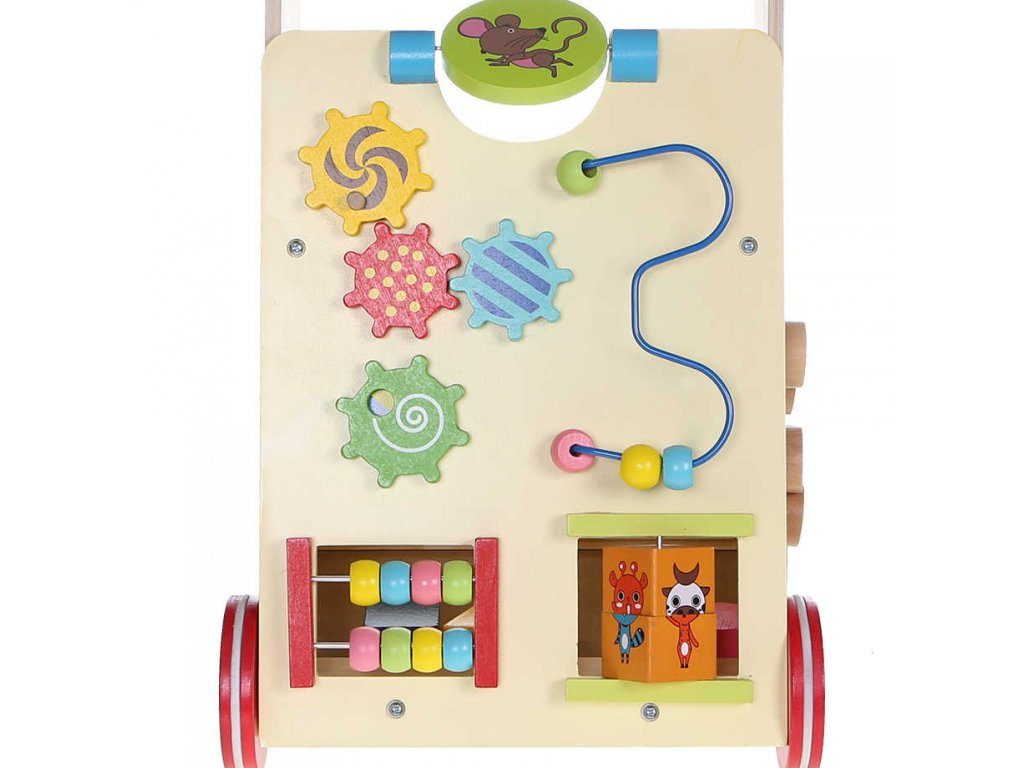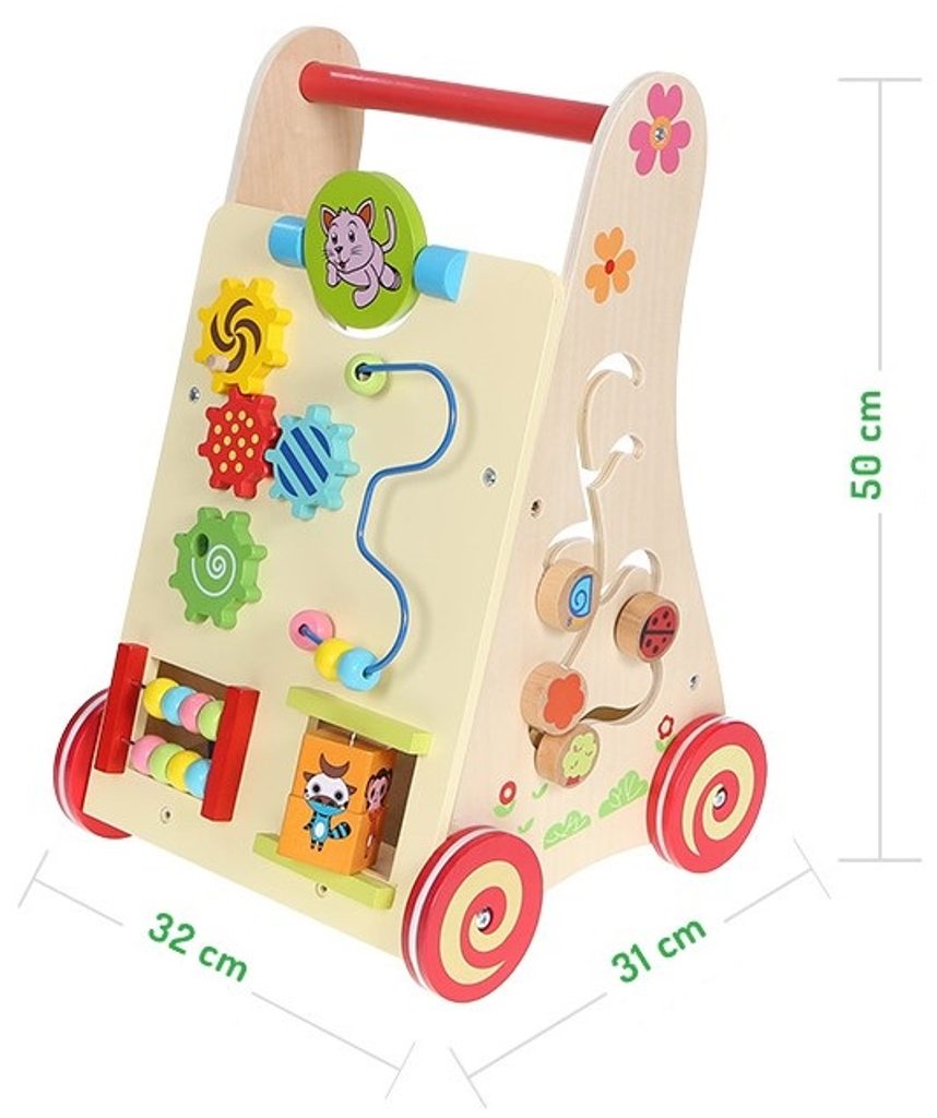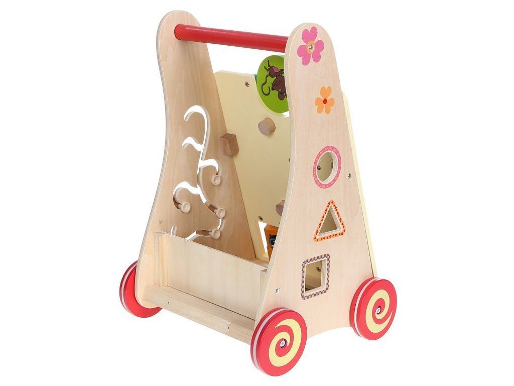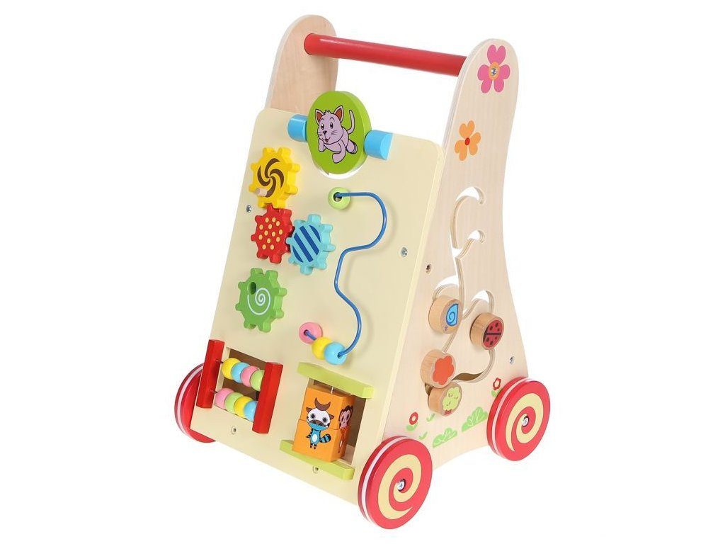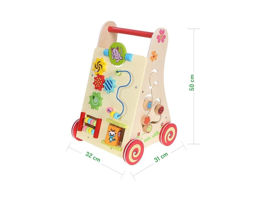 Dětská dřevěné chodítko Ecotoys je ideální hračkou pro děti již od prvních krůčků. Je vyrobeno ze dřeva v nejvyšší kvalitě tak, že nemá žádné ostré hrany a je pro dítě absolutně bezpečné. Obsahuje spoustu zábavných a barevných prvků jako jsou různé pohyblivé předměty, barevné korálky, labyrint a další.Slouží také jako úložný prostot pro hračky a dítě je tak může mít vždy po ruce. Kolečka chodítka jsou vyrobeny z protiskluzového materiálu, který nepoškrábe podlahu.
