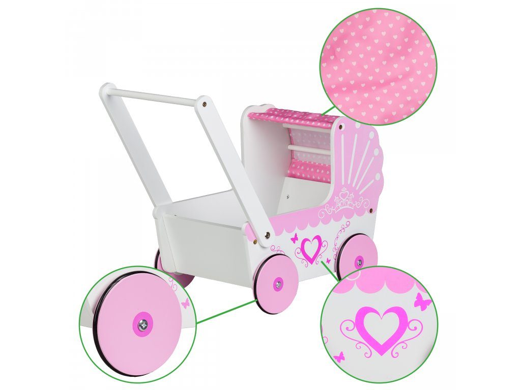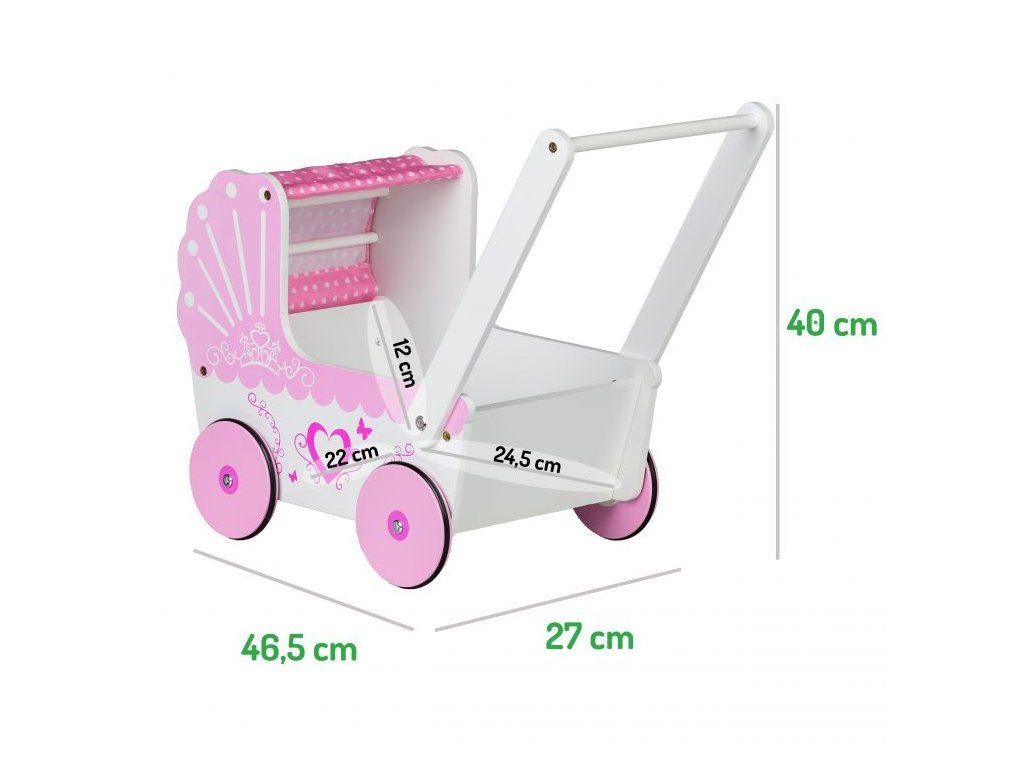 Dětské dřevěné chodítko Ecotoys ve tvaru kočárku pro panenky je ideální hračkou pro děti již od 12 měsíců věku. Pro menší děti slouží jako chodítko kdy rukojeť je v takové výšce, že dítěti umožňuje vozíček tlačit a zároveň udržovat rovnováhu. Pro větší děti slouží jako kočárek pro panenku nebo v něm může vozit hračky. Kolečka mají protiskluzovou úpravu, proto je kočárek vhodný pro hru doma i venku. Přední roletka se dá odejmout. Vše je vyrobeno ze dřeva v nejvyšší kvalitě tak, že vozítko nemá žádné ostré hrany a je pro dítě absolutně bezpečné.