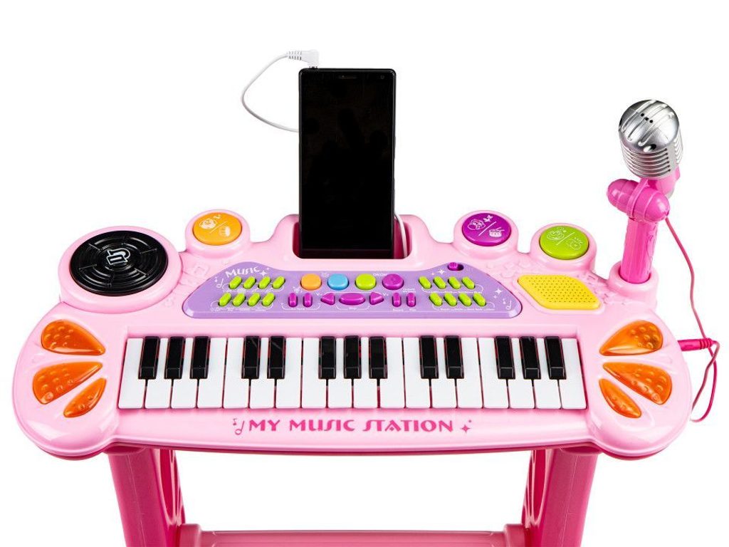 Multifunkční dětské klávesy s mikrofonem jsou vybaveny 31 klávesami a dalšími funkčními tlačítky. Dítě může využít 8 zvukových nástrojů nebo další 4 bicí. Klávesy lze také propojit s mobilním telefonem nebo MP3 přehrávačem. Hudební styly jako je disco, blues, rock lze přepínáním měnit. V sestavě je také mikrofon s možností vlastního karaoke a praktická židlička. Hru doprovázejí blikající světýlka. Hračka je určena pro děti od 3 let věku.