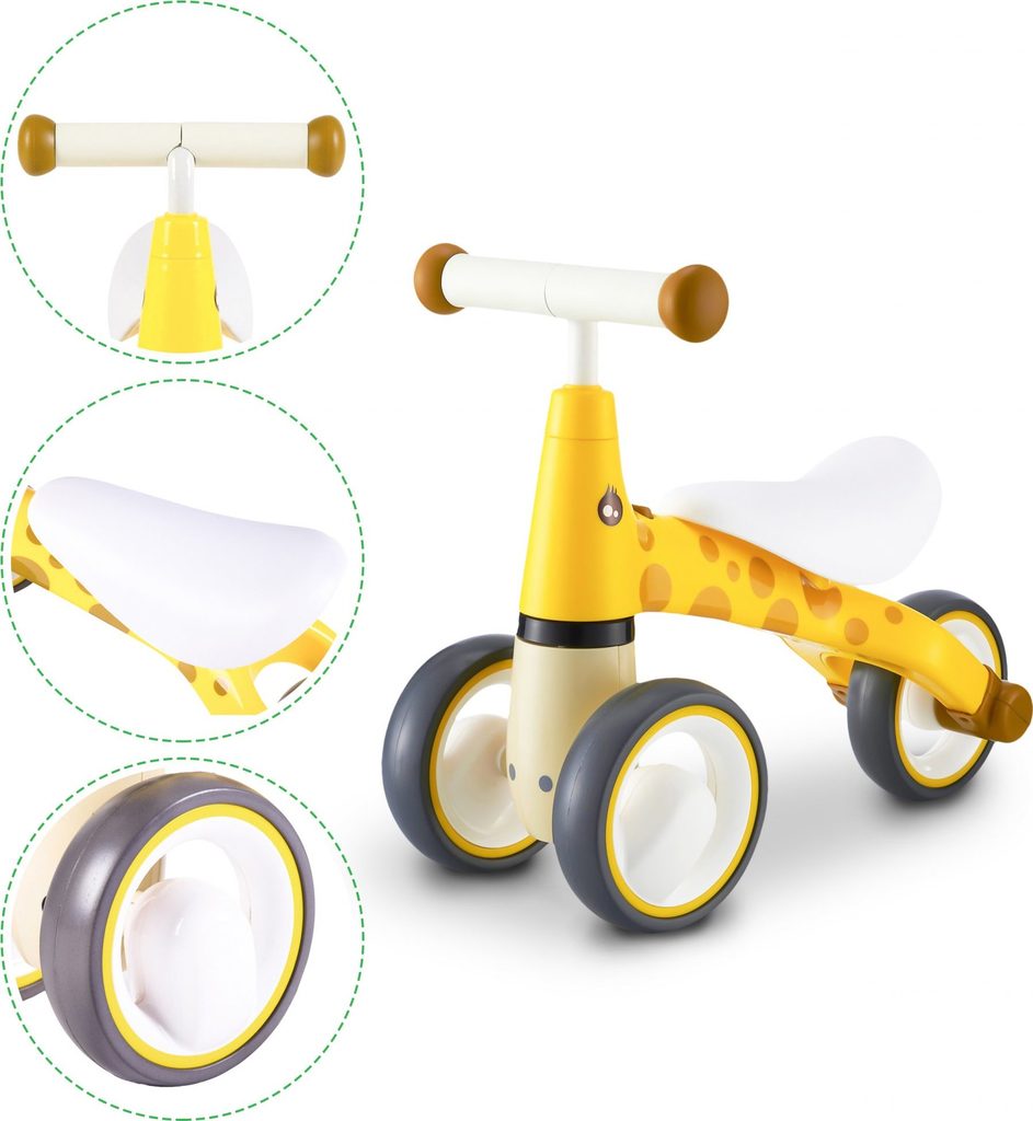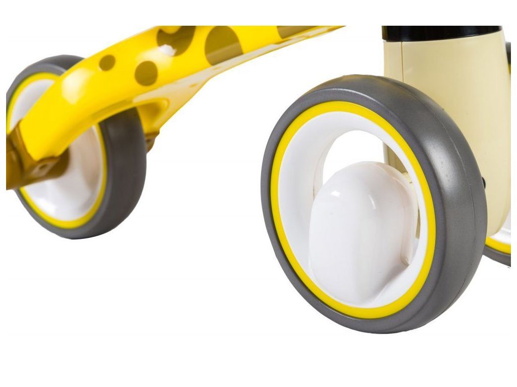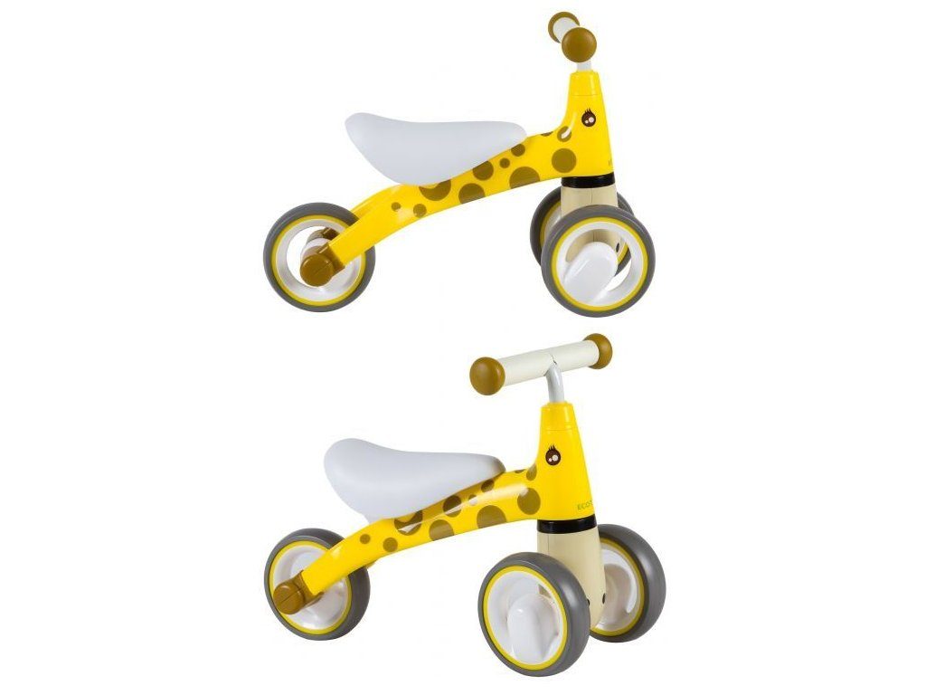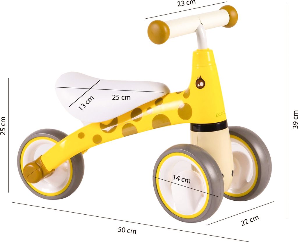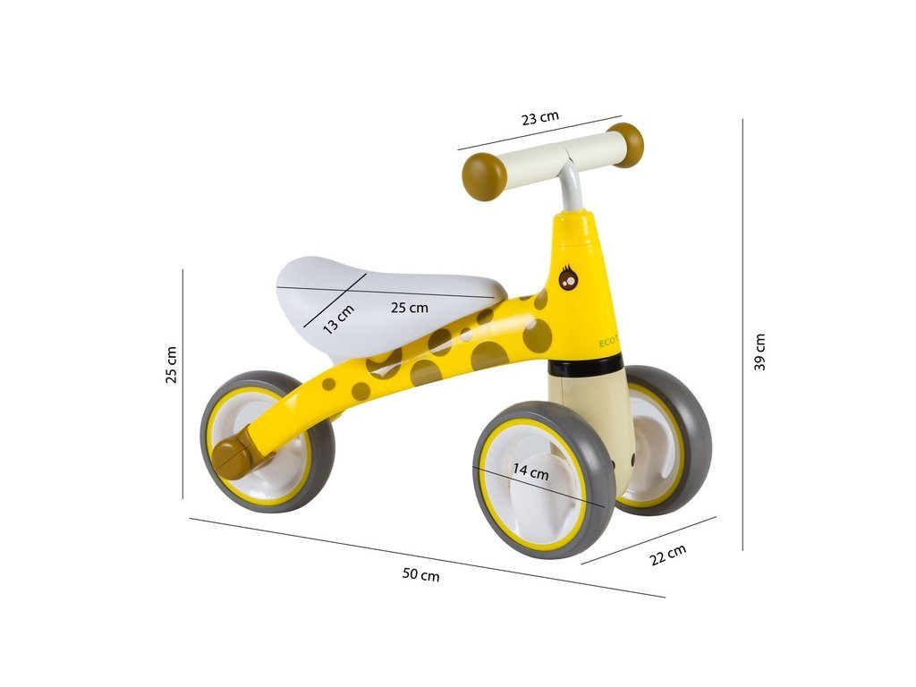 Dětské odrážedlo Ecotoys Žirafa pomáhá dítěti koordinovat pohyb a udržovat rovnováhu. Konstrukce odrážedla je z lehkého ale zároveň z pevného plastu. Sedátko je velmi pohodlné a vytvarované pro co nejpříjemnější sezení. Řídítka jsou vyrobena z příjemného protiskluzového materiálu. Kolečka nezanechávají šmouhy na podlaze, odrážedlo je tak vhodné i do vnitřních prostor. Stabilitu odrážedla zajištují přední dvojitá kola. Určeno pro děti od 1 roku věku.