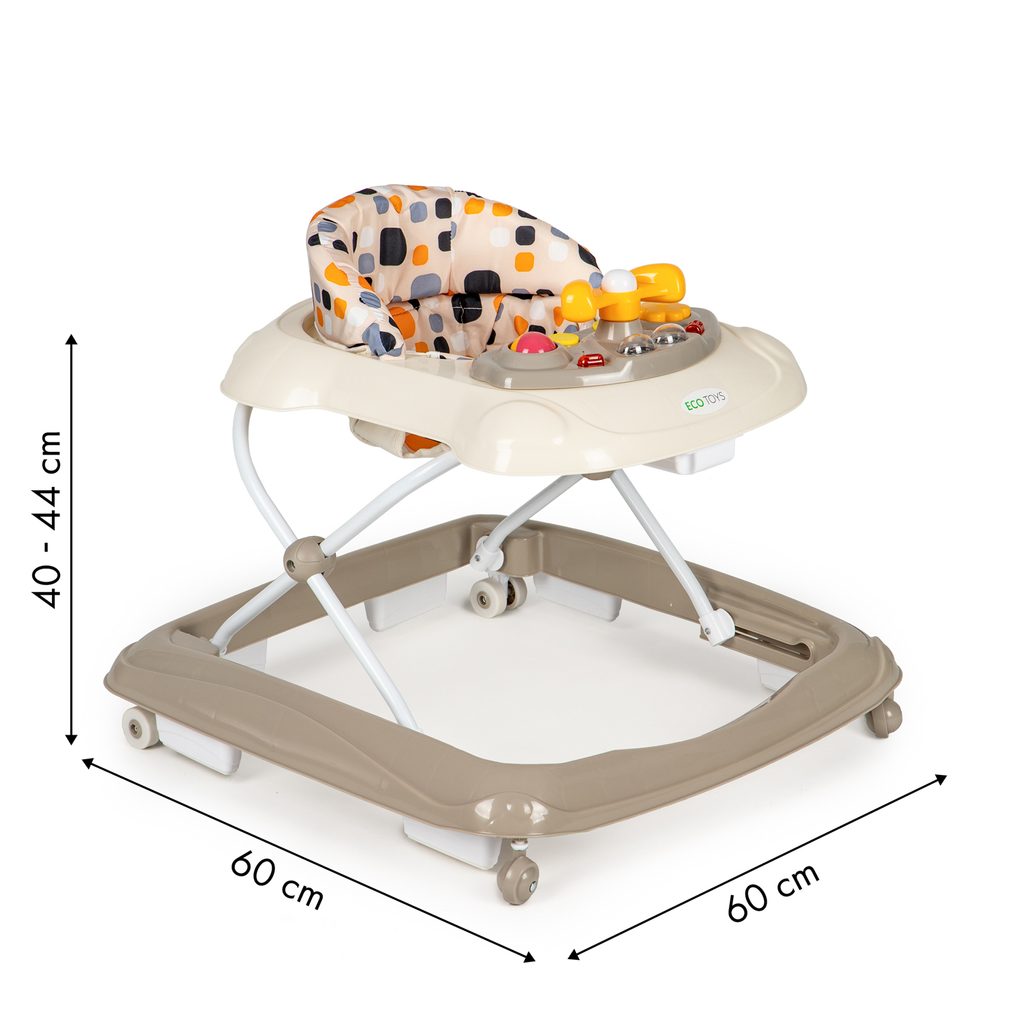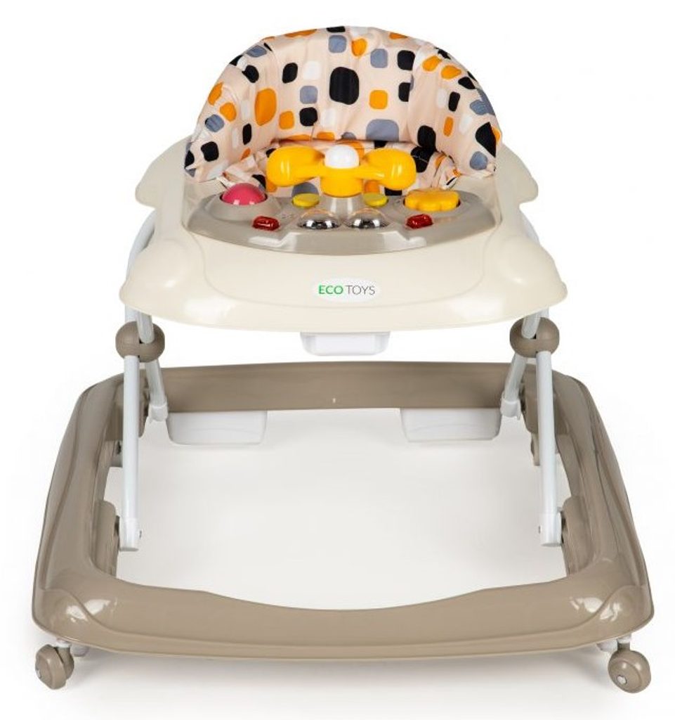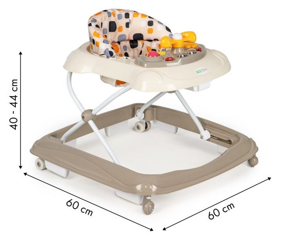 Dětské chodítko Ecotoys s interaktivním světelným panelem je určeno pro děti od 6 měsíců věku. Výšku chodítka lze nastavit v závislosti na výšce dítěte. Je opatřeno 4 kolečky kdy přední jsou otočná a zadní pevná, silikonová sloužící jako blokace proti nechtěnému pohybu. Potah sedátka lze sejmou a prát v pračce. Na spodní straně je umístěn stabilizační rám zabraňující převrácení. Kolečka chodítka jsou vyrobeny z protiskluzového materiálu, který nepoškrábe podlahu. Splňuje veškeré normy které jsou vyžadovány pro dětské chodítka.