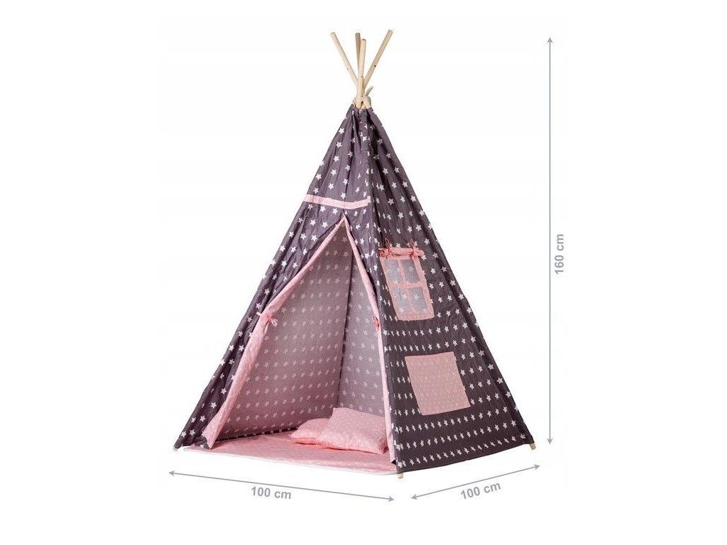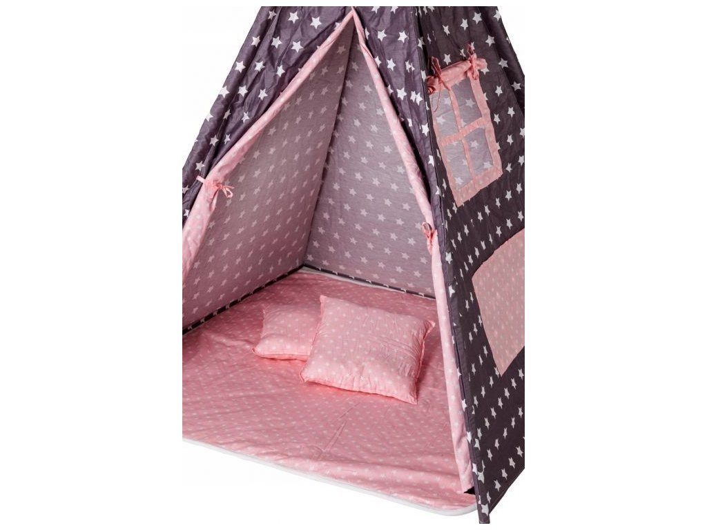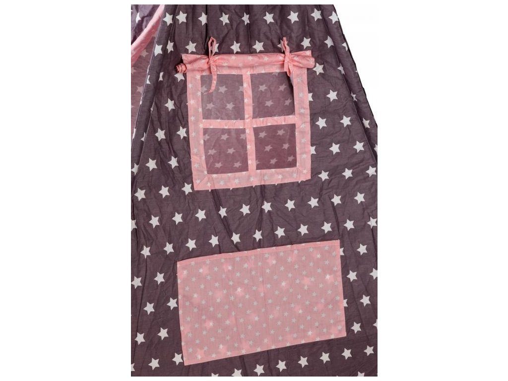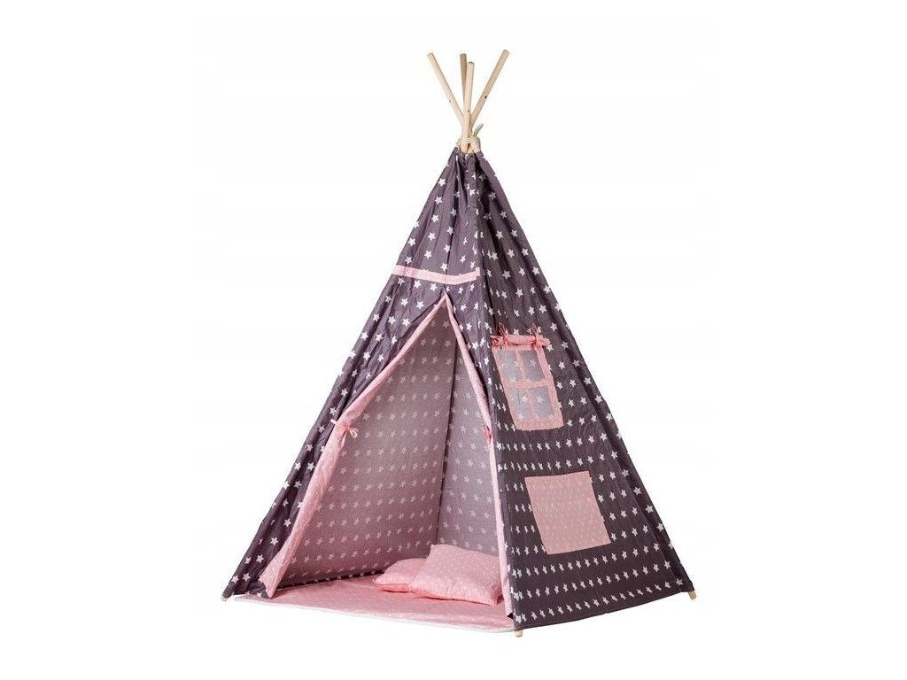 Ecotoys dětský indiánský stan TeePee v provedení s malými hvězdičkami. Je vhodný jak do vnitřních prostor tak i pro venkovní použití. Vchod do stanu je rolovací, můžete tak nastavit množství světla, které bude pronikat dovnitř stanu. Konstrukce stanu je dřevěná, svrchní materiál je bavlna. Montáž stanu je velmi a snadná a rychlá, což oceníte zejména při jeho přemist'ování. Na boční straně je umístěno praktické okýnko. Součásti balení je měkká bavlněná podložka a 2 polštářky, kreé lze prát v pračce. Pro uložení hraček slouží praktická kapsa všitá do jedné z bočních stěn stanu.