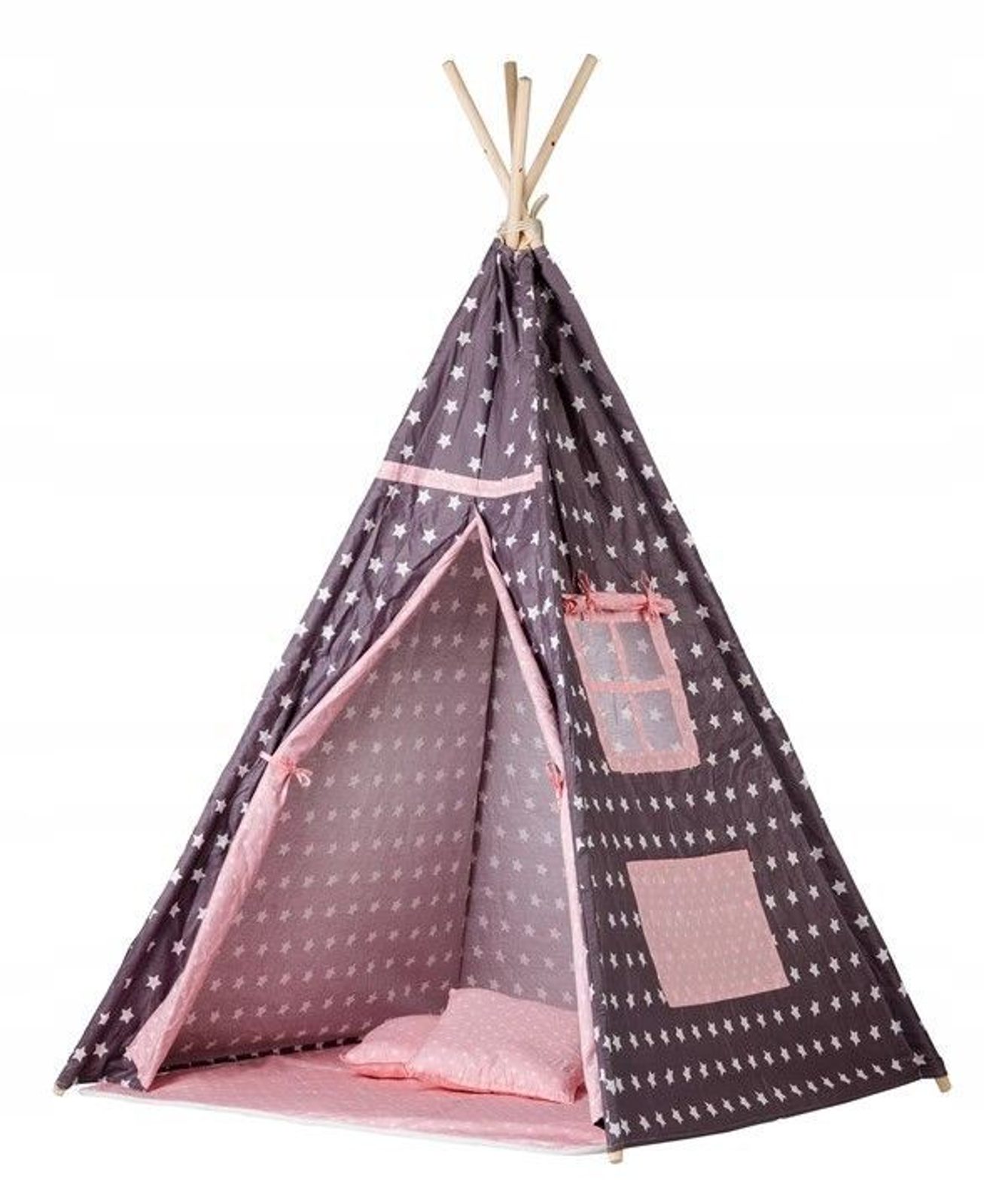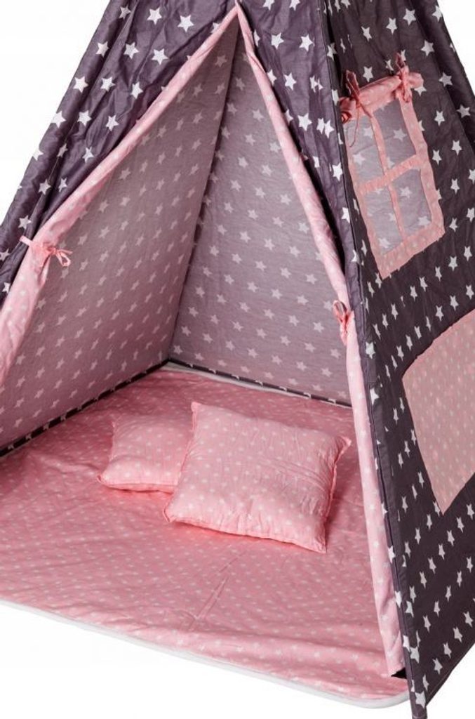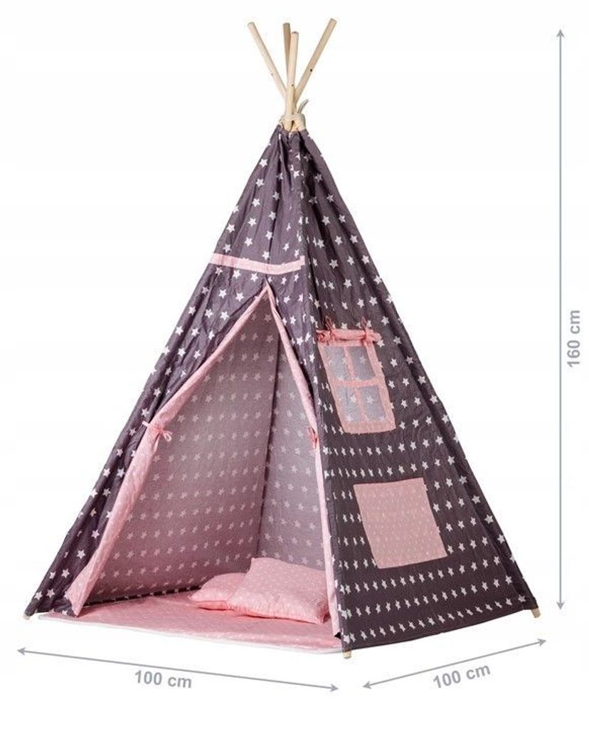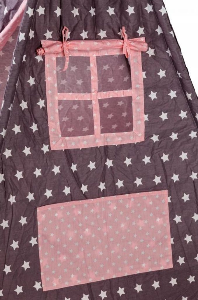 Ecotoys dětský indiánský stan TeePee v provedení s malými hvězdičkami. Je vhodný jak do vnitřních prostor tak i pro venkovní použití. Vchod do stanu je rolovací, můžete tak nastavit množství světla, které bude pronikat dovnitř stanu. Konstrukce stanu je dřevěná, svrchní materiál je bavlna. Montáž stanu je velmi a snadná a rychlá, což oceníte zejména při jeho přemist'ování. Na boční straně je umístěno praktické okýnko. Součásti balení je měkká bavlněná podložka a 2 polštářky, kreé lze prát v pračce. Pro uložení hraček slouží praktická kapsa všitá do jedné z bočních stěn stanu.