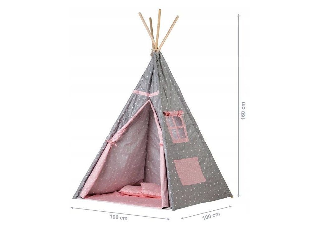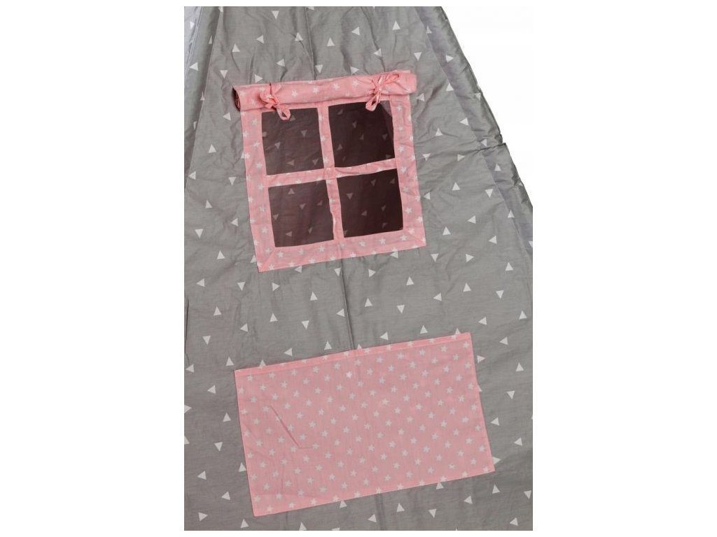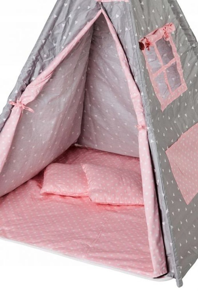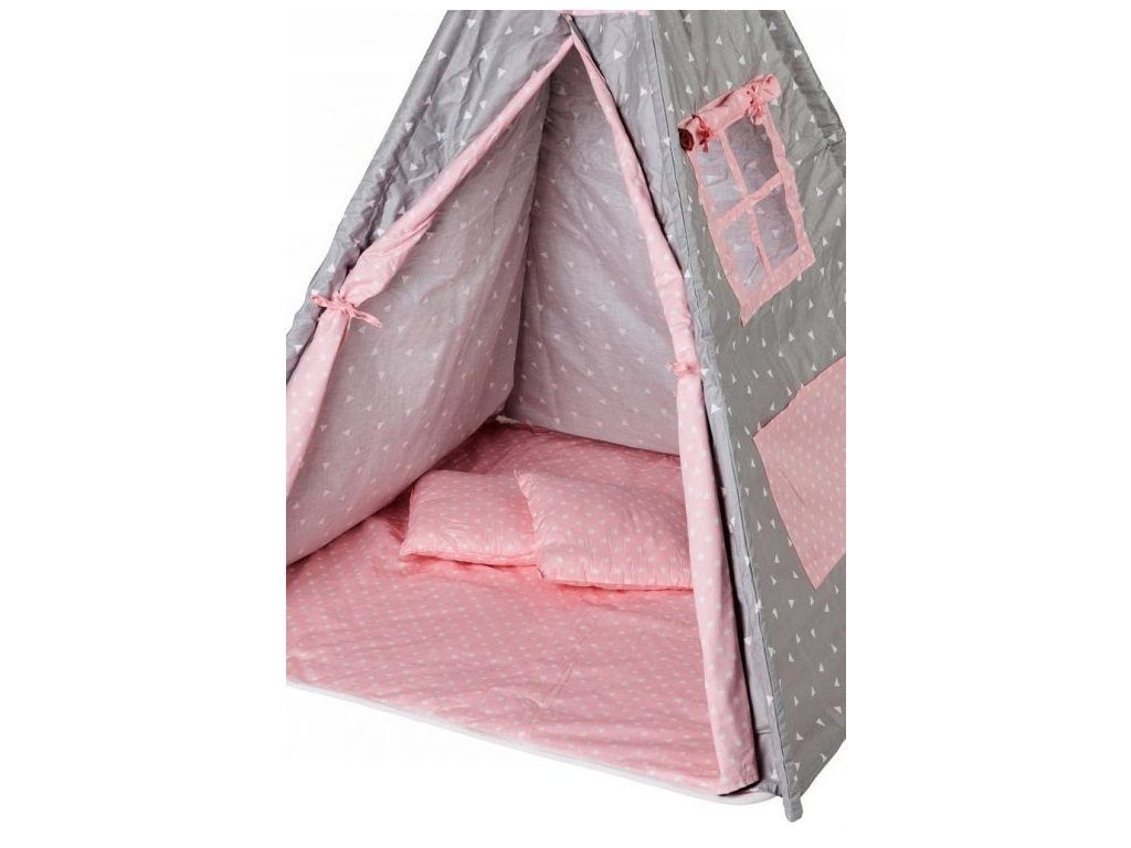 Ecotoys dětský indiánský stan TeePee v provedení s malými trojúhelníčky. Je vhodný jak do vnitřních prostor tak i pro venkovní použití. Vchod do stanu je rolovací, můžete tak nastavit množství světla, které bude pronikat dovnitř stanu. Konstrukce stanu je dřevěná, svrchní materiál je bavlna. Montáž stanu je velmi a snadná a rychlá, což oceníte zejména při jeho přemist'ování. Na boční straně je umístěno praktické okýnko. Součásti balení je měkká bavlněná podložka a 2 polštářky, kreé lze prát v pračce. Pro uložení hraček slouží praktická kapsa všitá do jedné z bočních stěn stanu.