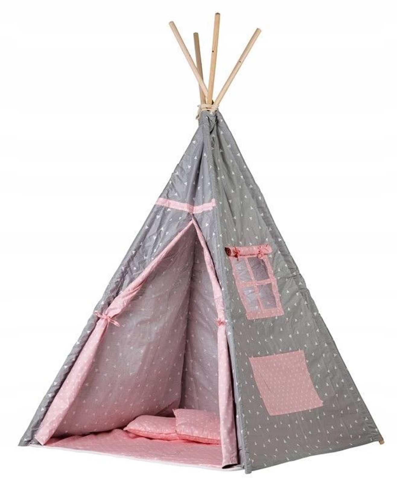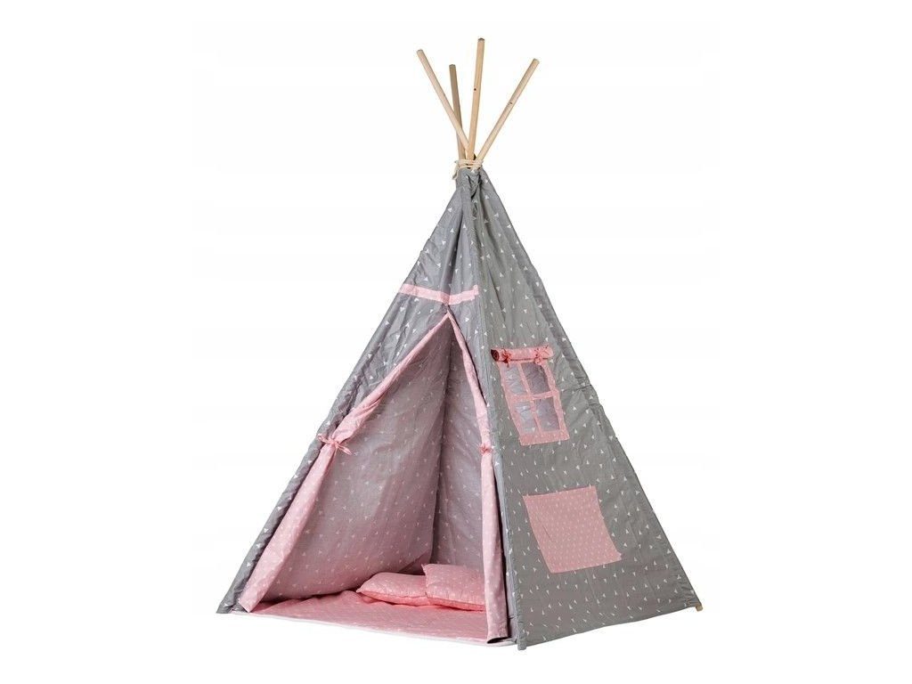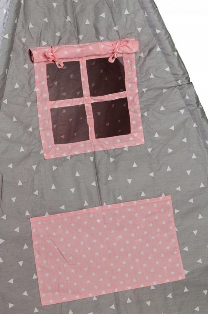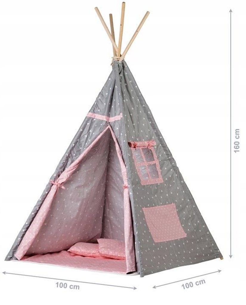 Ecotoys dětský indiánský stan TeePee v provedení s malými trojúhelníčky. Je vhodný jak do vnitřních prostor tak i pro venkovní použití. Vchod do stanu je rolovací, můžete tak nastavit množství světla, které bude pronikat dovnitř stanu. Konstrukce stanu je dřevěná, svrchní materiál je bavlna. Montáž stanu je velmi a snadná a rychlá, což oceníte zejména při jeho přemist'ování. Na boční straně je umístěno praktické okýnko. Součásti balení je měkká bavlněná podložka a 2 polštářky, kreé lze prát v pračce. Pro uložení hraček slouží praktická kapsa všitá do jedné z bočních stěn stanu.