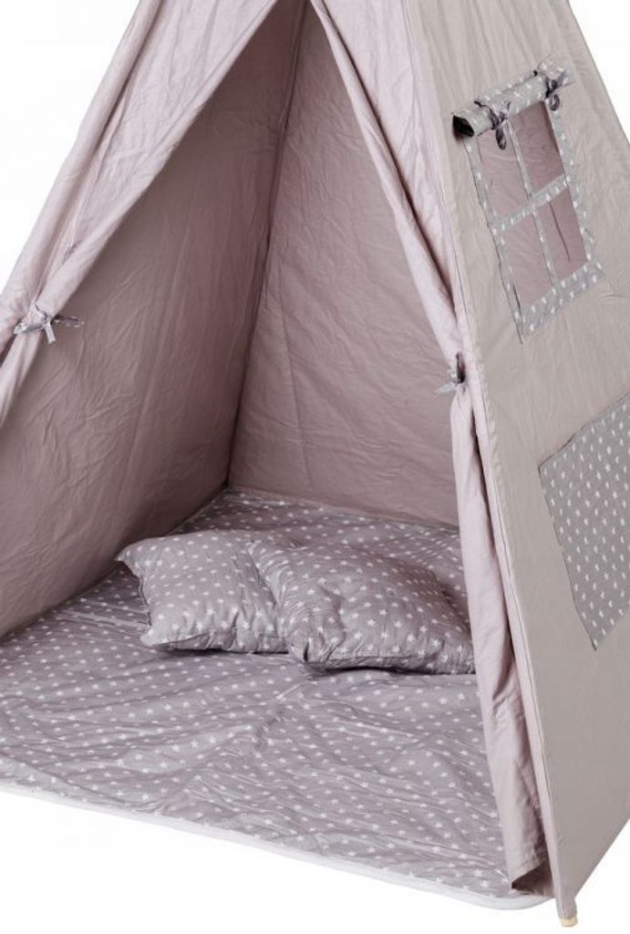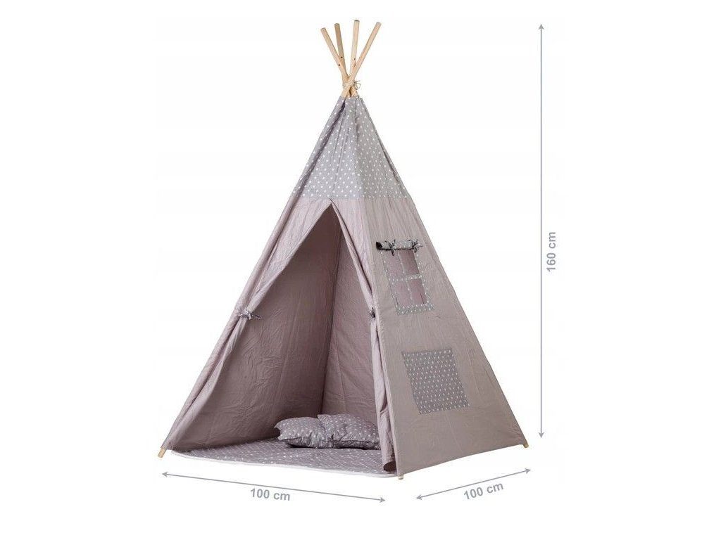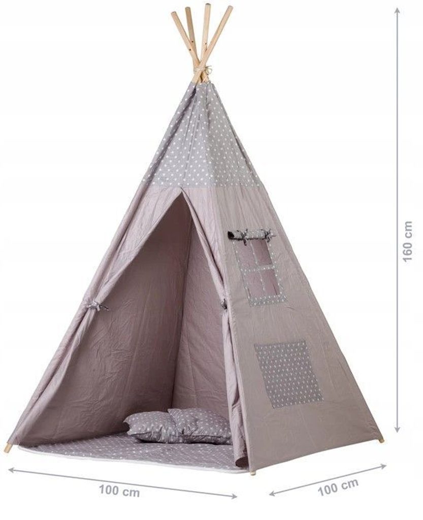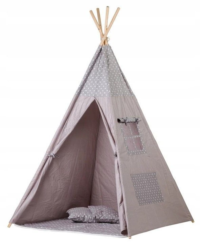 Ecotoys dětský indiánský stan TeePee v provedení s malými hvězdičkami. Je vhodný jak do vnitřních prostor tak i pro venkovní použití. Vchod do stanu je rolovací, můžete tak nastavit množství světla, které bude pronikat dovnitř stanu. Konstrukce stanu je dřevěná, svrchní materiál je bavlna. Montáž stanu je velmi a snadná a rychlá, což oceníte zejména při jeho přemist'ování. Na boční straně je umístěno praktické okýnko. Součásti balení je měkká bavlněná podložka a 2 polštářky, kreé lze prát v pračce. Pro uložení hraček slouží praktická kapsa všitá do jedné z bočních stěn stanu.